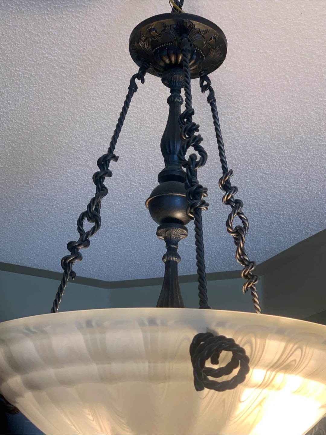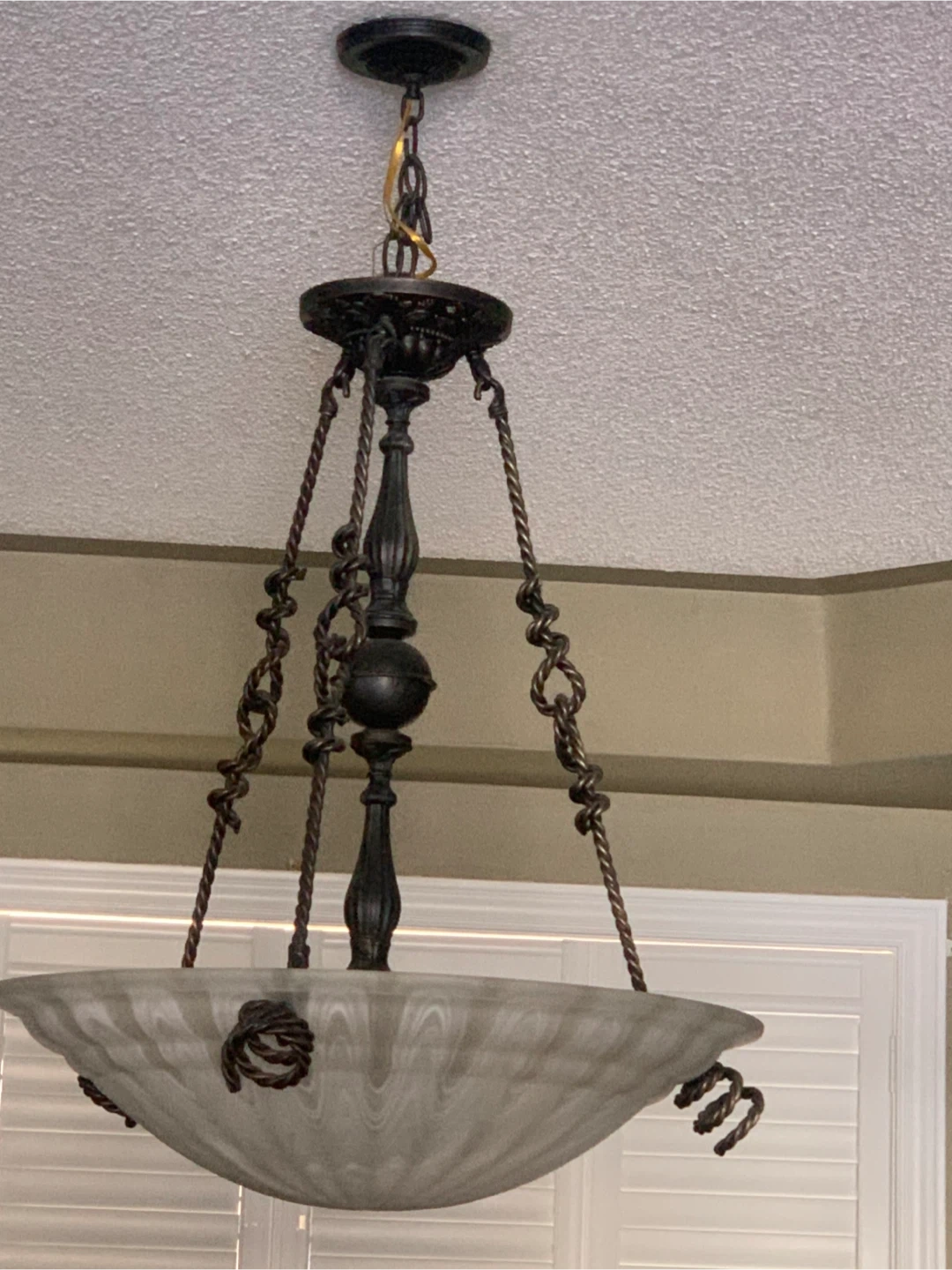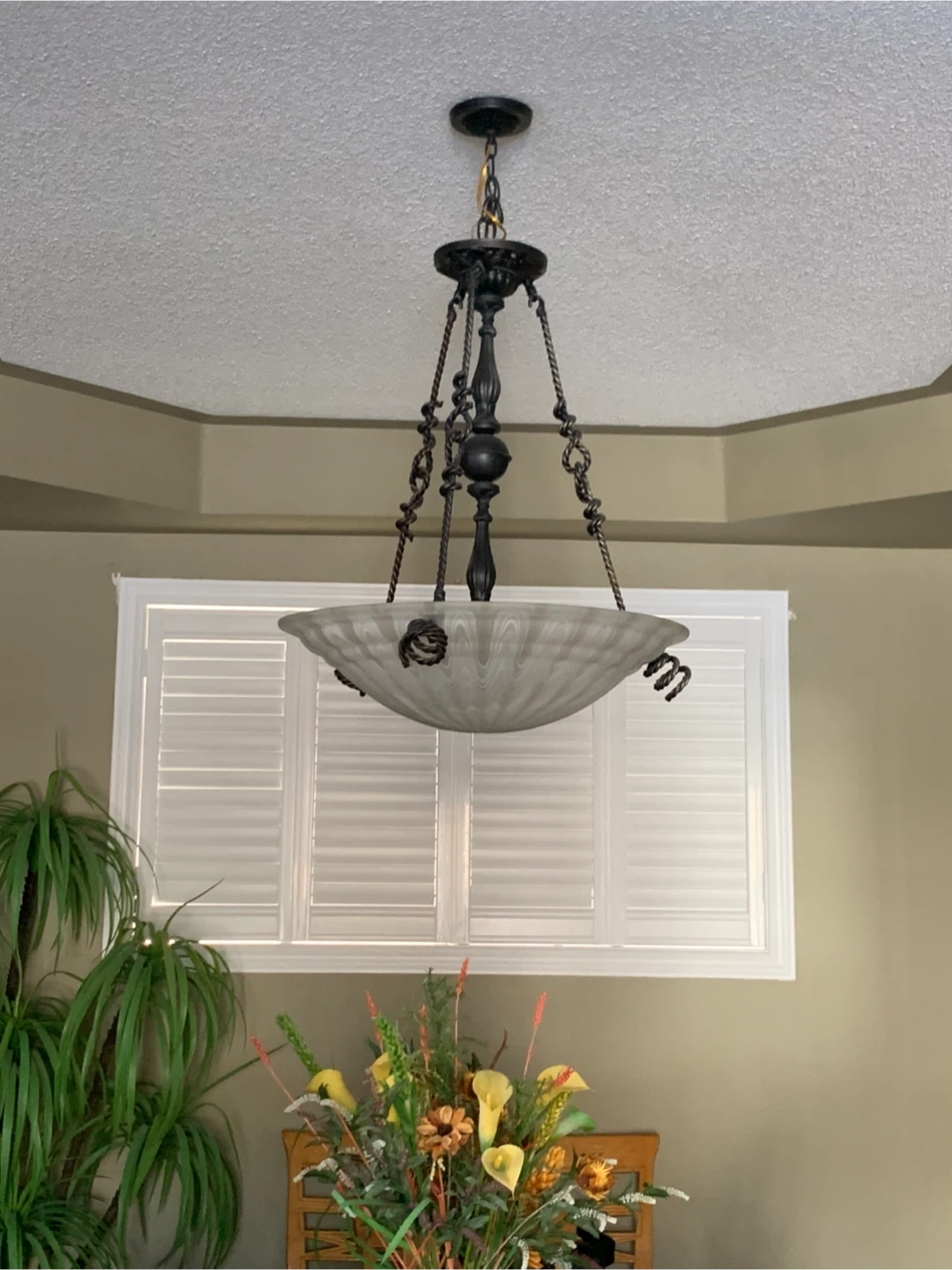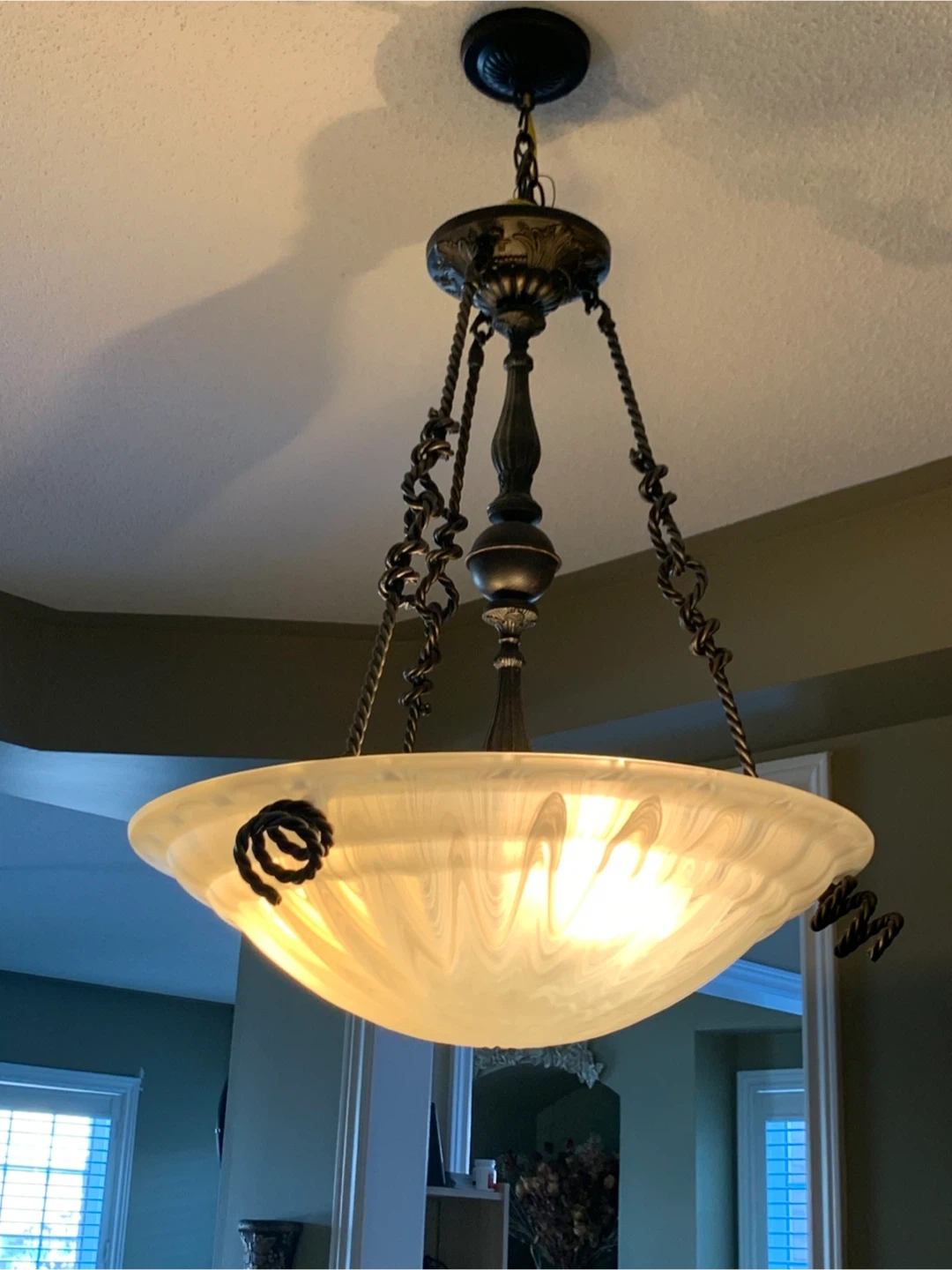 Selling a hanging ceiling light fixture! It features a decorative metal frame and a frosted glass shade. It would be a great addition to any dining room or entryway