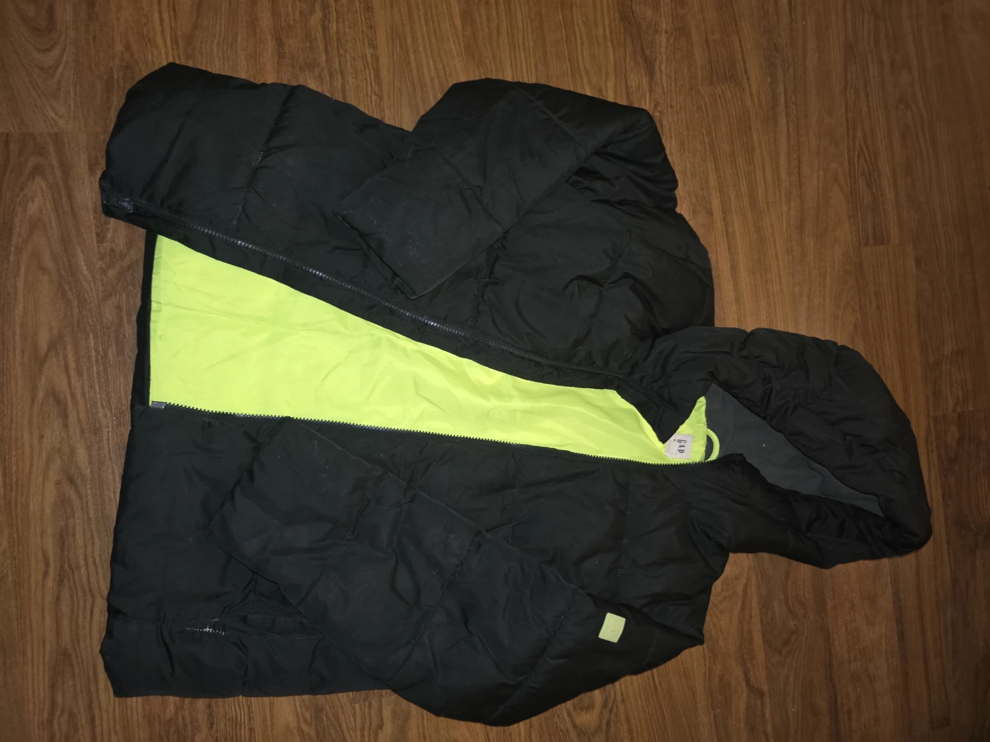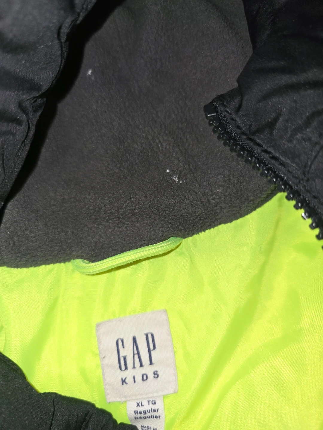 Selling a Gap Kids puffer jacket in size XL. It's black on the outside with a bright neon green lining. Perfect for keeping your little one warm and stylish!