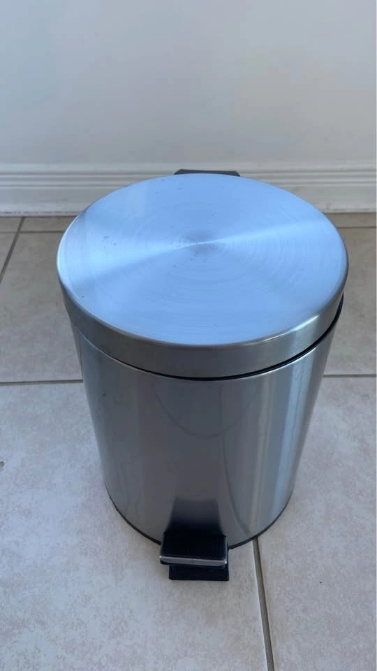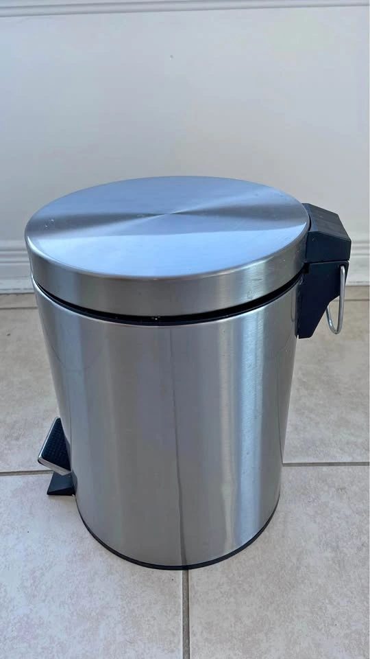 Selling a compact stainless steel trash can with foot pedal.