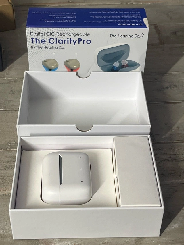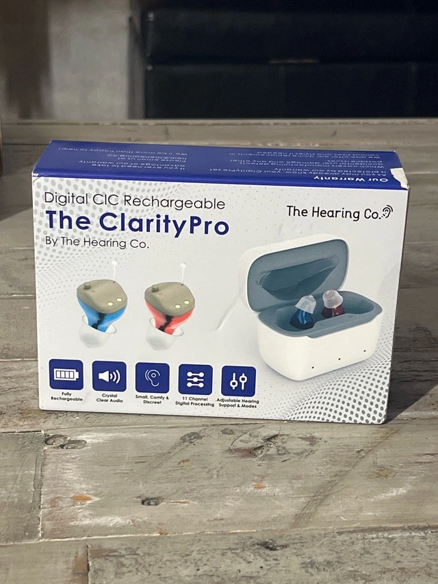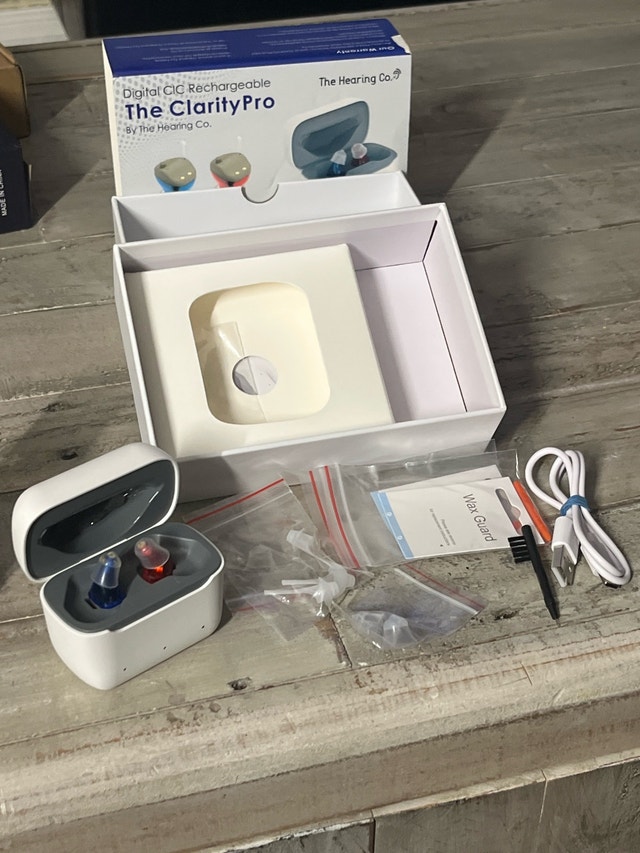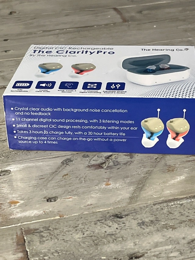 These are new Clarity Pro hearing aids that offer crystal clear audio with background noise cancellation and no feedback. They feature 11 channel digital sound processing with 3 listening modes. The small and discreet CIC design rests comfortably within your ear. It takes 3 hours to charge fully, with a 20 hour battery life. The charging case can charge on-the-go without a power source up to 4 times.