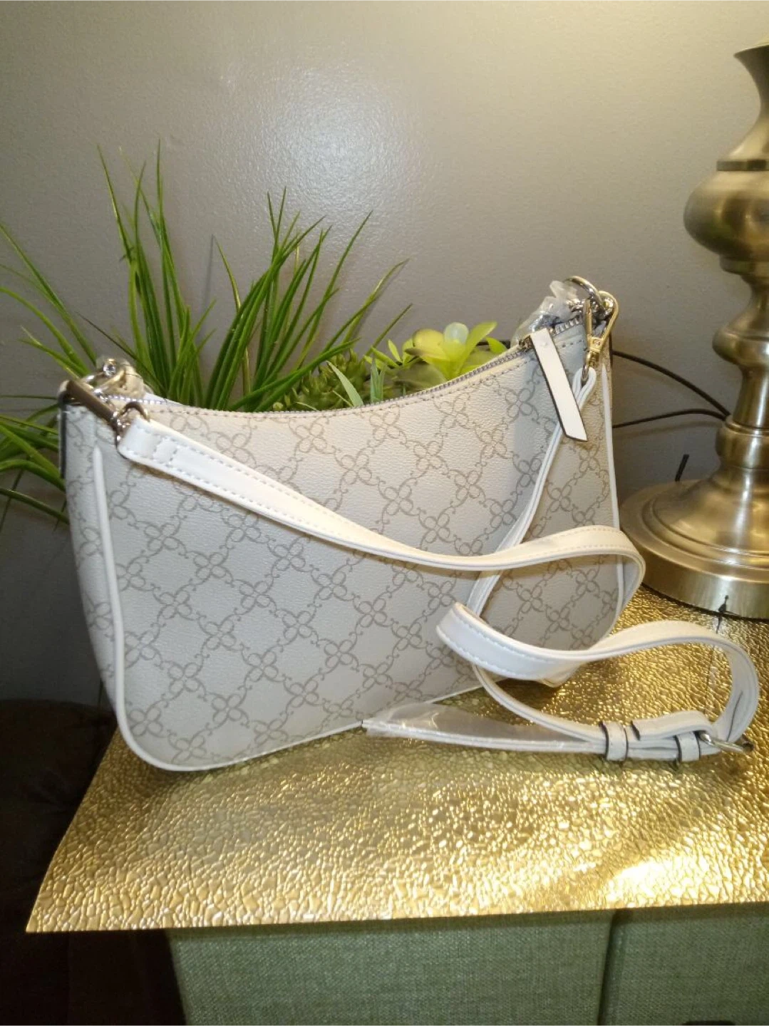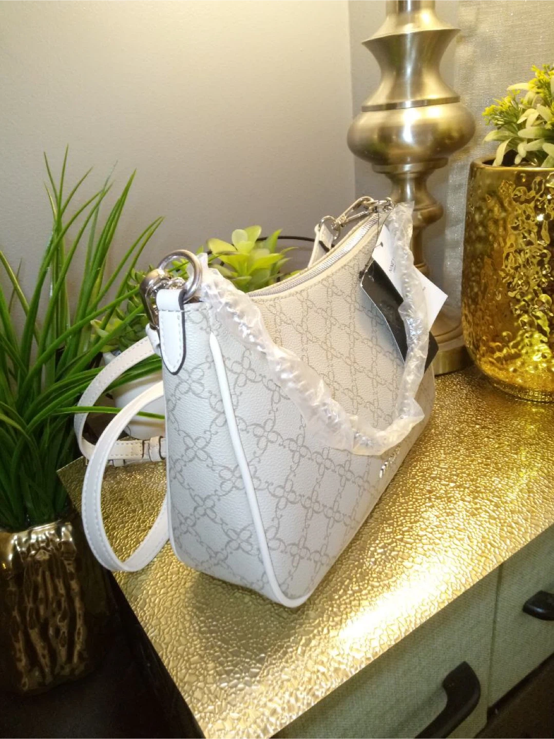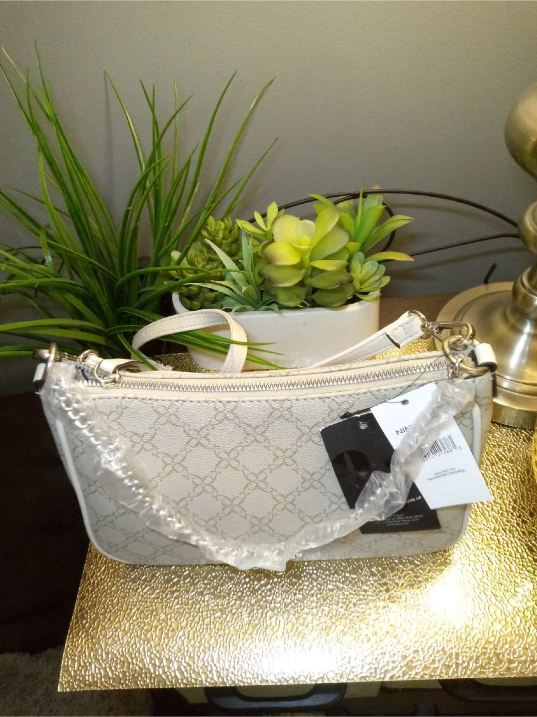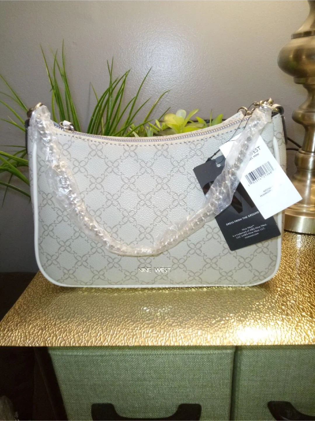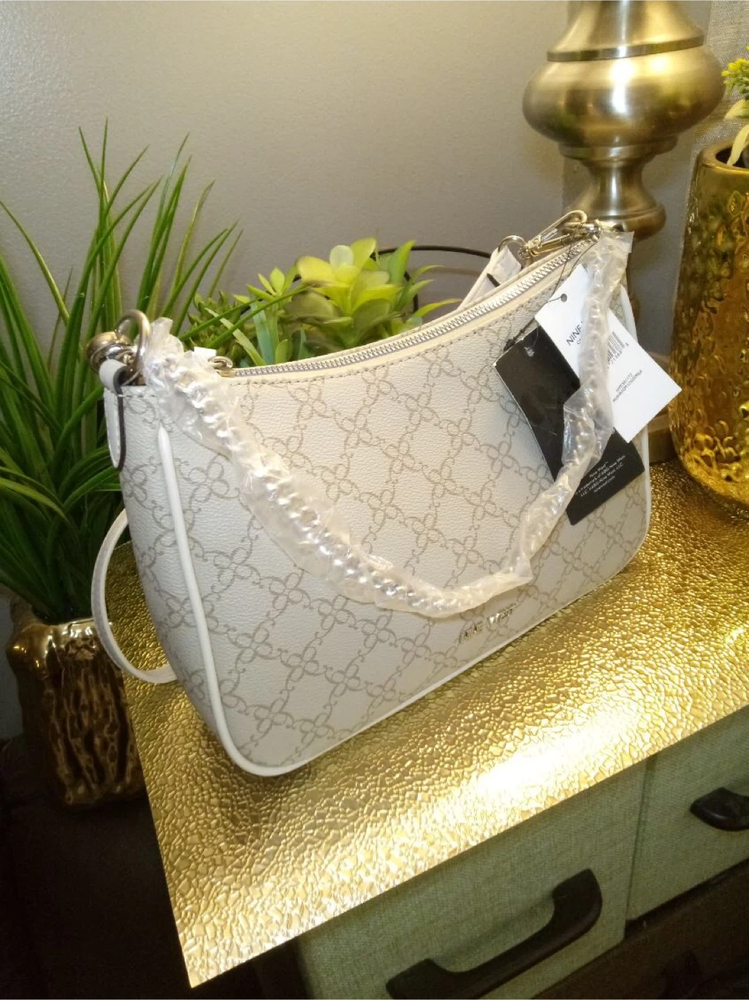 This is a new Nine West shoulder bag! It has a beige floral pattern and a white trim. It comes with both a shoulder strap and a crossbody strap. Never been used!
