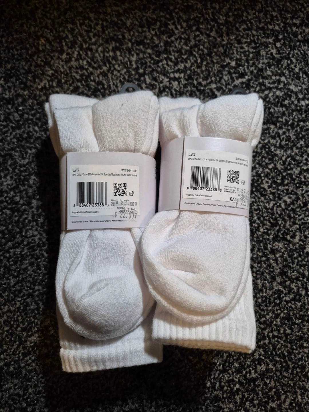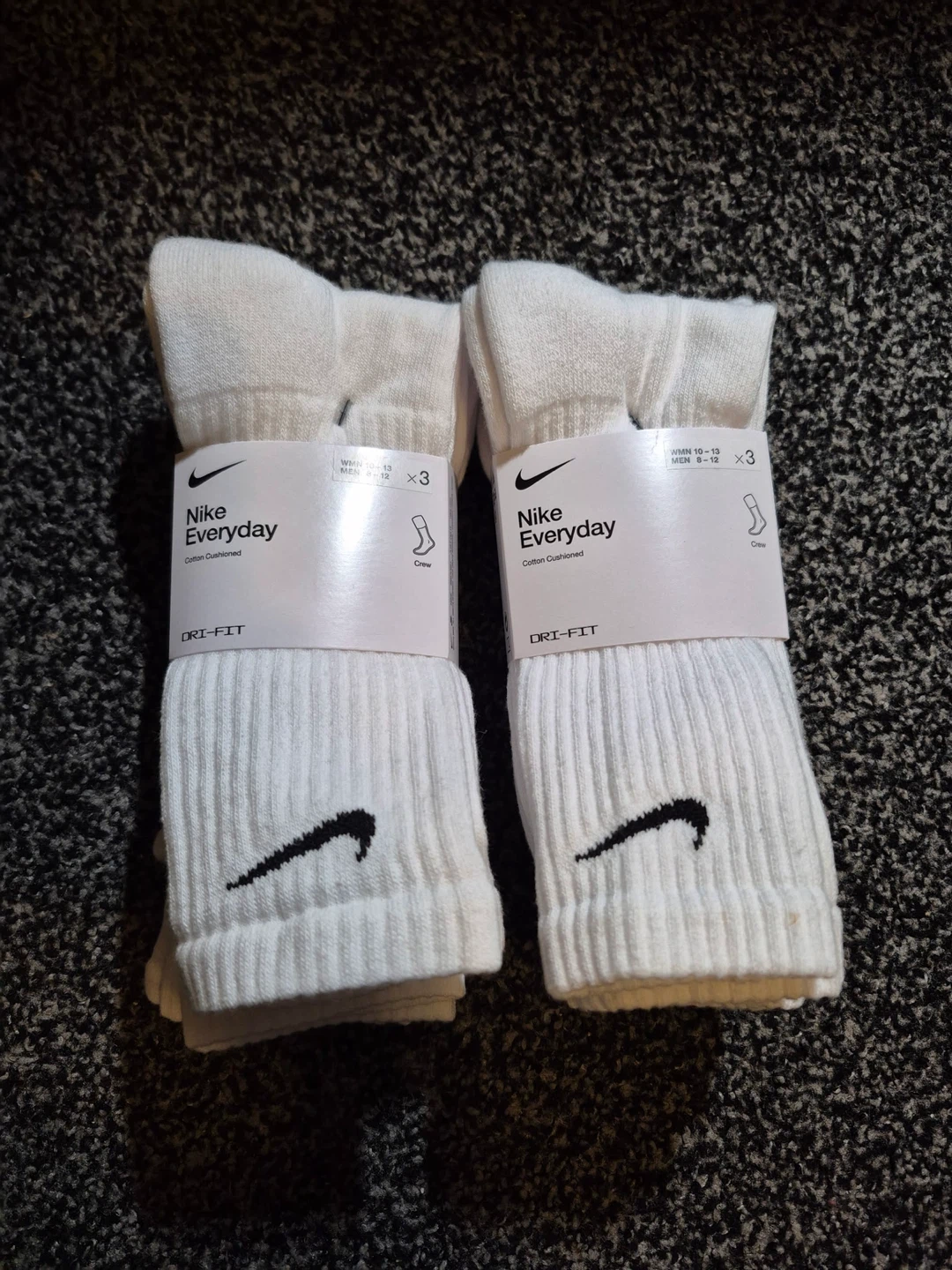 Selling a 2 sets of 3 Nike Everyday Cotton Cushioned Crew socks in size L/G. They are white and made with Dri-FIT technology. The material is 69% cotton, 28% polyester, 2% spandex/elastane, and 1% nylon/polyamide. Originally retailed for $22 dollars each or 44 for both! Both are brand new and in good condition! Selling each for 18 dollars or 30 dollars for both!