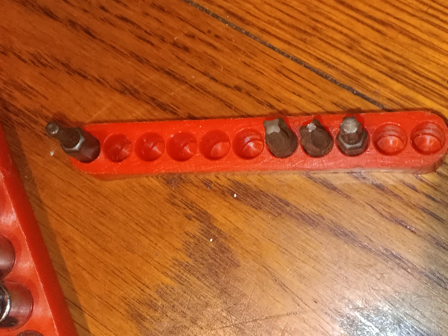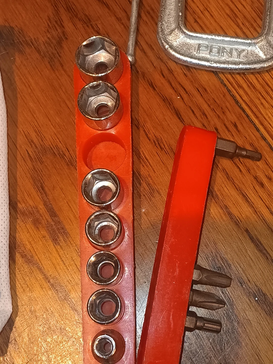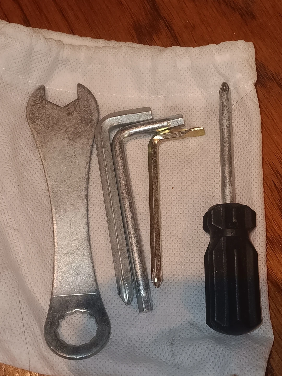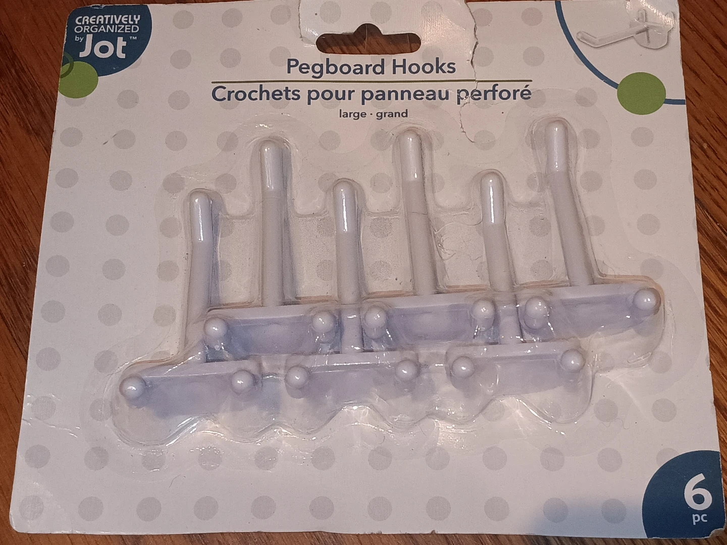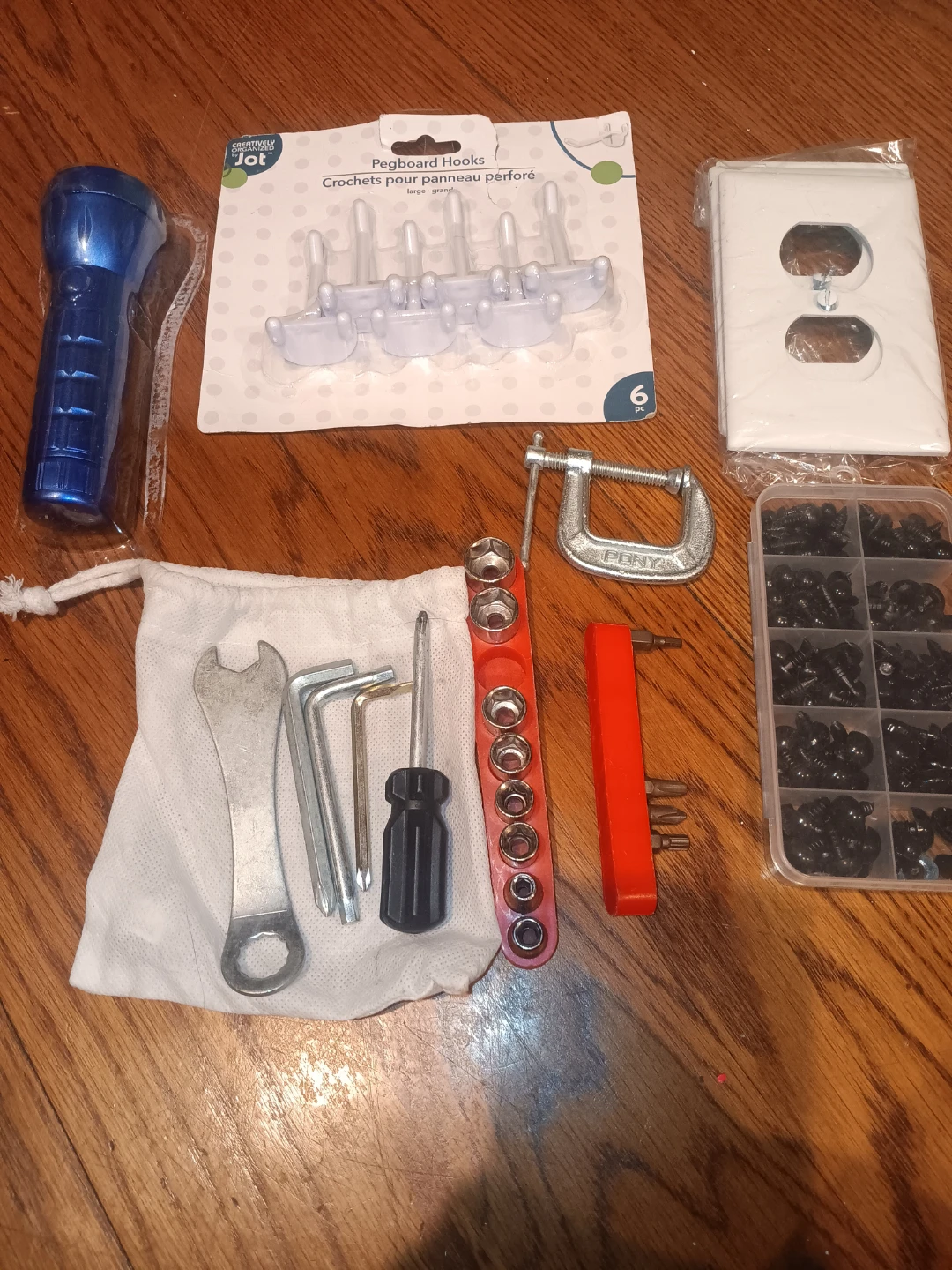 Selling a mixed tool set that includes a wrench, screwdriver, and a set of Allen keys. Also included are pegboard hooks by Creatively Organized by Jot. There's also an outlet cover and a blue flashlight. Great for various household tasks!