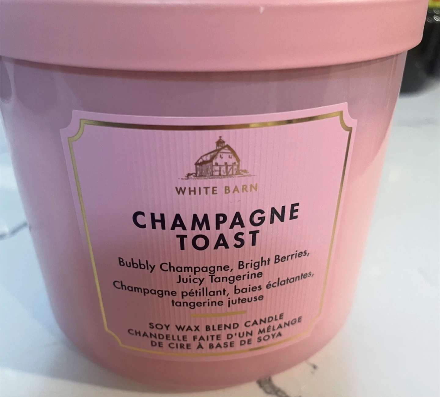Selling a White Barn Champagne Toast candle. It's a soy wax blend candle with a bubbly champagne scent mixed with bright berries and juicy tangerine. The candle is brand new.