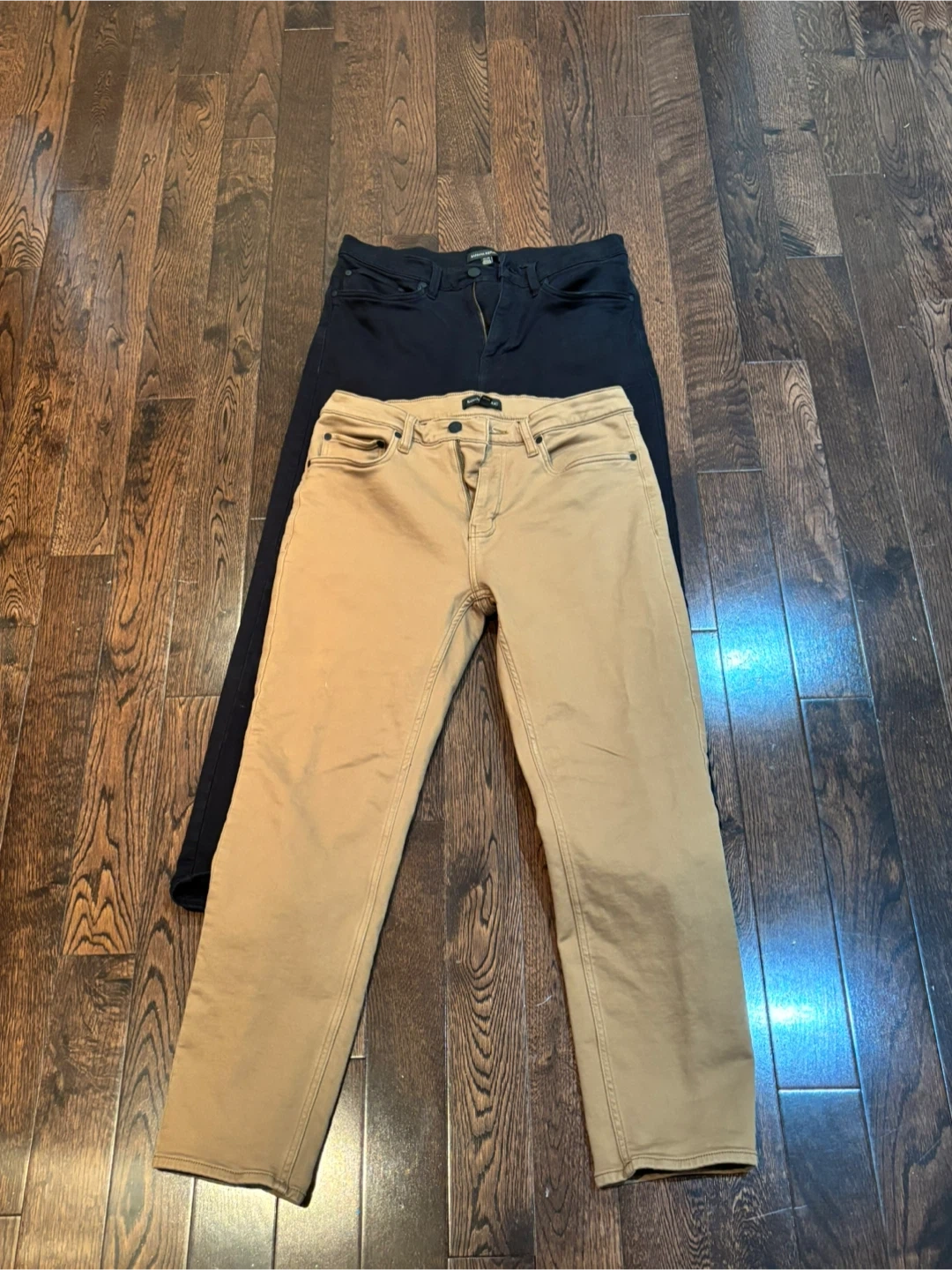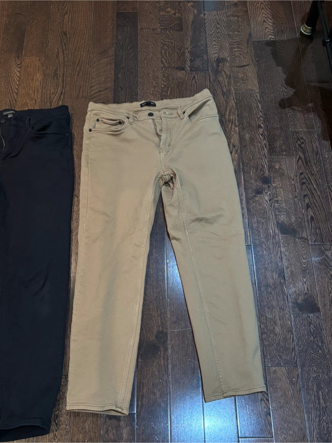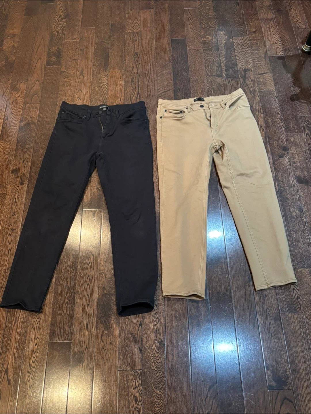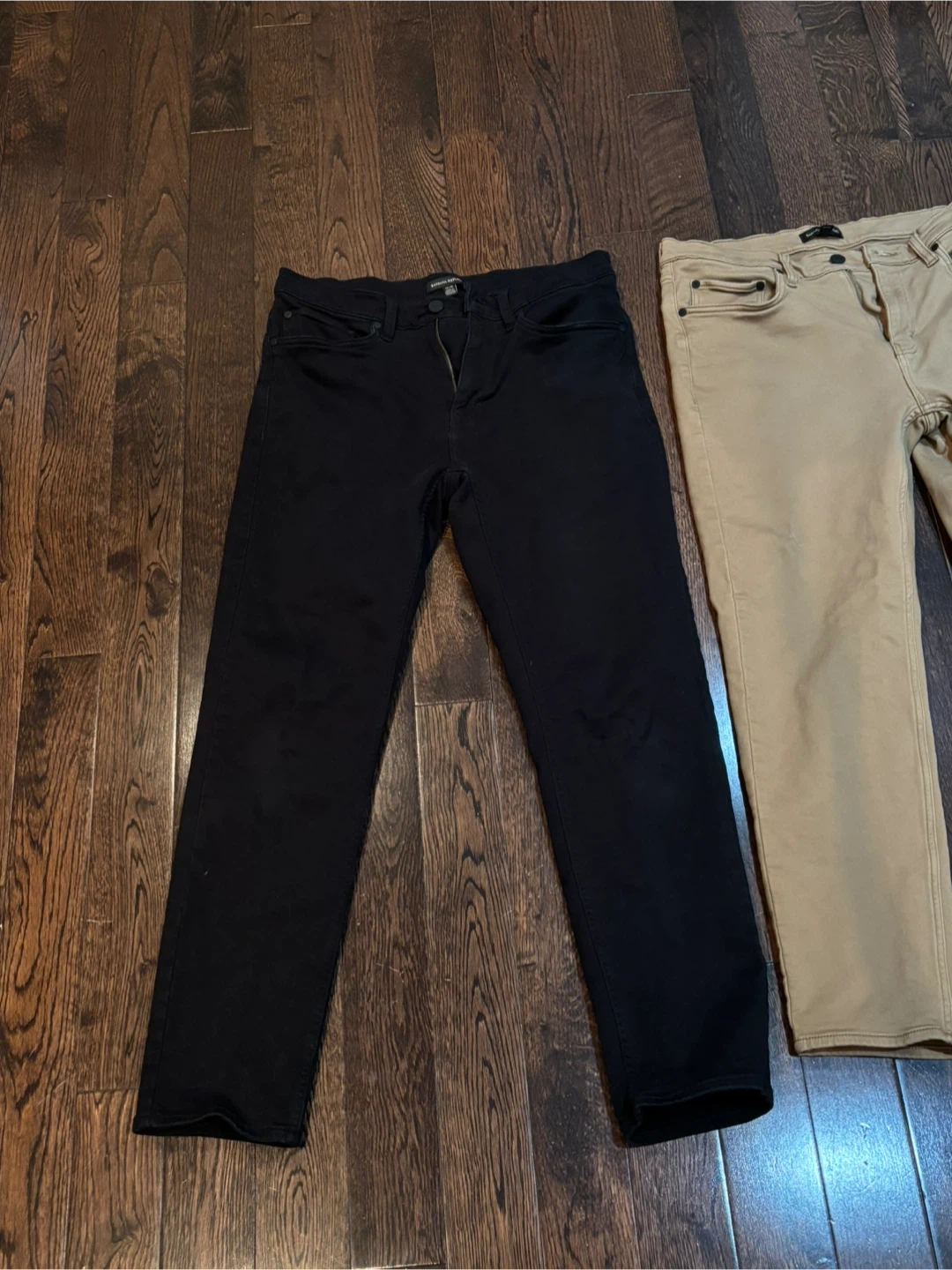 Selling two pairs of men's jeans. One pair is black and the other is tan. Both are in good condition and ready for a new owner