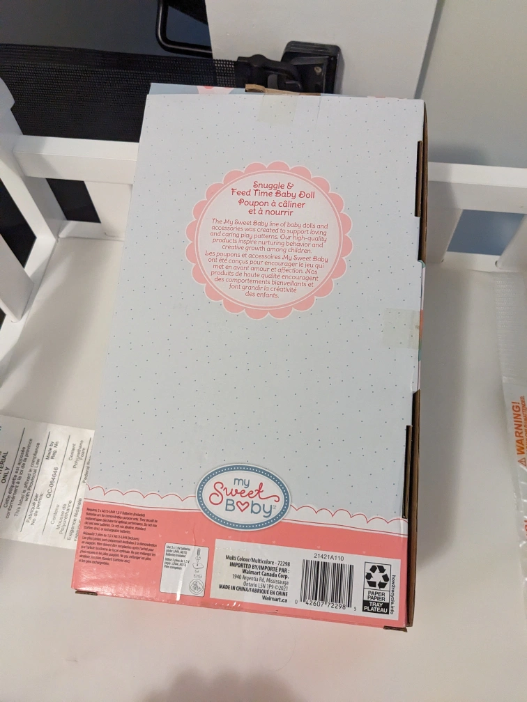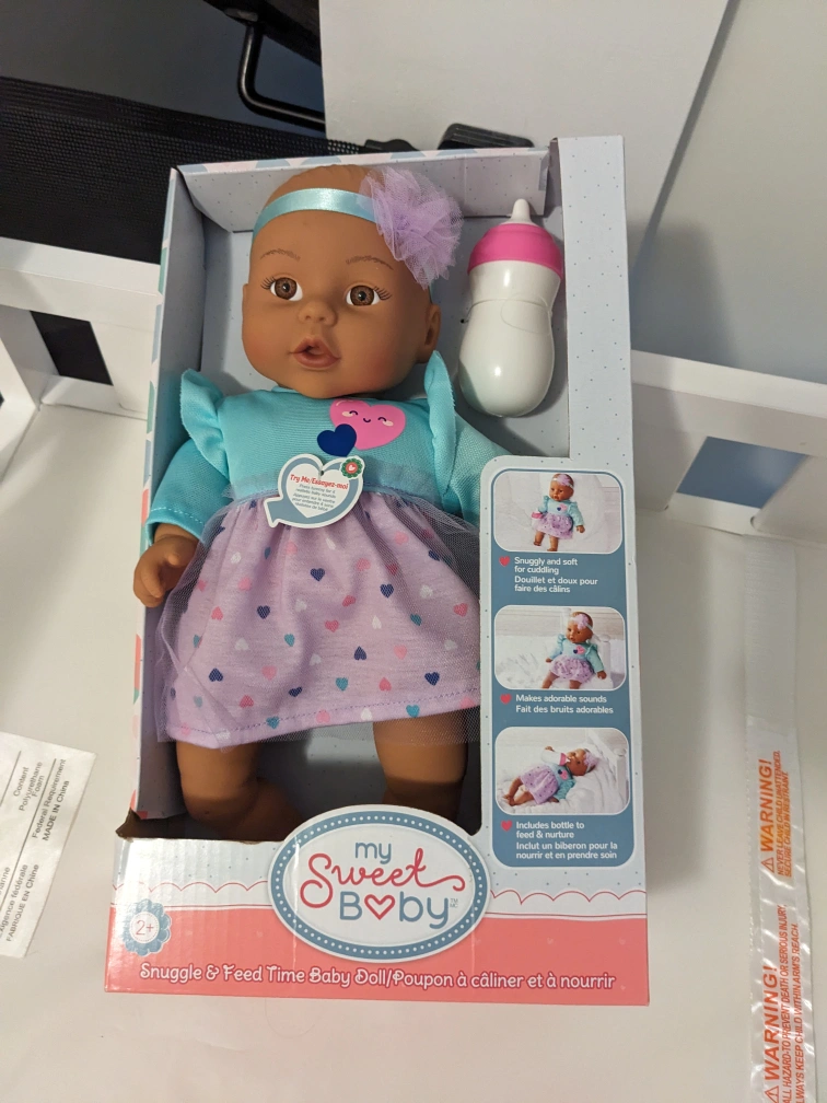 Description: My Sweet Love Snuggle and Feed Time Baby Doll, Dark Skin Tone, Purple Outfit. Doll makes sound when you press the tummy.