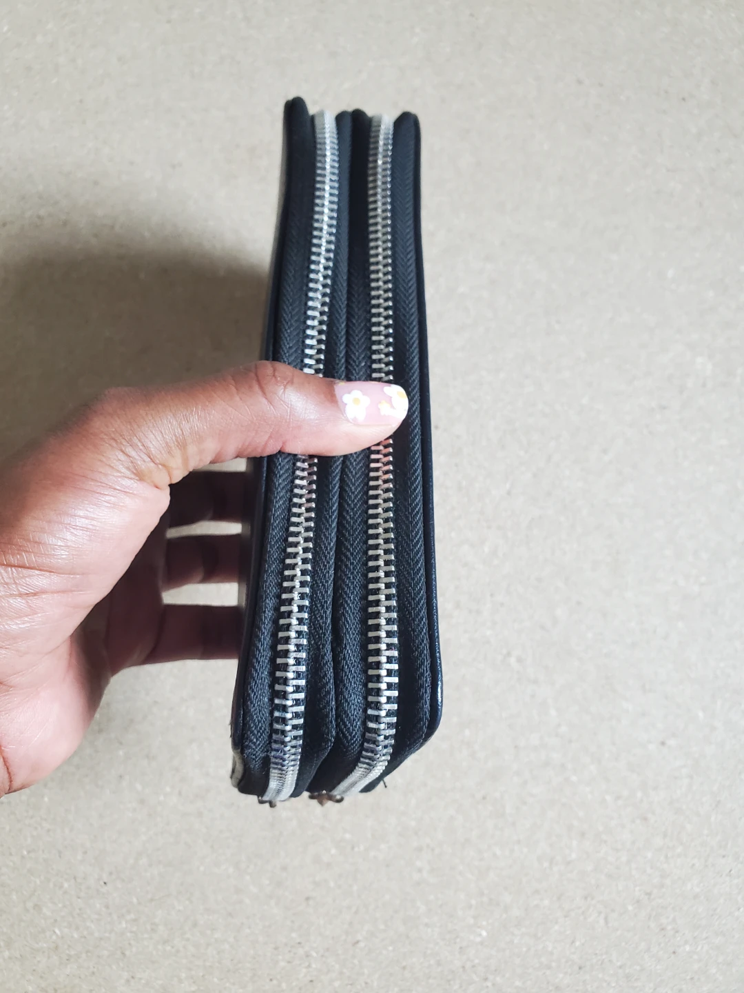 Selling a black zip-around wallet. It has a double zipper and several compartments inside. It's in good condition and ready for a new owner!