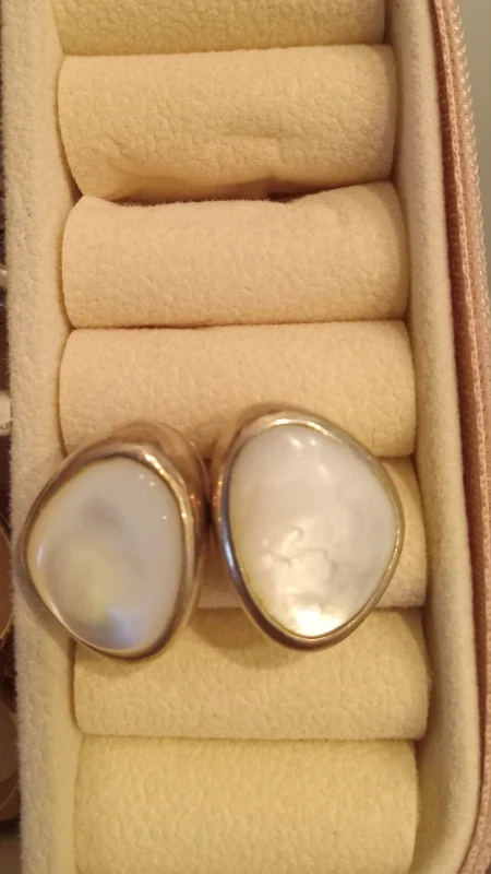 These are a pair of lovely earrings featuring a mother of pearl stone set in sterling silver.
