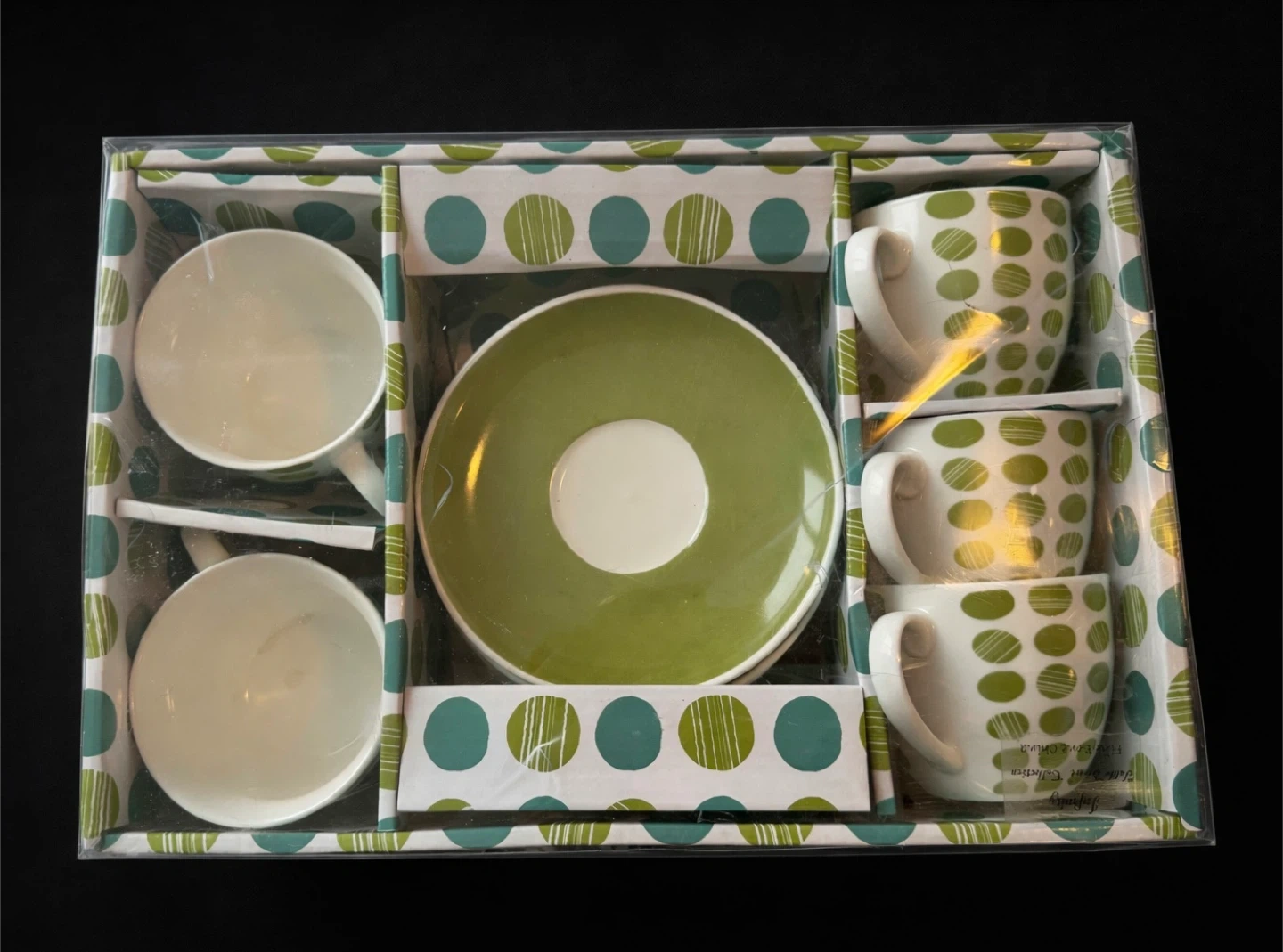 Brand new tea set by Infinity Fine Bone China, still in its original packaging! The set includes 5 cups and 5 saucers with a fun green polka dot design. Perfect for tea time with friends or a lovely gift for a tea lover