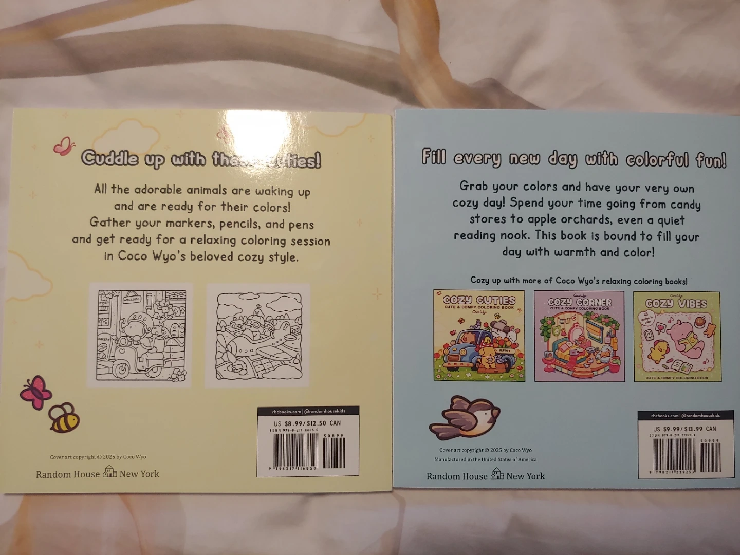 Two adorable brand new mint condition Coco Wyo colouring books! One is "Cozy Cuties" and the other is "Cozy Days" Both are filled with cute and comfy illustrations to colour in. Both for $5