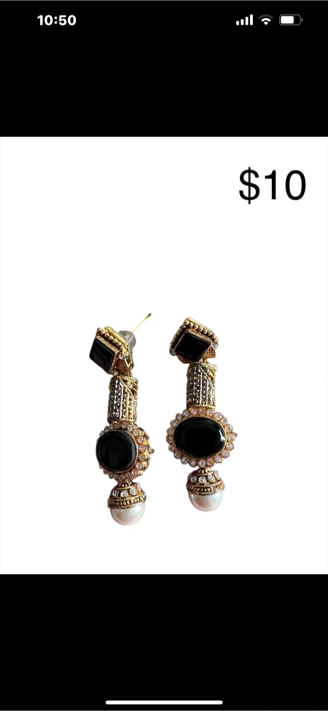 Selling a pair of drop earrings. They feature black and gold colours, with faux pearl accents. Asking $10