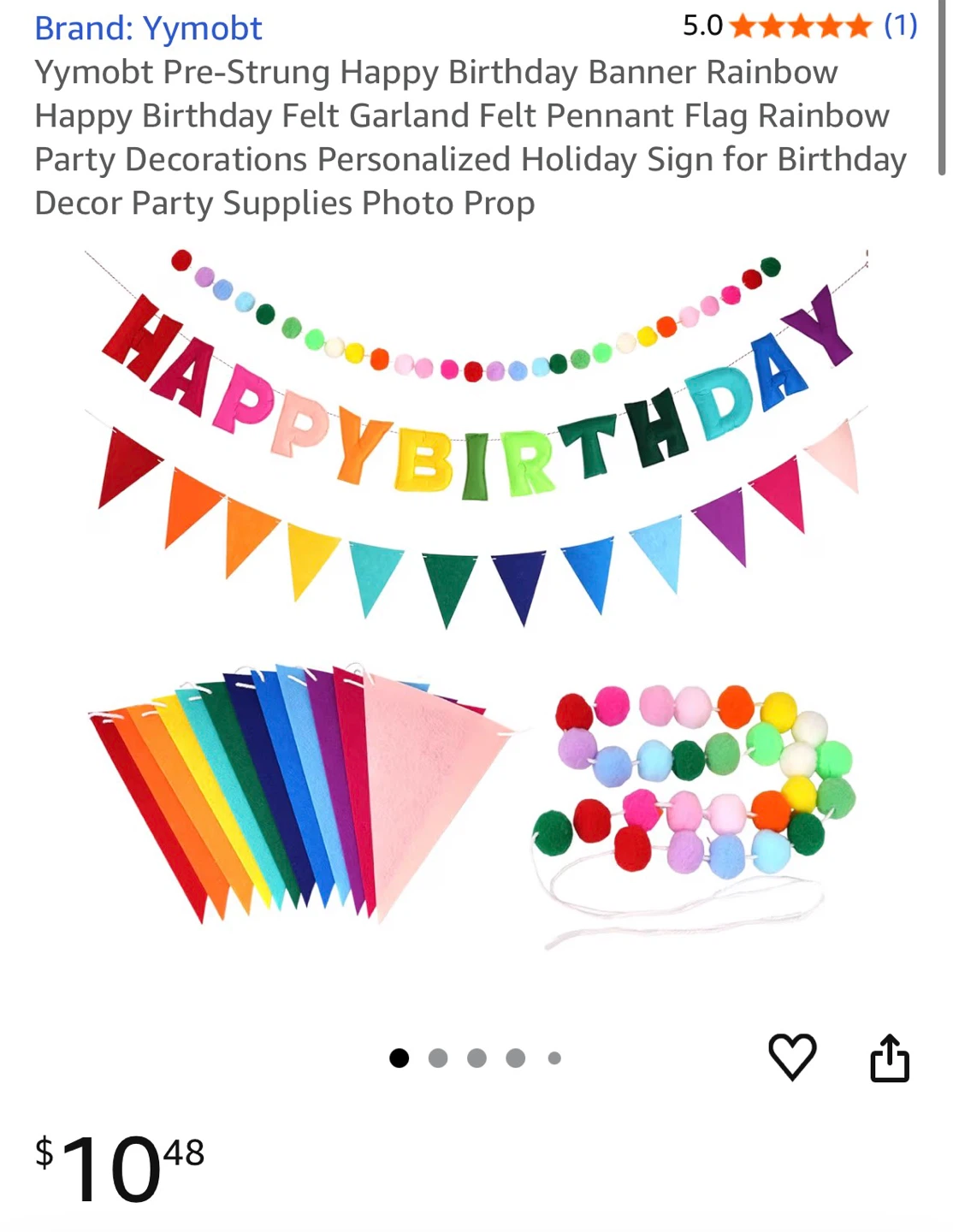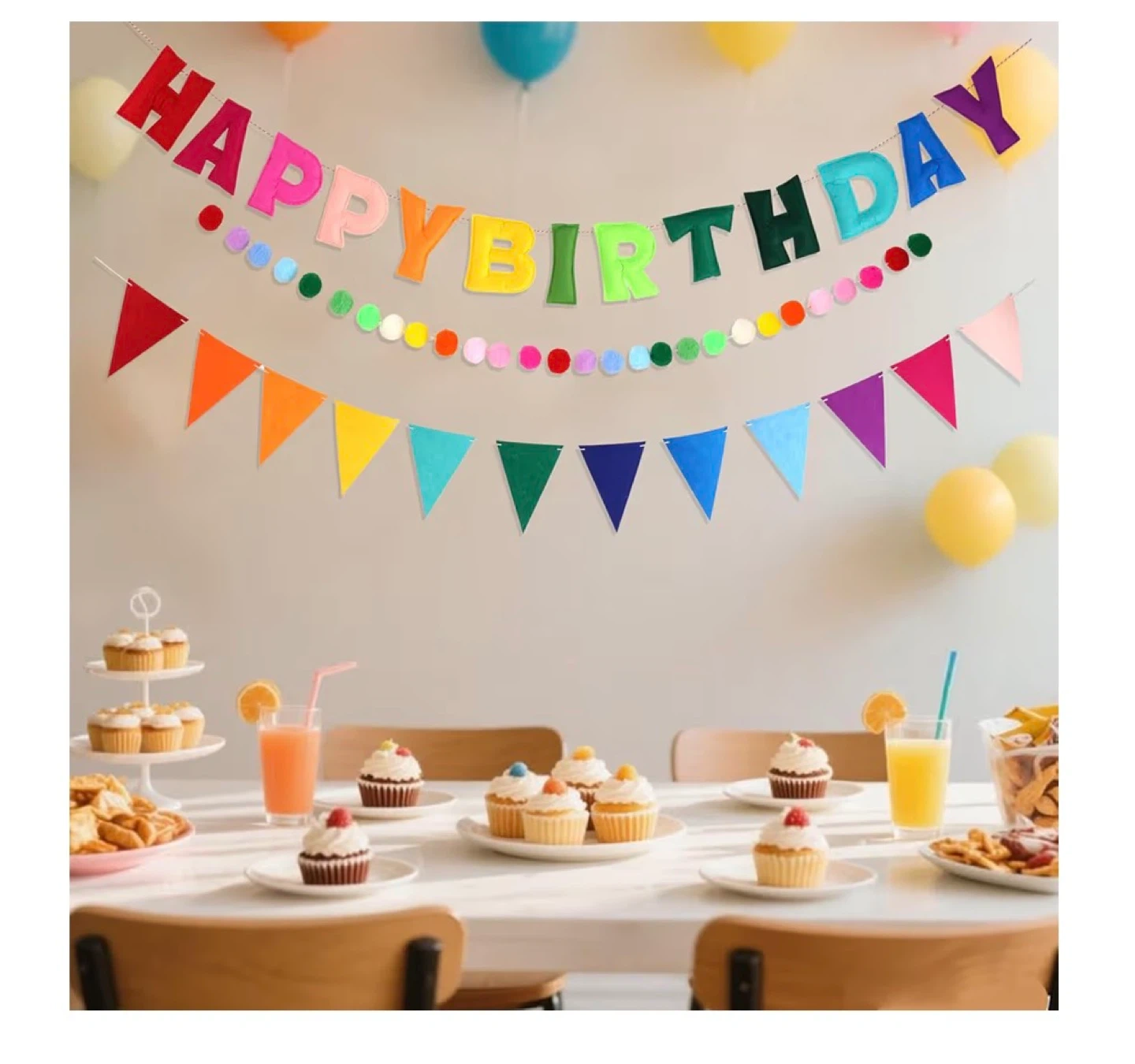 I'm selling a brand new Pre-Strung Happy Birthday Banner Rainbow. It's a felt garland, perfect for birthday decorations and as a photo prop. Retails for $10.48!
