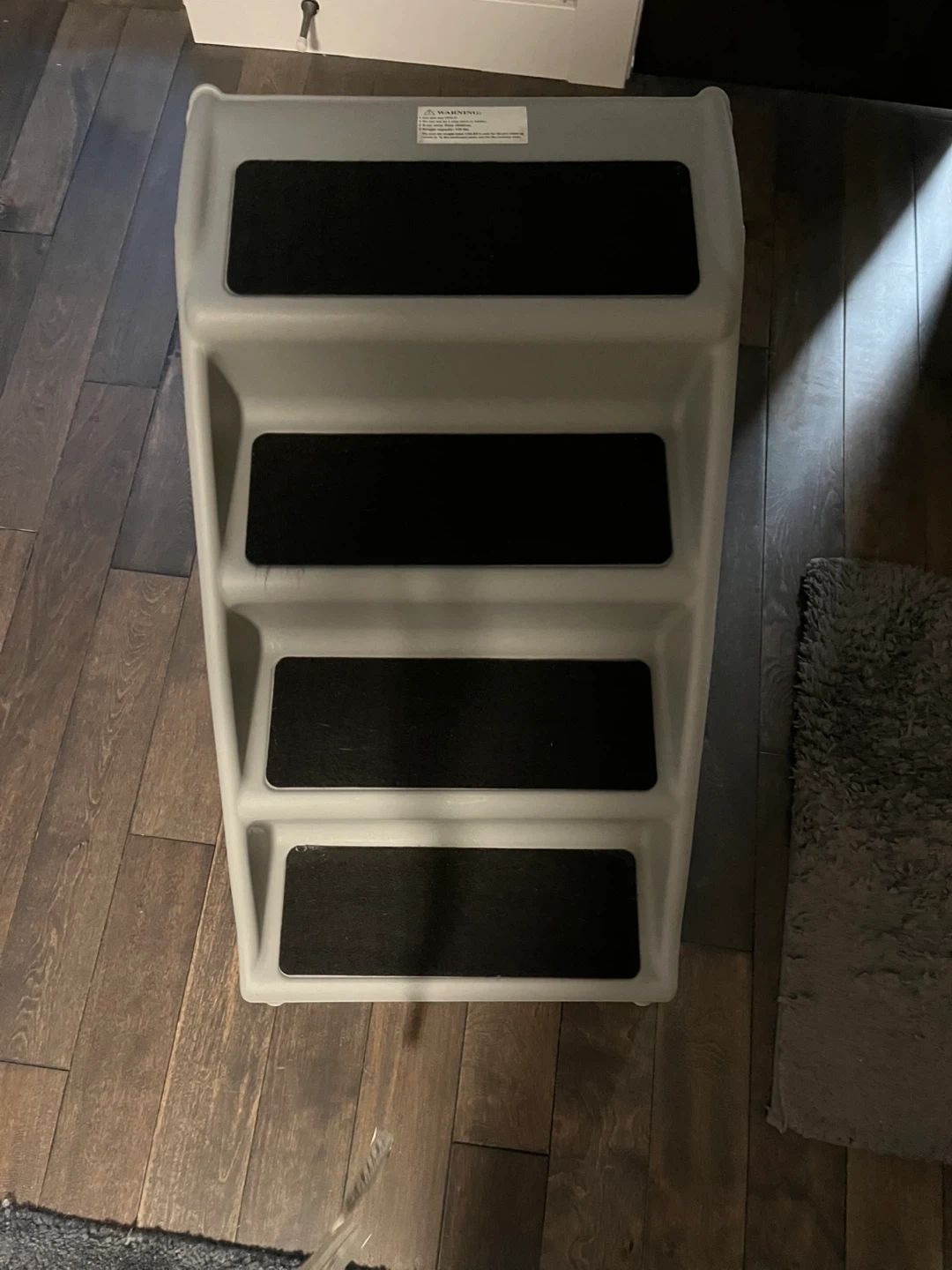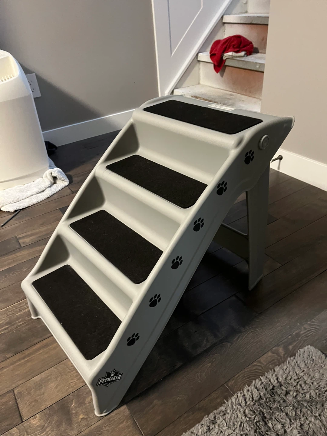 Selling a Petmaker foldable 4-step pet stair. It's in great condition and perfect for helping your furry friend reach higher places! The stairs are grey with black paw prints and black treads. 20 inches high by 14.5 inches wide by 24 inches deep
