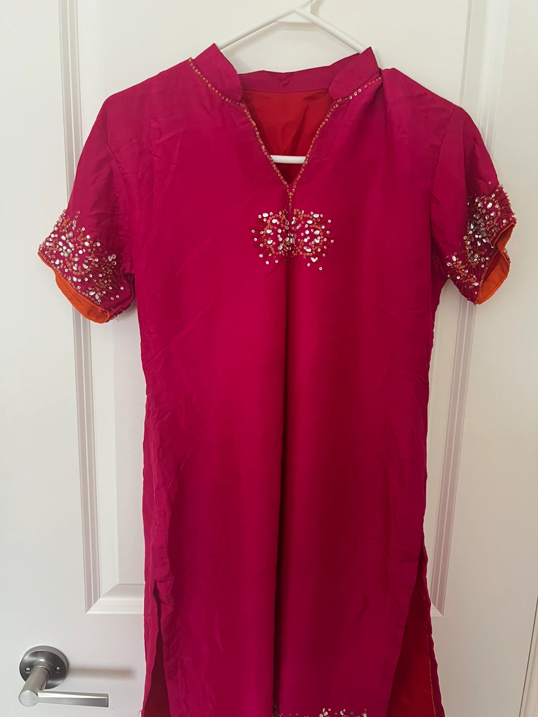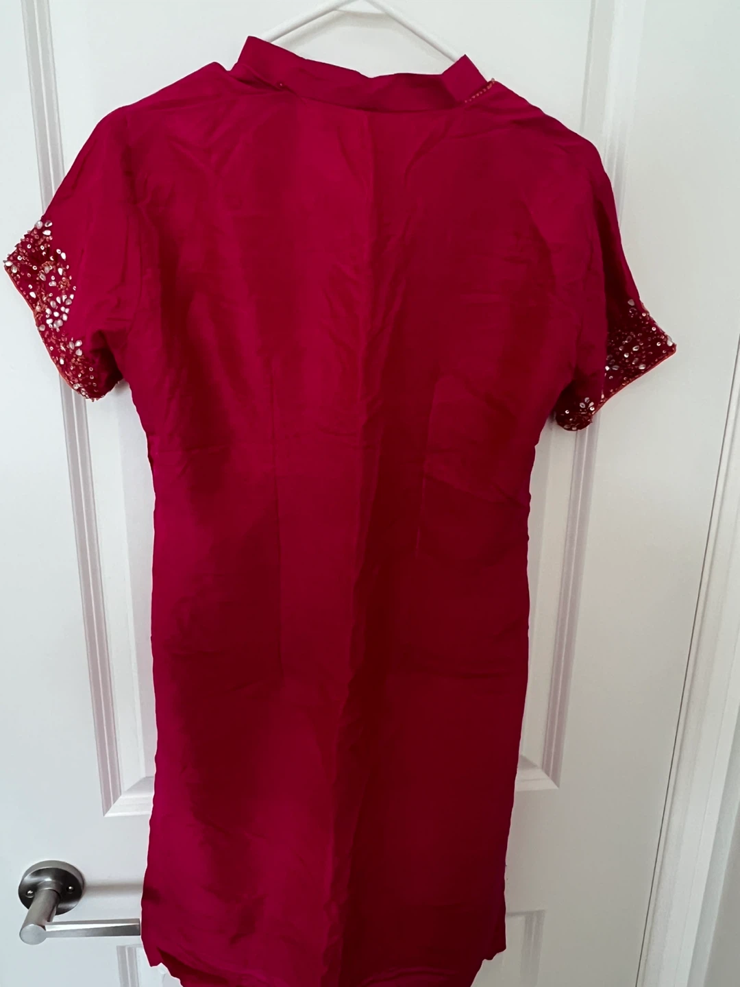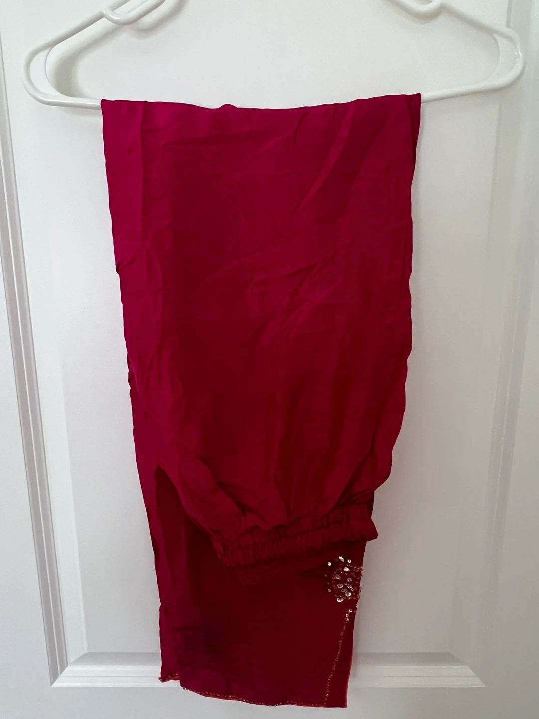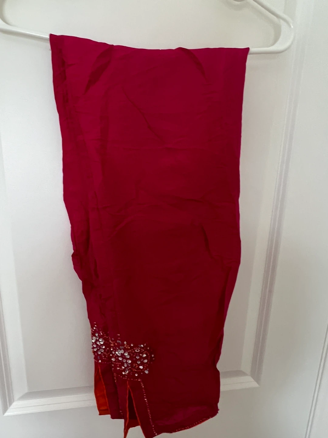 Selling a lovely red salwar kameez suit! It features beautiful detailing and is perfect for a special occasion. The fabric feels nice and comfortable. It's in new condition and ready for a new owner!