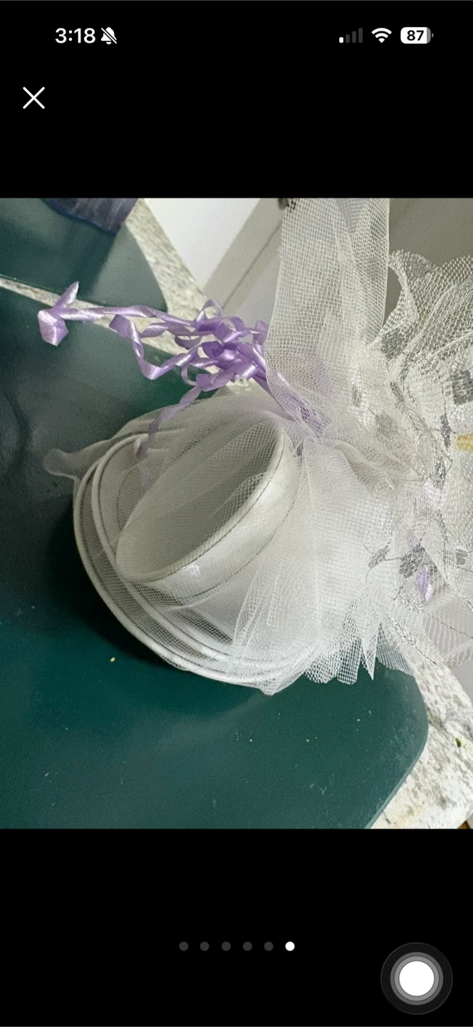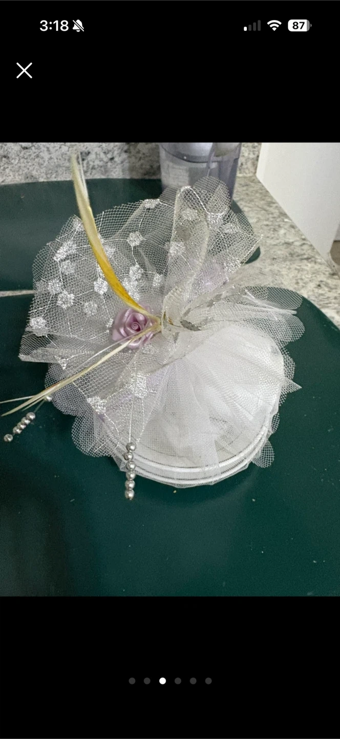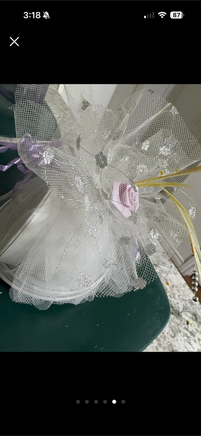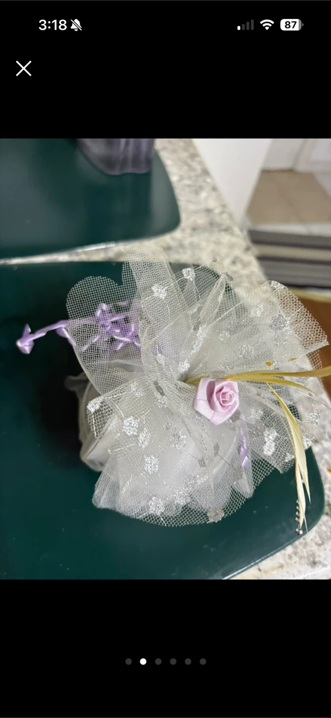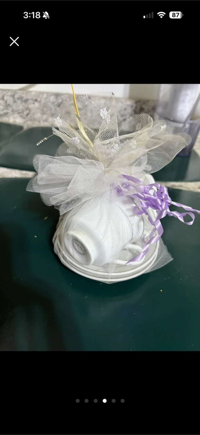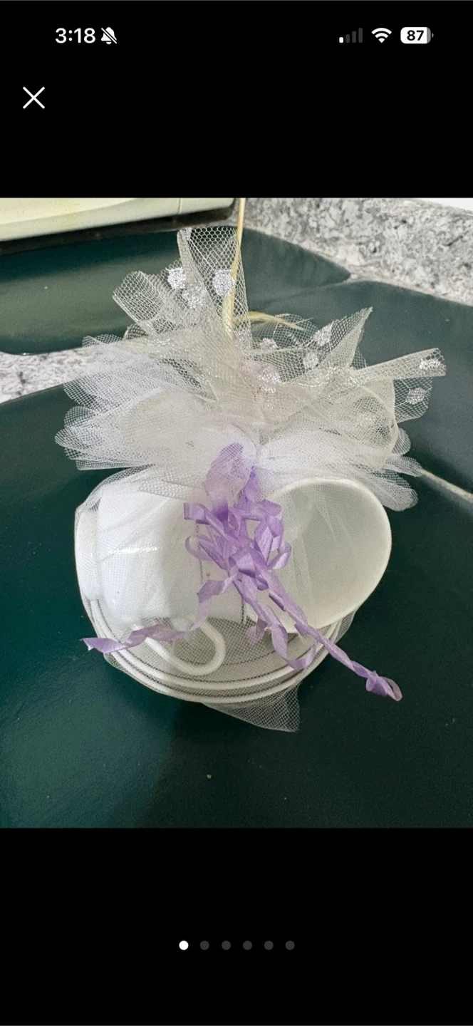 Here's a charming tea cup and saucer set, beautifully decorated with delicate netting, ribbons, and floral accents. It would make a lovely addition to any tea lover's collection or a sweet decorative piece for your home
