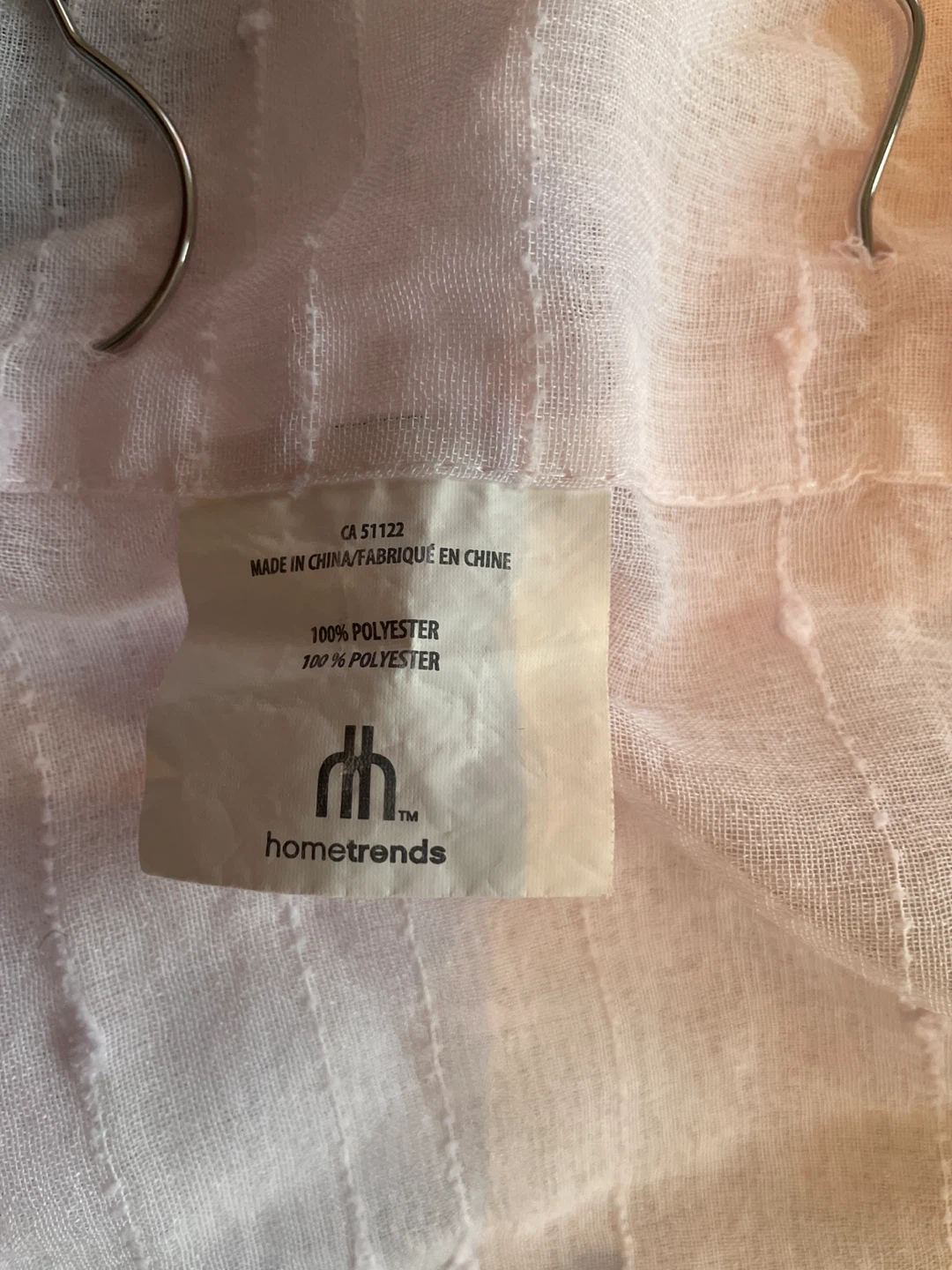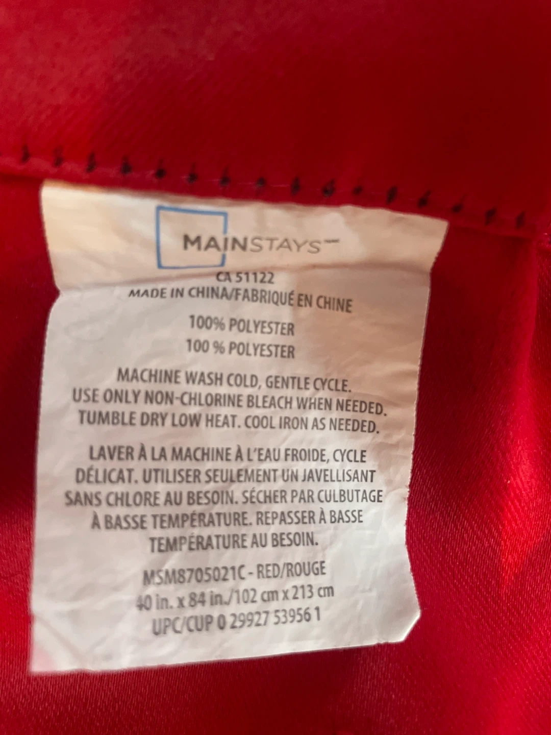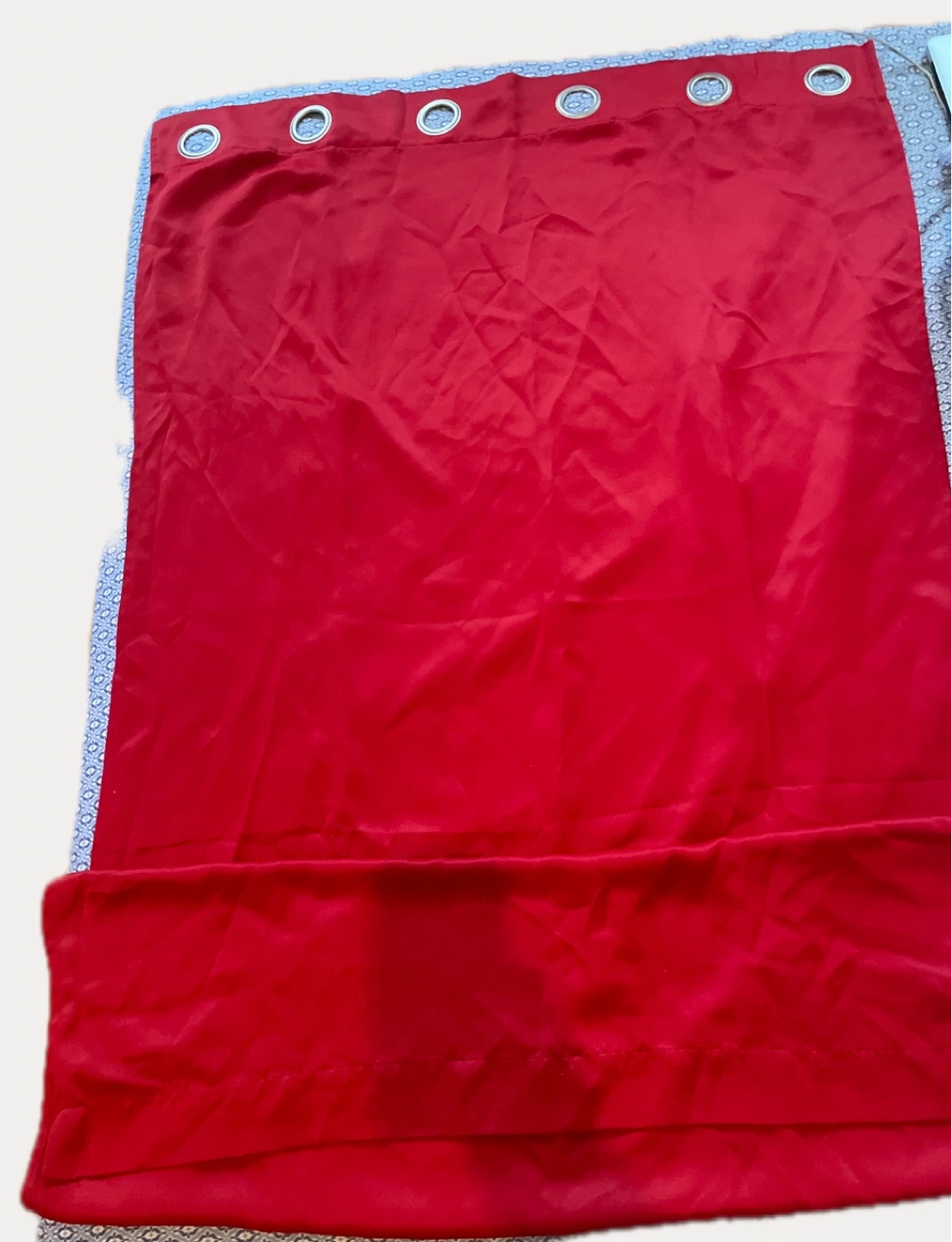 I have a set of 4 Mainstays curtain panels for sale! There are 2 red panels, 1 off-pink and 1 white panel. The red panels measures 40 inches x 84 inches, while the white panel measures 51 inches x 63 inches. The pink one has curtain handles pierced into it. Both are made of 100% polyester and can be machine washed on a gentle cycle.