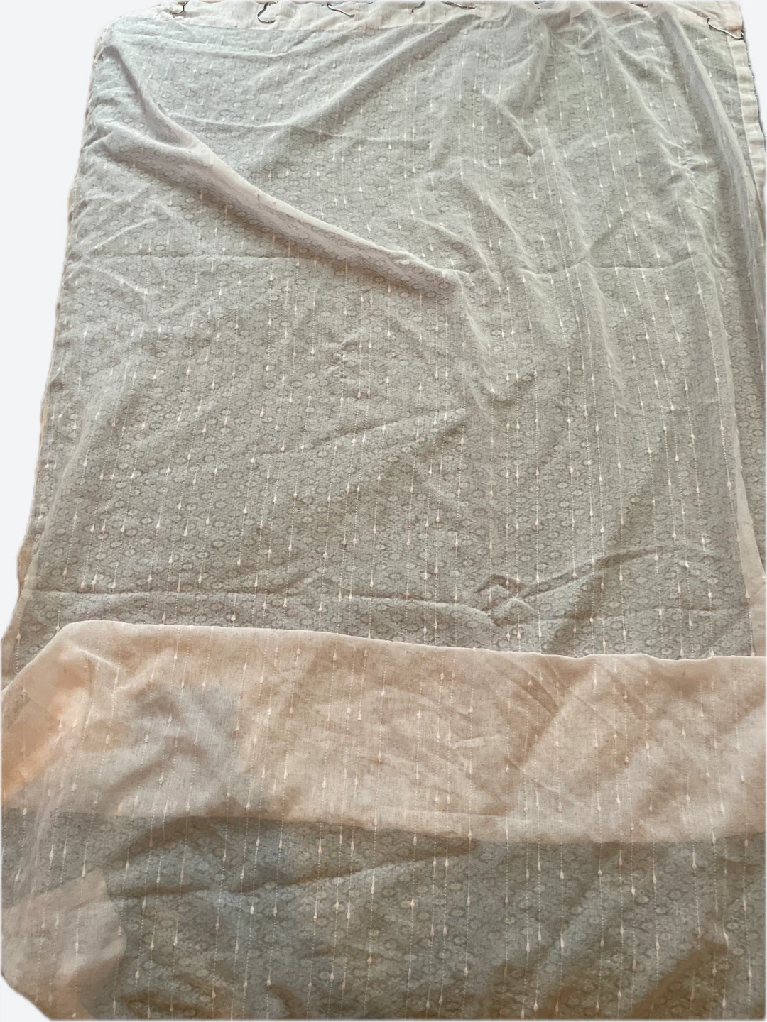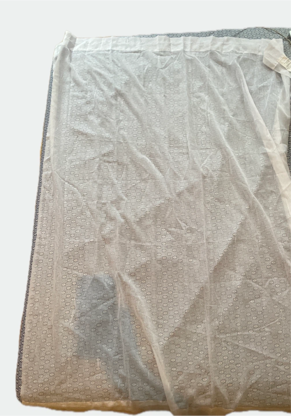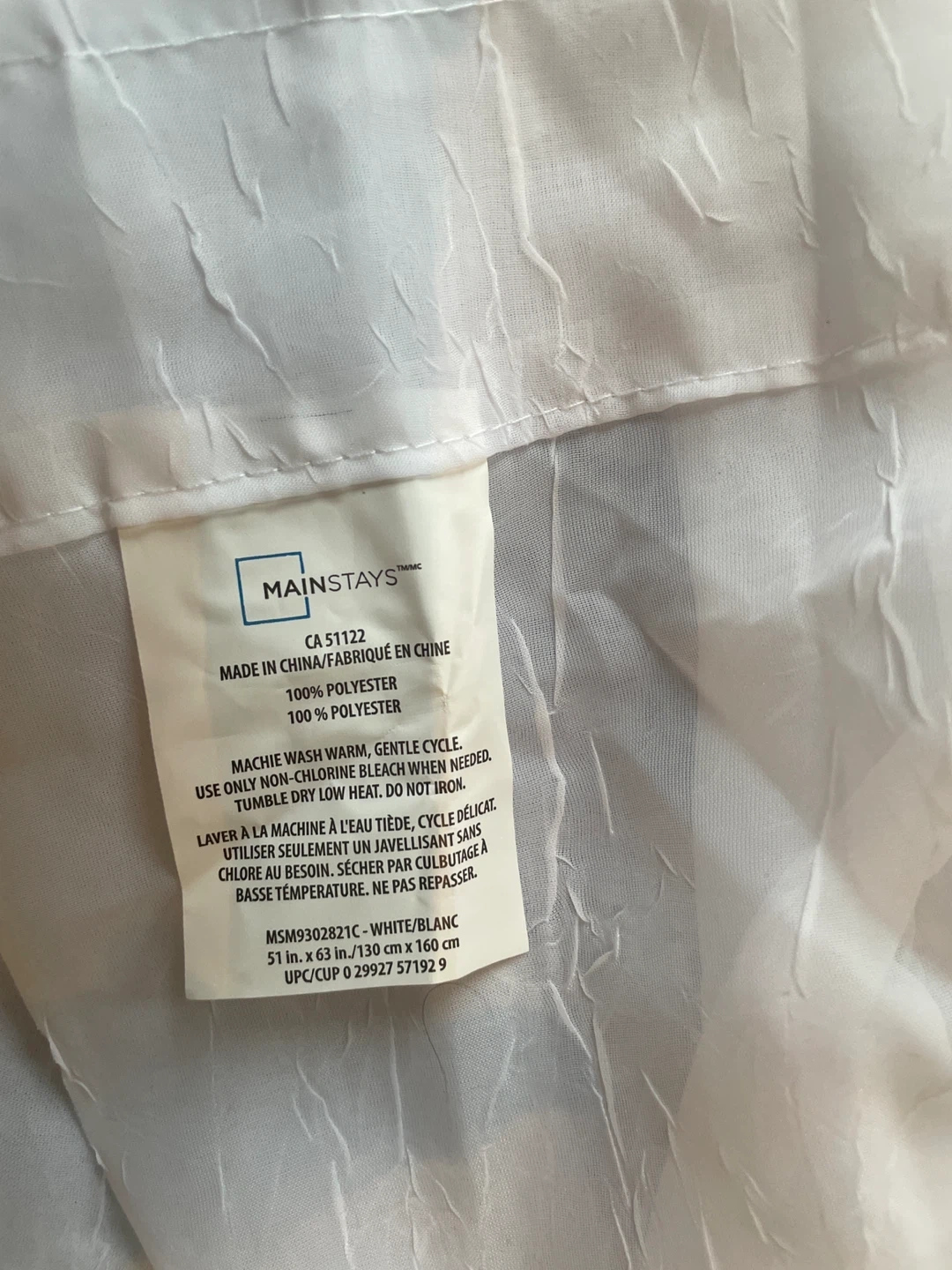 I have a set of 4 Mainstays curtain panels for sale! There are 2 red panels, 1 off-pink and 1 white panel. The red panels measures 40 inches x 84 inches, while the white panel measures 51 inches x 63 inches. The pink one has curtain handles pierced into it. Both are made of 100% polyester and can be machine washed on a gentle cycle.