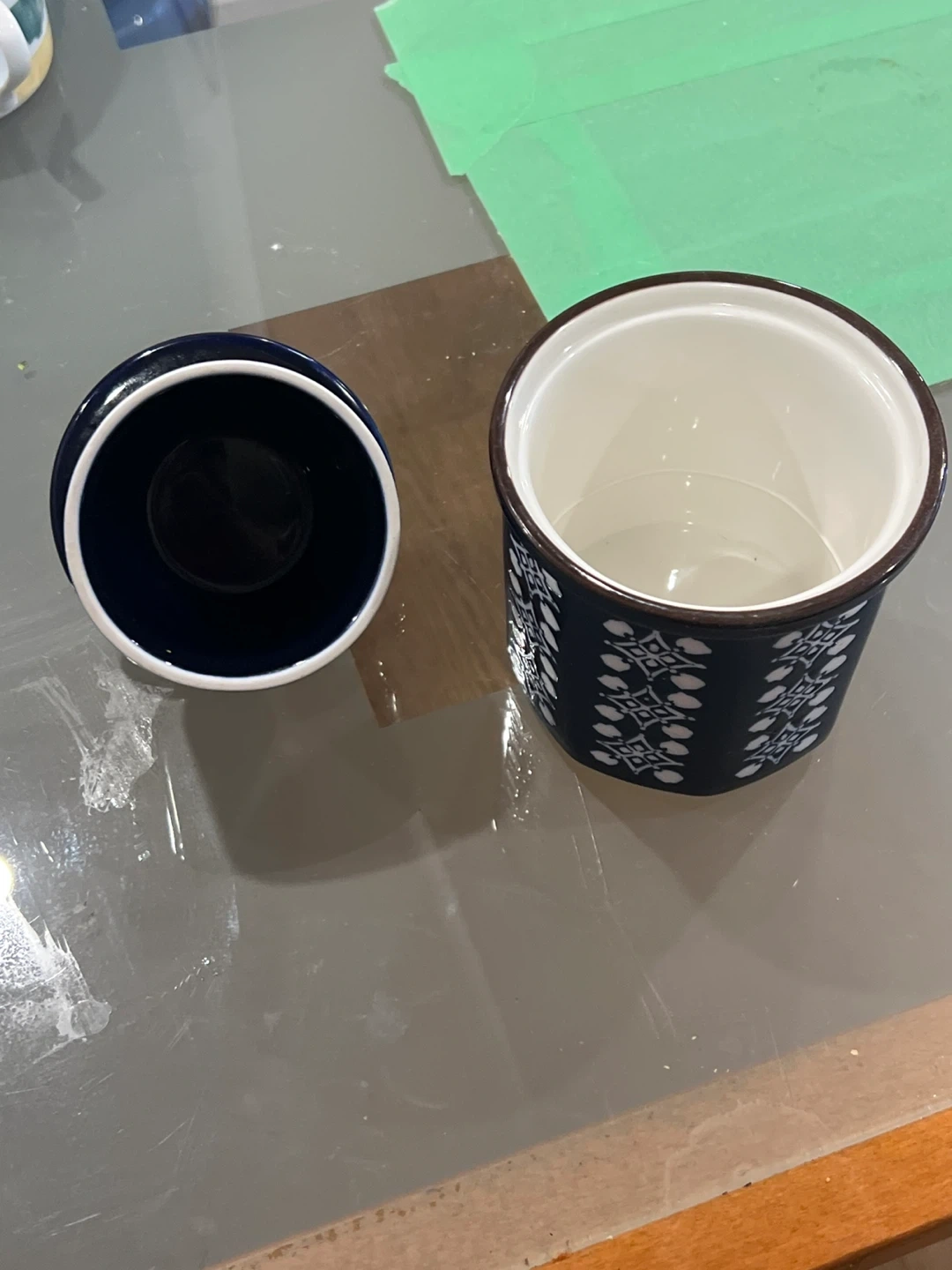 Selling a lovely vintage butter bell crock in navy blue with a white patterned design. It's in great condition and perfect for keeping your butter fresh and spreadable on the counter. A charming addition to any kitchen!