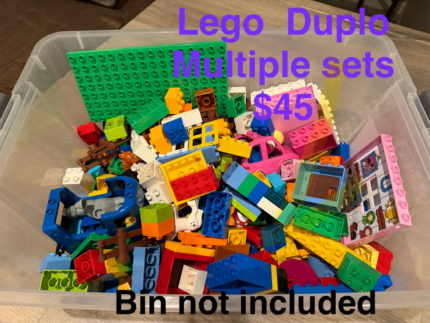 Selling a bunch of Lego Duplo sets for $45! Lots of colourful pieces for building and creating. Please note that the bin is not included.
