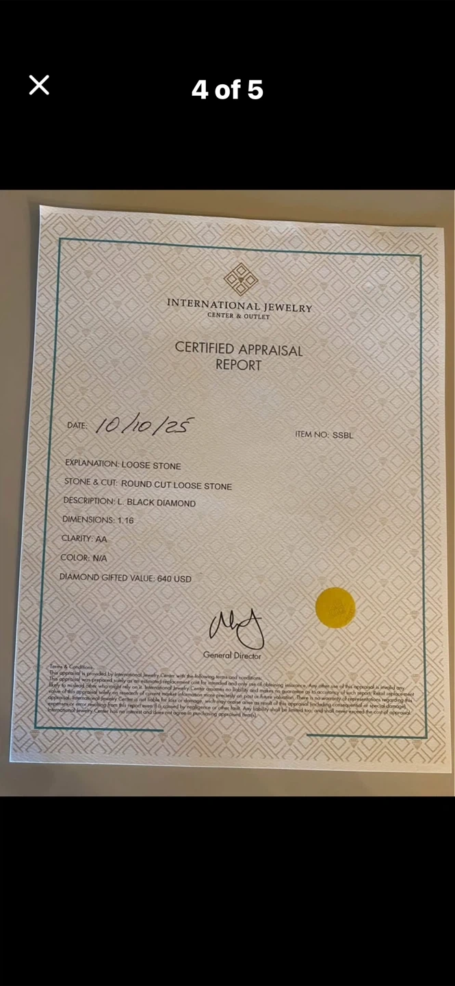 Selling a loose, round cut black diamond. It's 1.16 carats with AA clarity. The appraisal report is from International Jewelry Center & Outlet. The appraisal report is dated for 2025 October 10 and the diamond was gifted for $640 USD