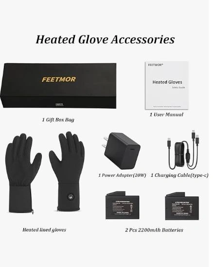 FEETMOR heated gloves feature a USB-C rechargeable 7.4V 16.28Wh battery and 20W PD adapter. Delivers faster heating, longer life, and more stable warmth than standard batteries—all in a compact, portable design.