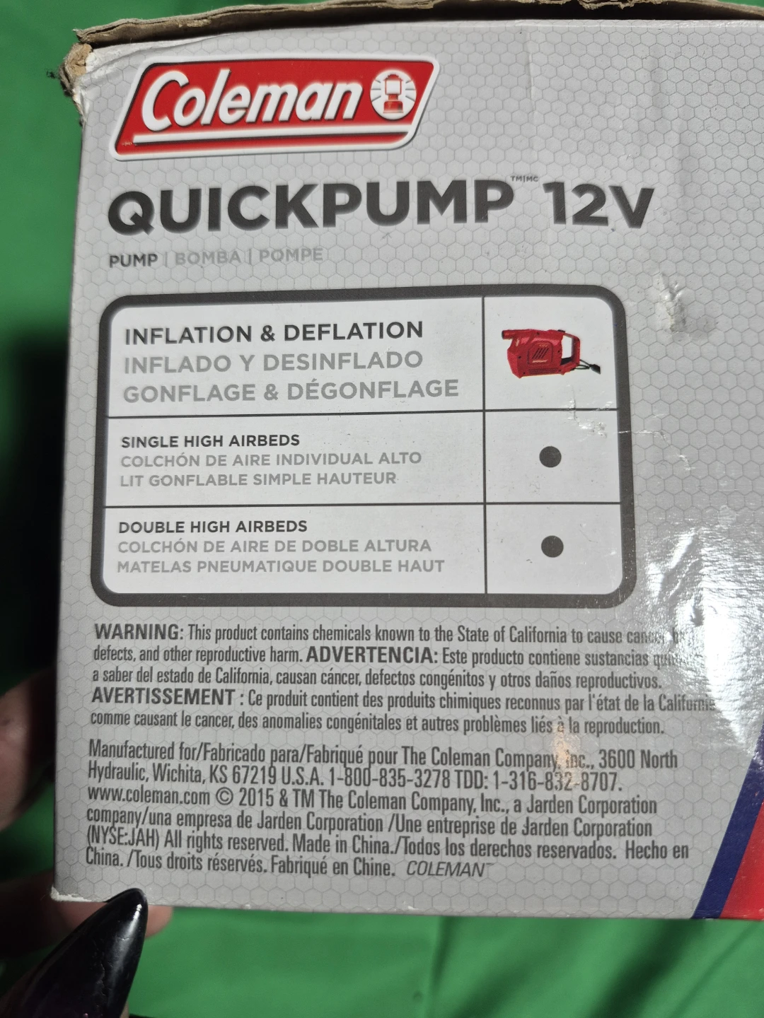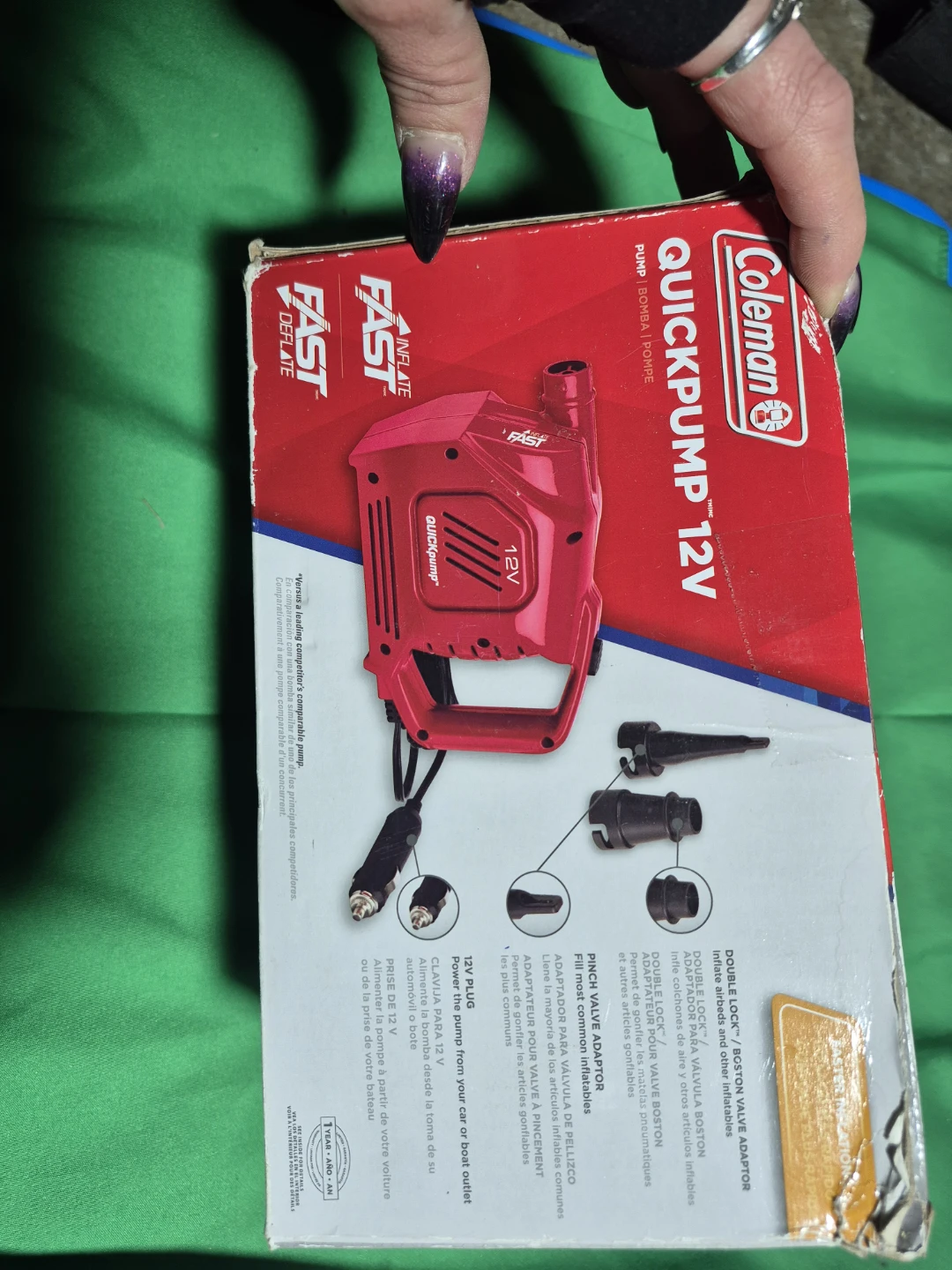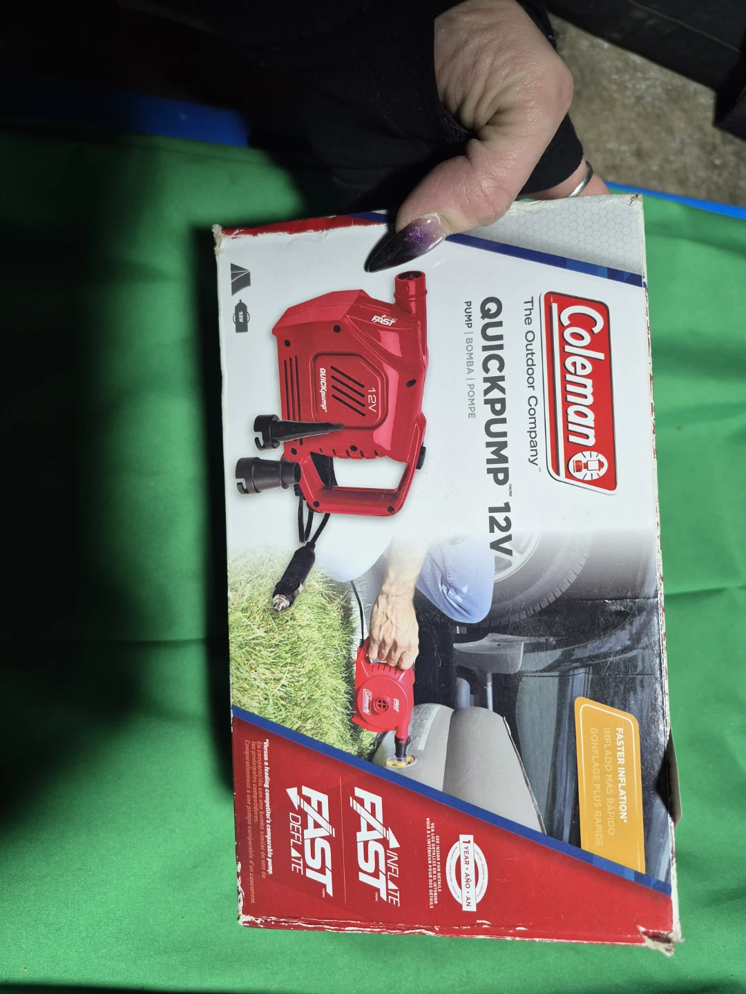 Selling a Coleman Quickpump 12V in excellent condition! This handy pump is perfect for inflating airbeds and other inflatables. It features both inflation and deflation capabilities, making it super versatile for all your needs. Get ready for camping or beach trips with this reliable pump!