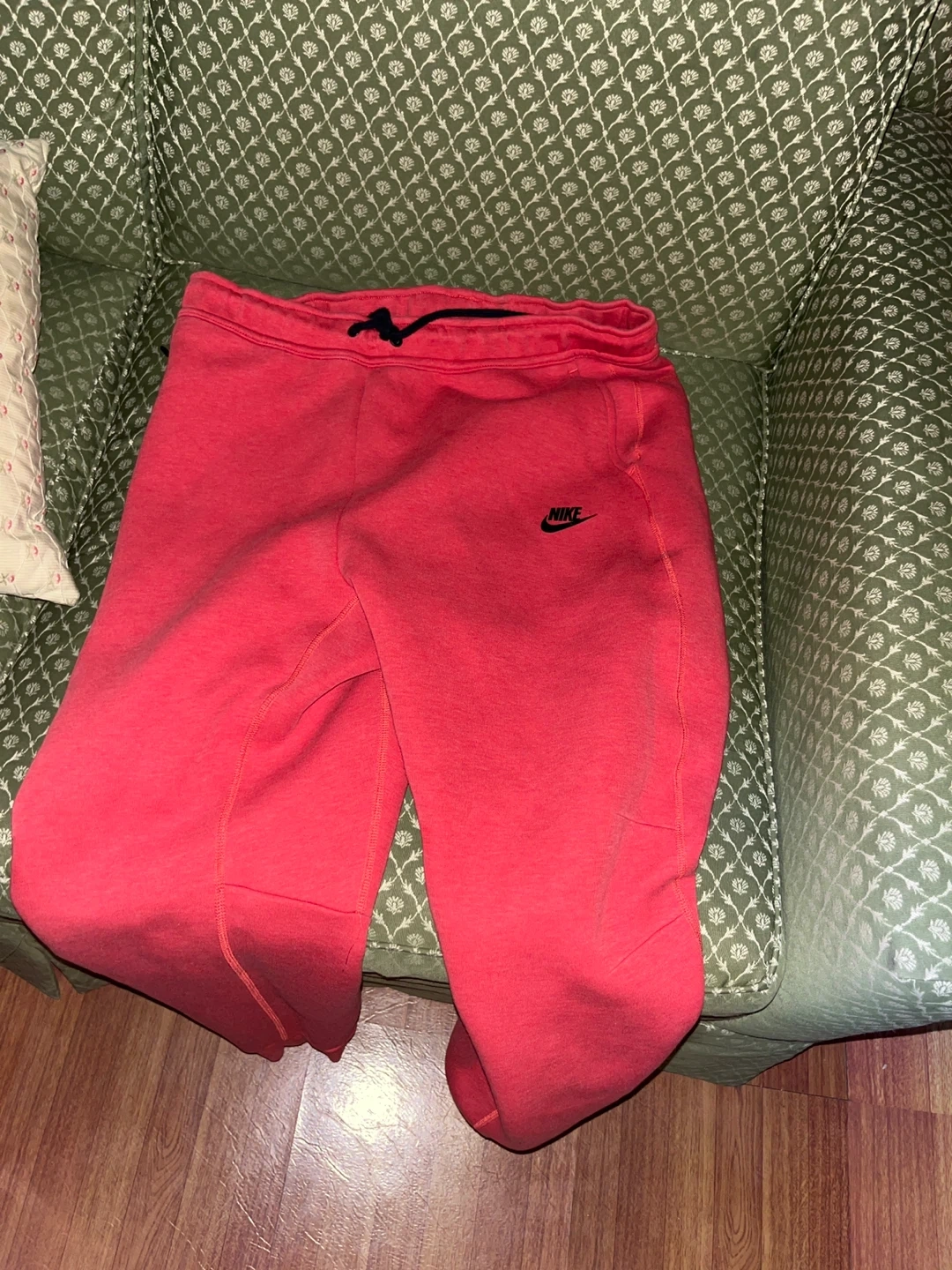 Selling a pair of Nike Tech Fleece sweatpants in red. They're in good condition and perfect for lounging or working out! The Nike logo is visible on the upper left leg.