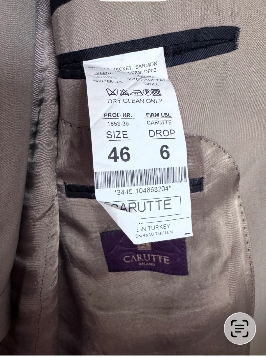 Selling a Carutte Milano suit in size 46. It's in great condition and ready for a new owner! The material is 100% acetate twill.