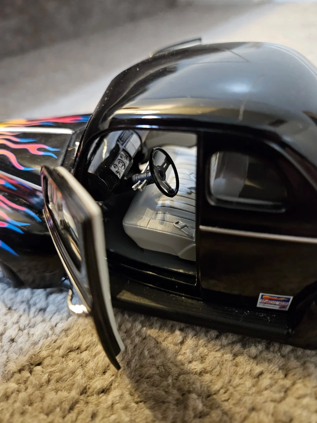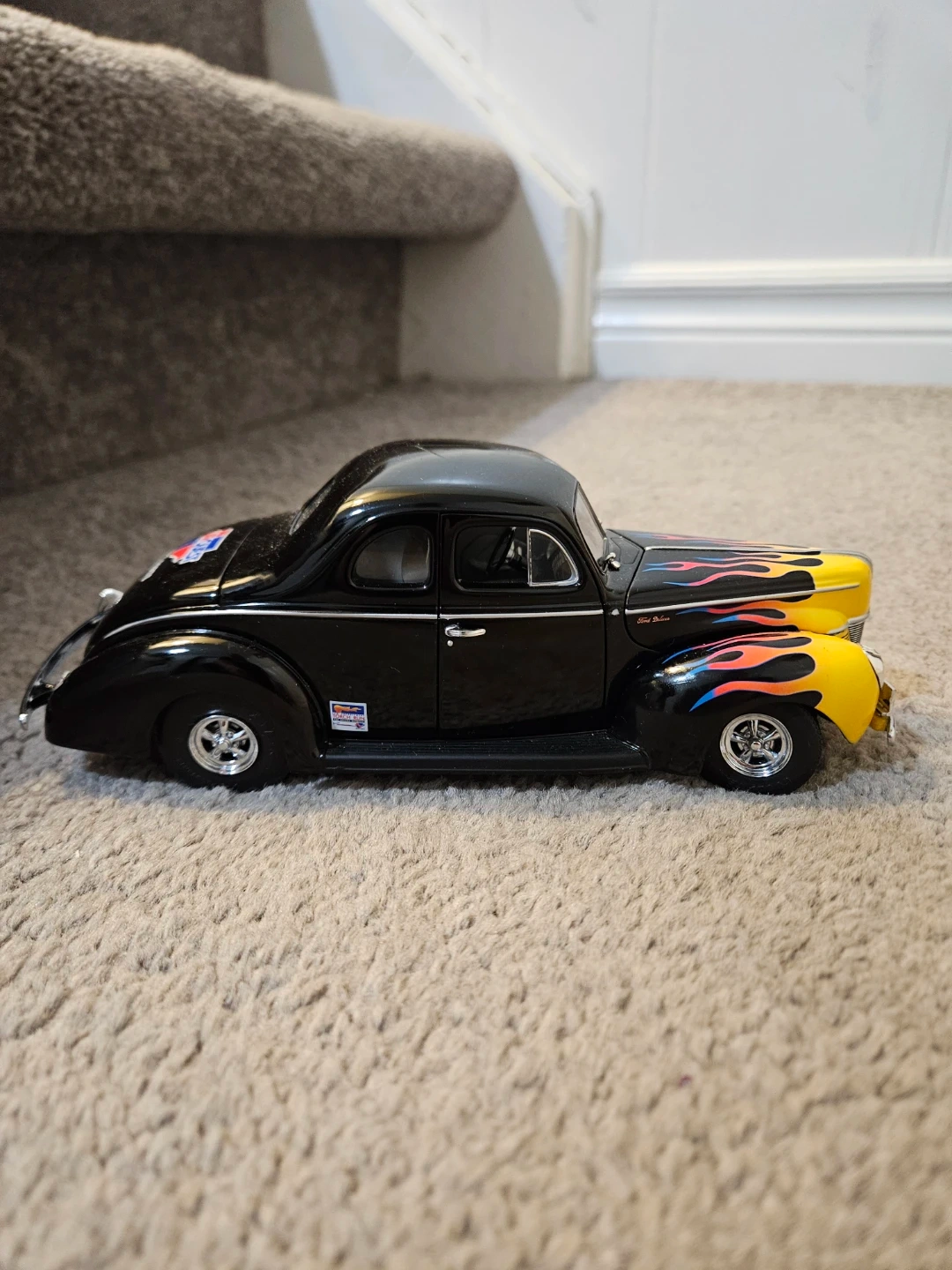 Selling a diecast model of a 1940 Ford Deluxe Coupe. It's a black car with a flame design on the front. The doors and trunk open, revealing interior details and luggage