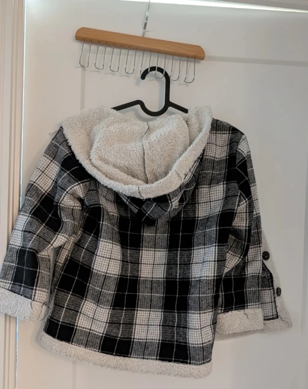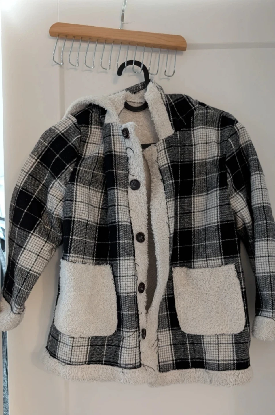 Cozy plaid jacket with a soft sherpa lining! It's in great condition and perfect for staying warm on chilly days. Features a classic black and white plaid pattern with sherpa trim on the collar, cuffs, and pockets