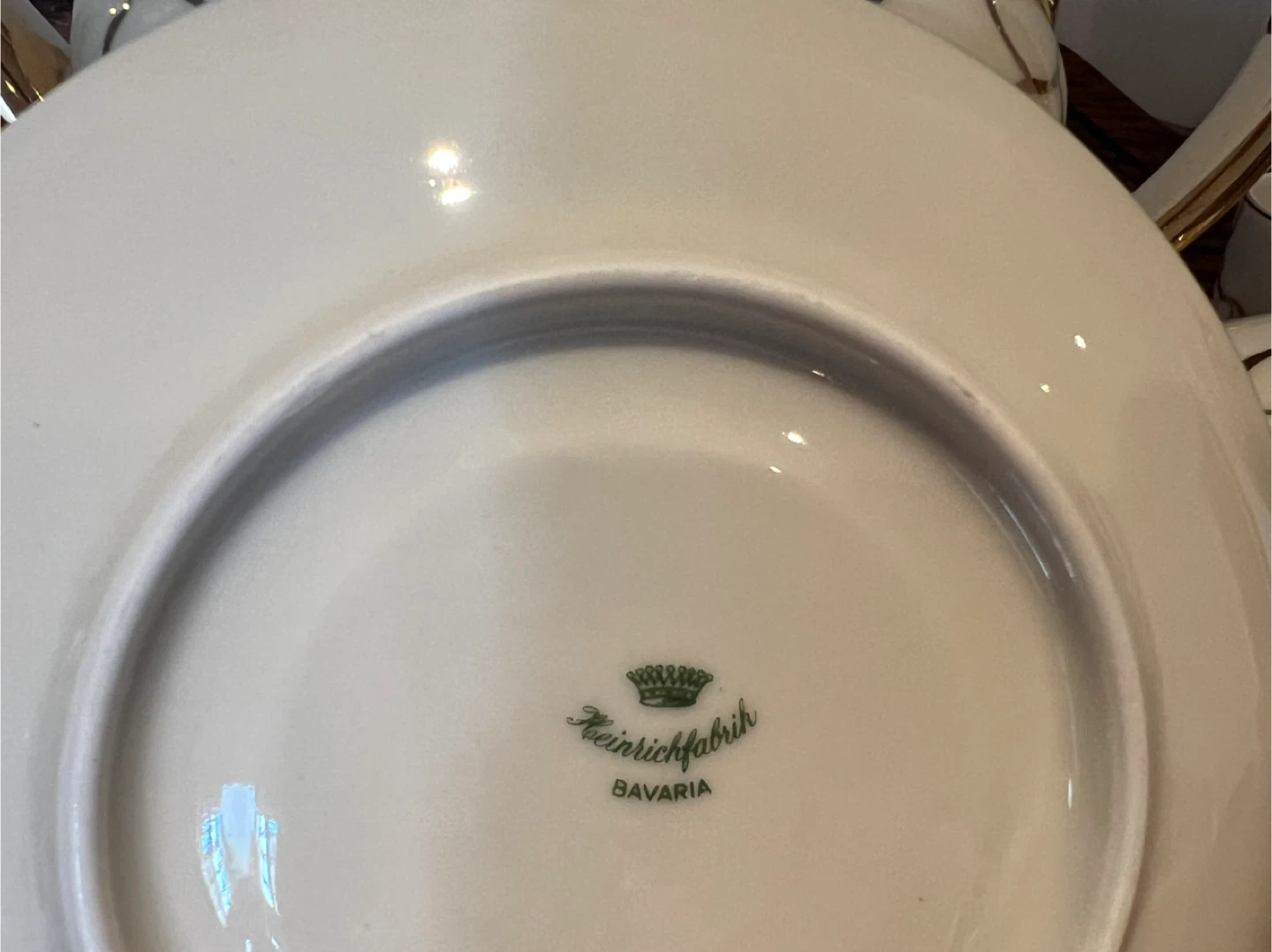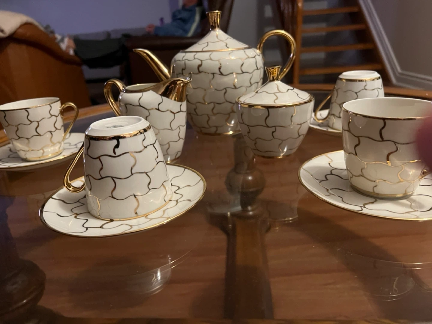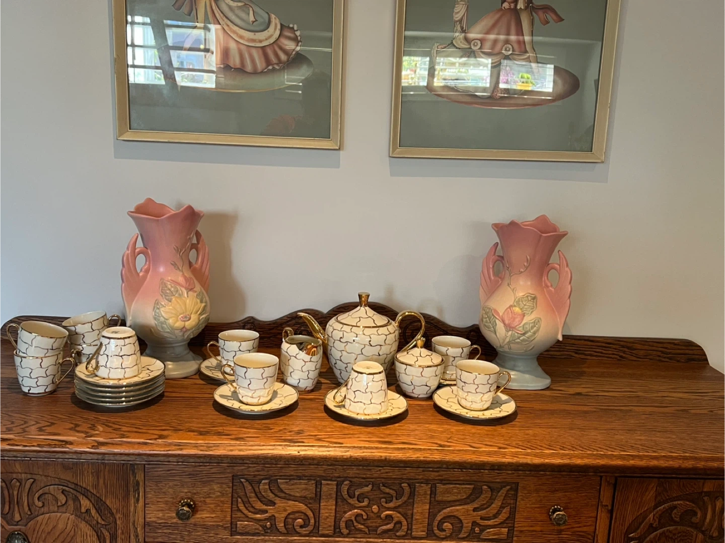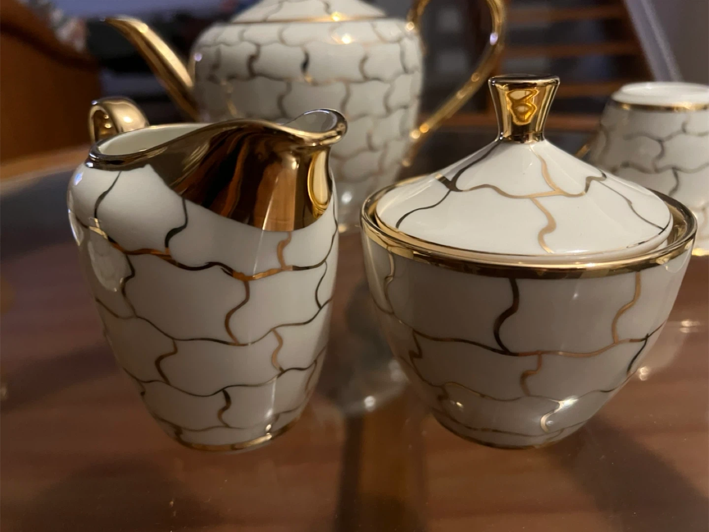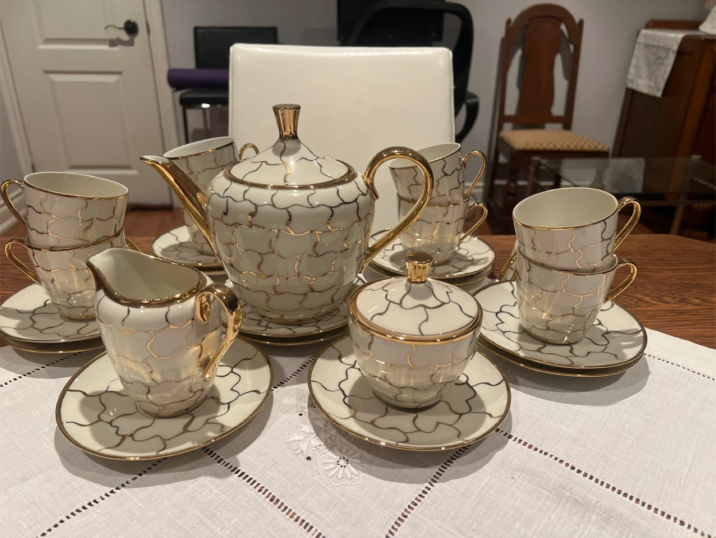 Selling a beautiful vintage tea set! It includes a teapot, creamer, sugar bowl with lid, and several cups and saucers. The set is cream-coloured with gold accents, giving it a classic and elegant look. Perfect for tea parties or adding a touch of vintage charm to your home!