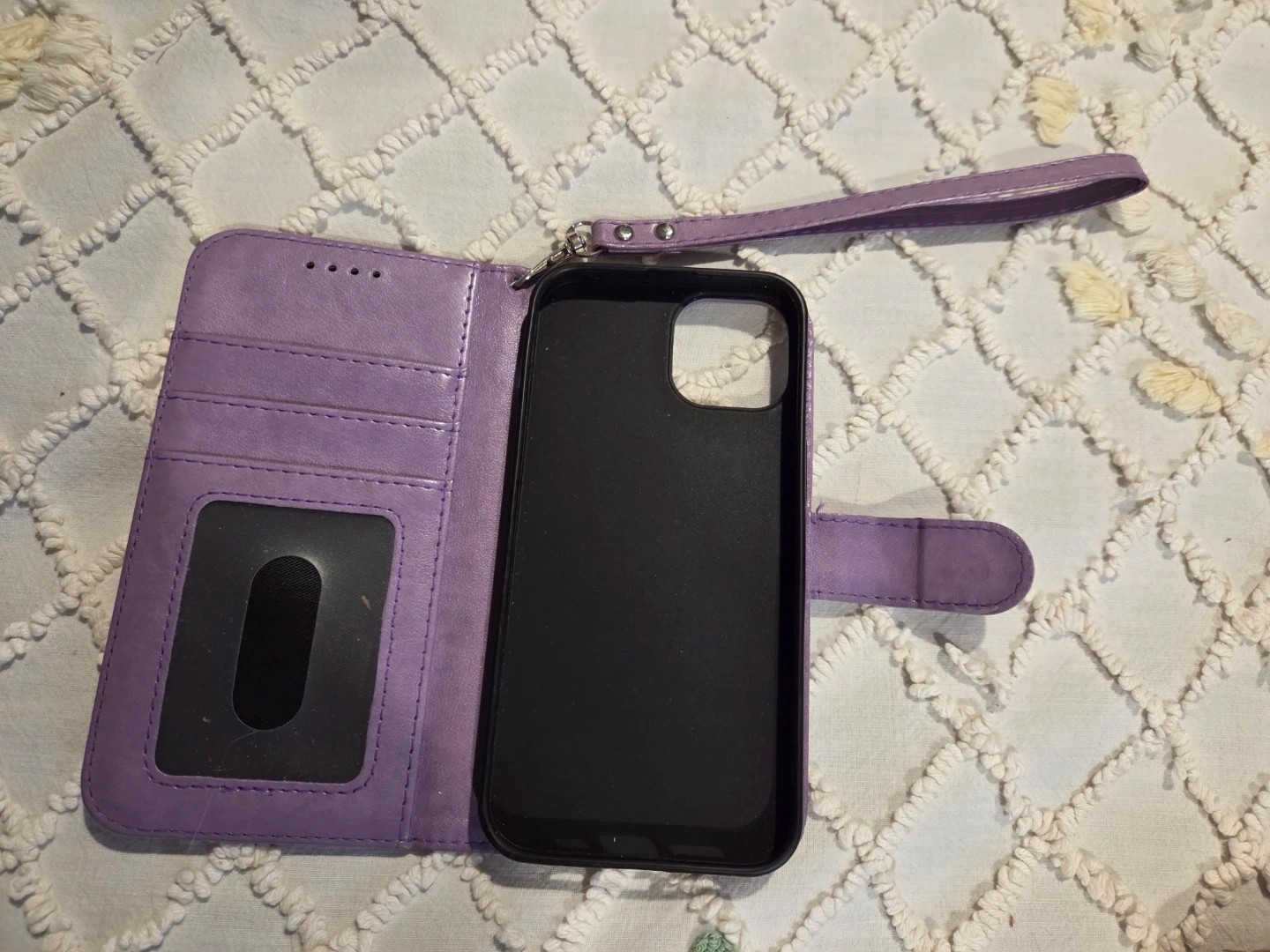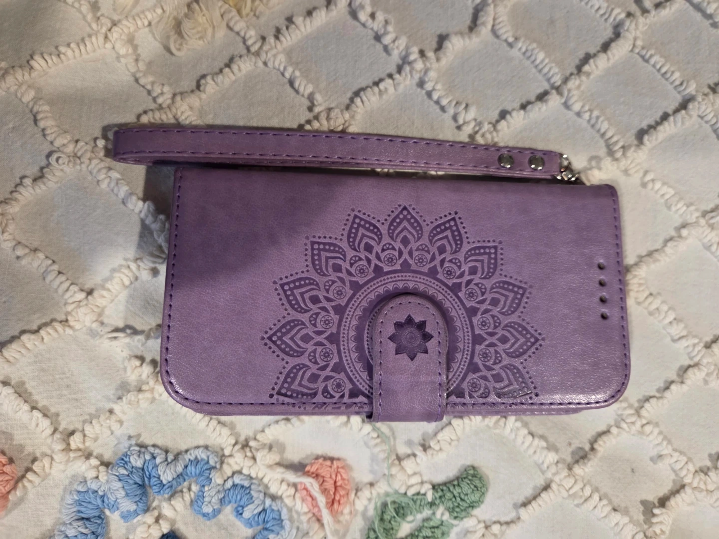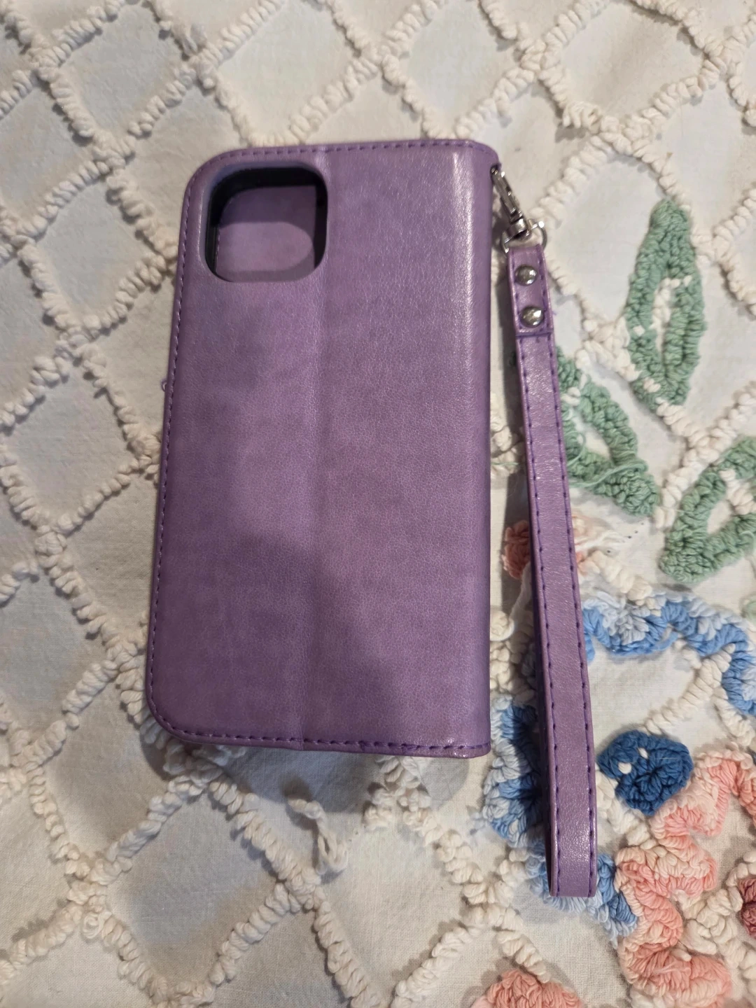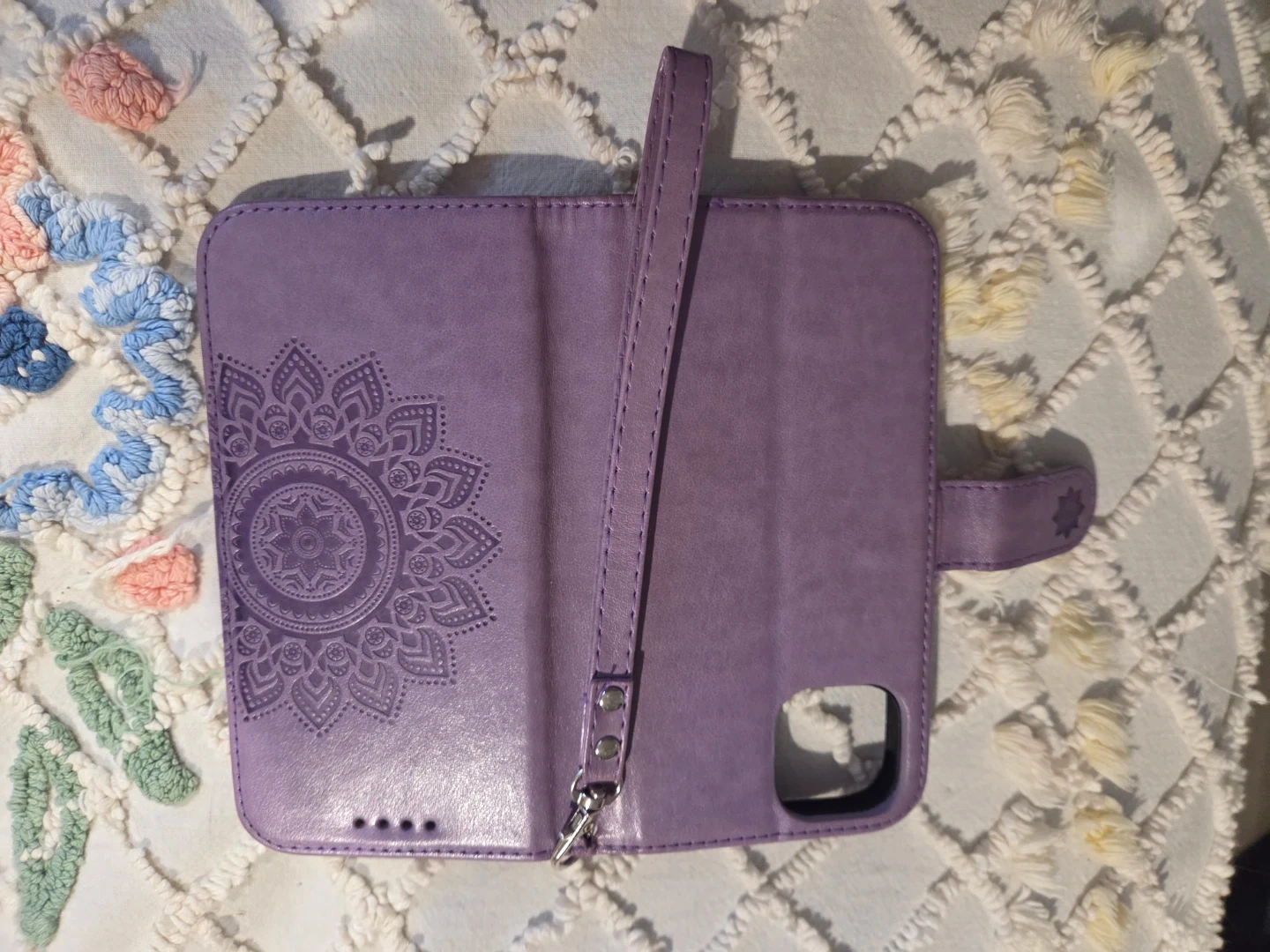 Selling a cute purple iPhone 13 case with a mandala design! It's a wallet-style case with a wrist strap, perfect for keeping your phone and cards together. In great condition and ready for a new iPhone 13!