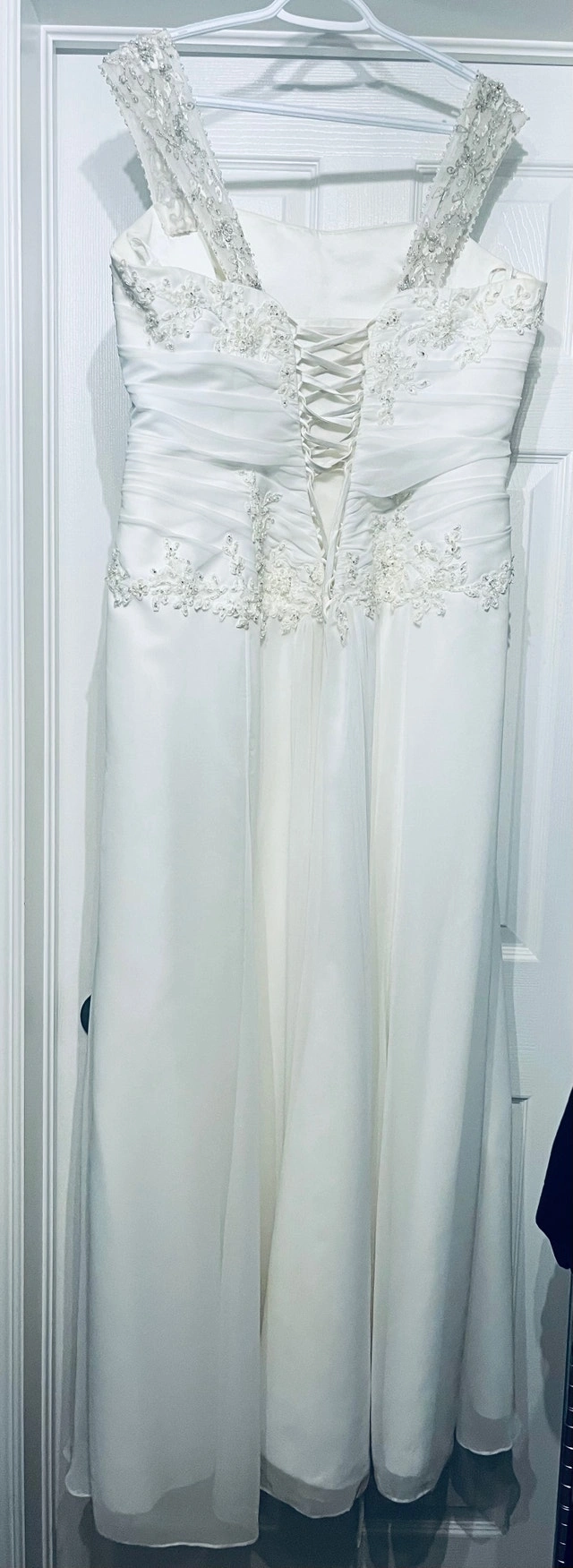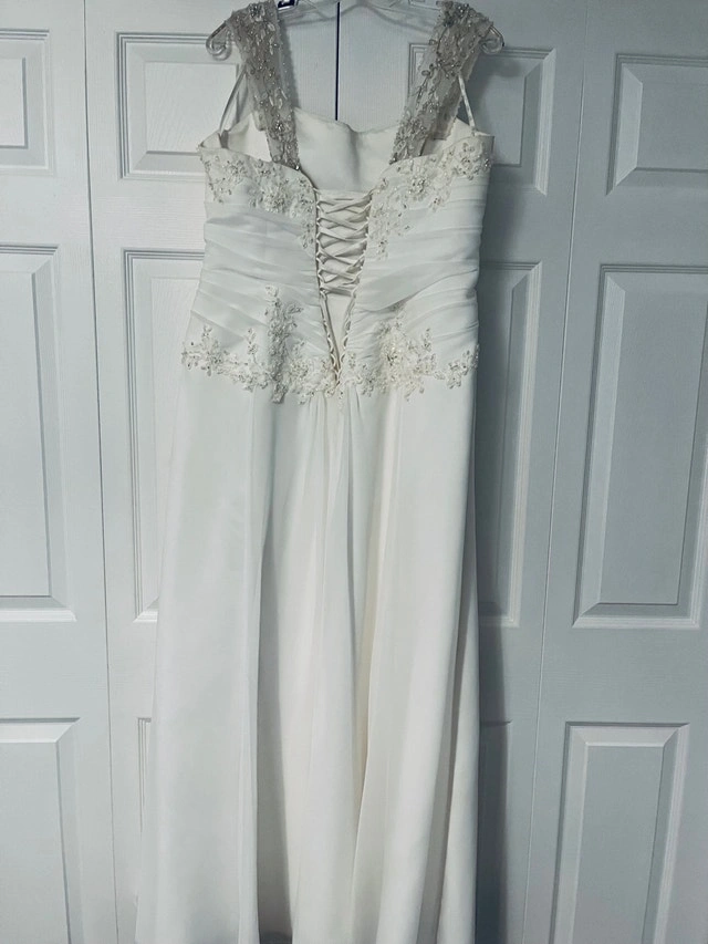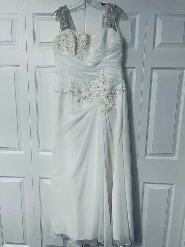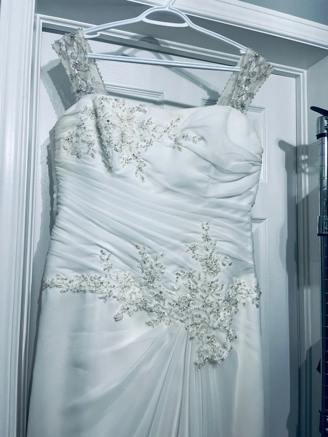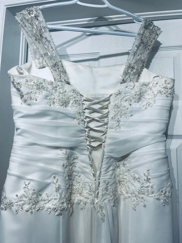 Maggie sottero wedding dress designer. Originally the dress is made strapless, but I added some rhinestones straps. (They can easily be removed if preferred) Size 16 white dress. Since the back is lace up, it can fit a size below(14) or above (18) Used it for a destination wedding, could use a dry cleaning. Pick up in stittsville. For Sale By: Owner