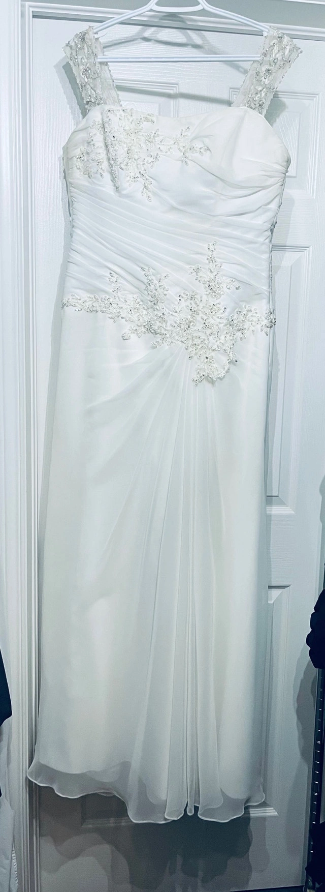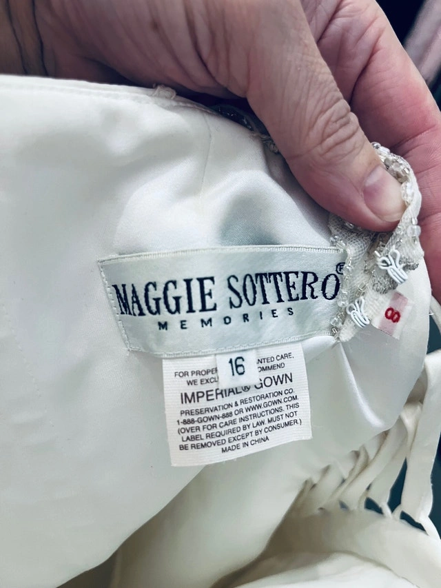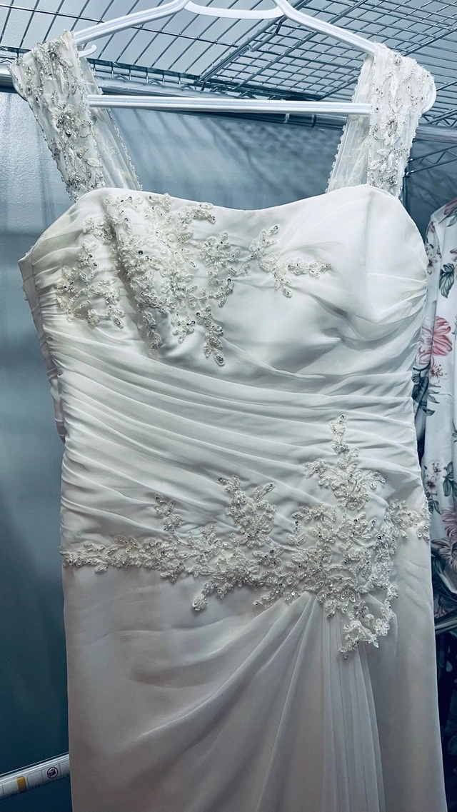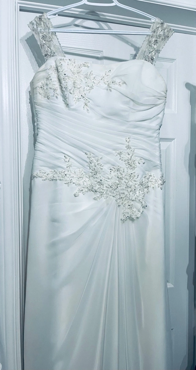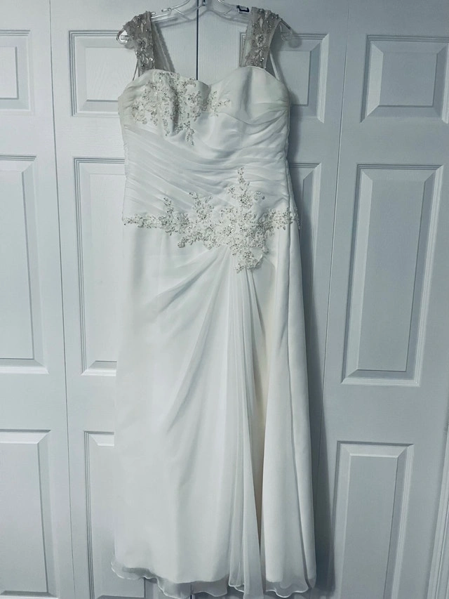 Maggie sottero wedding dress designer. Originally the dress is made strapless, but I added some rhinestones straps. (They can easily be removed if preferred) Size 16 white dress. Since the back is lace up, it can fit a size below(14) or above (18) Used it for a destination wedding, could use a dry cleaning. Pick up in stittsville. For Sale By: Owner