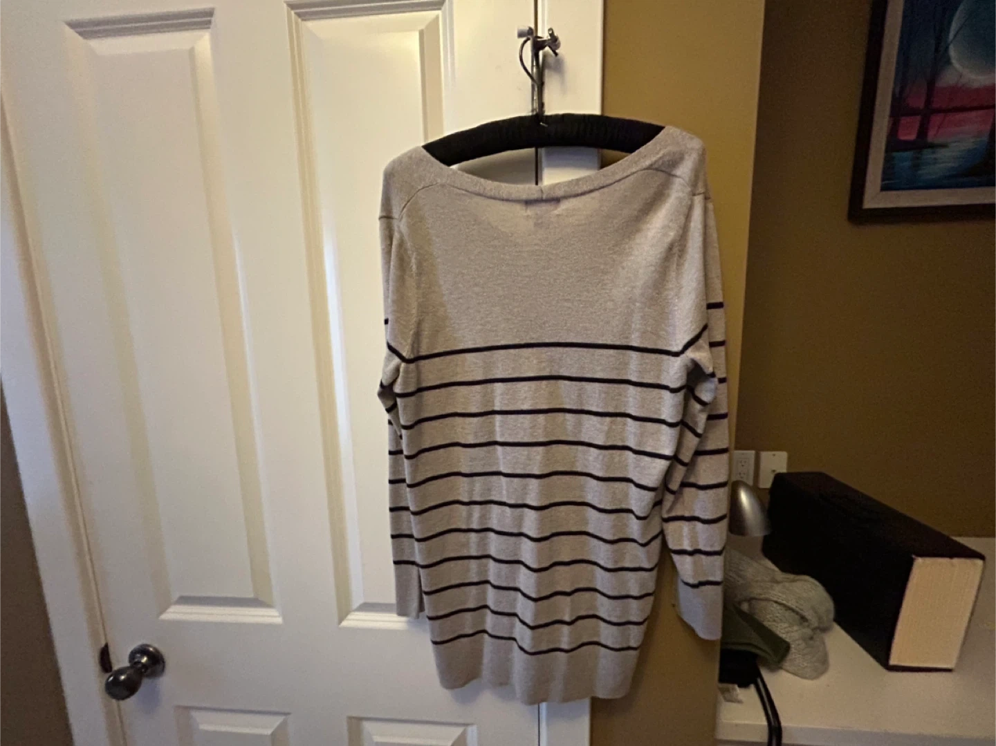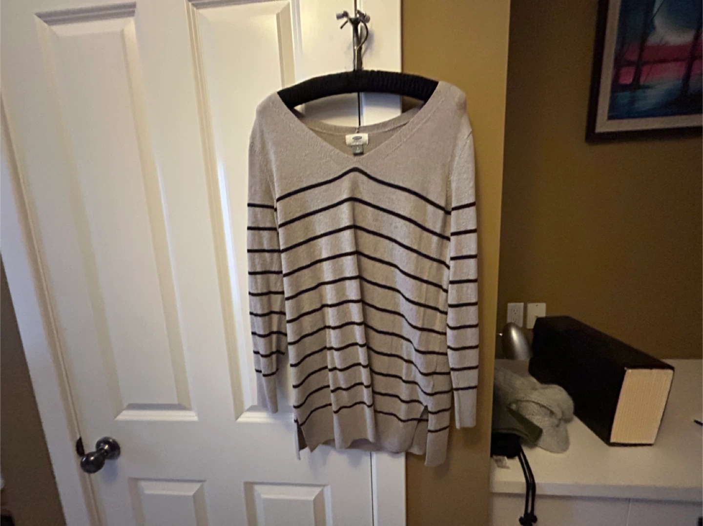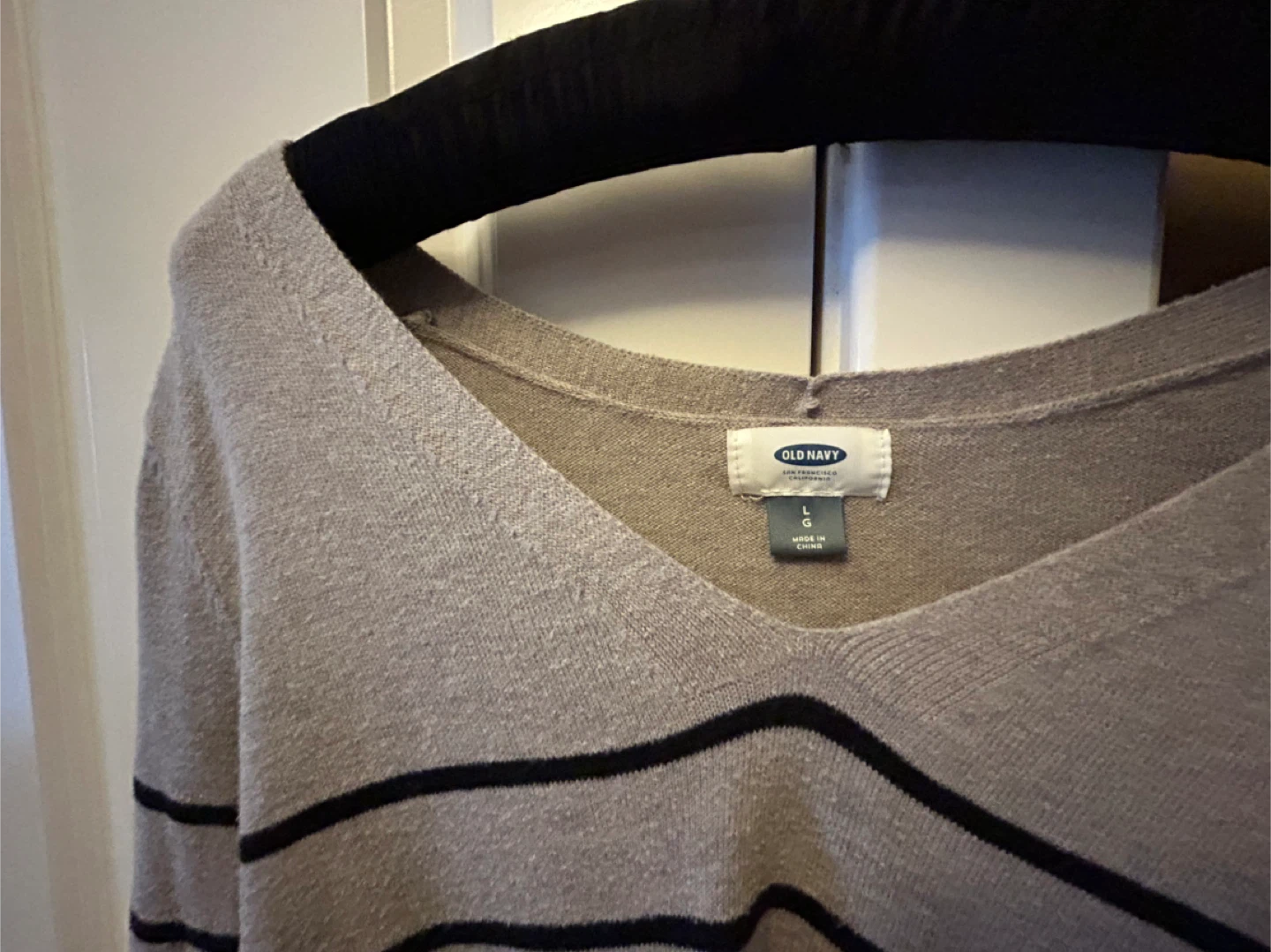 Selling an Old Navy sweater in size large. It's a beige colour with black stripes and a v-neck. Great for layering or wearing on its own!