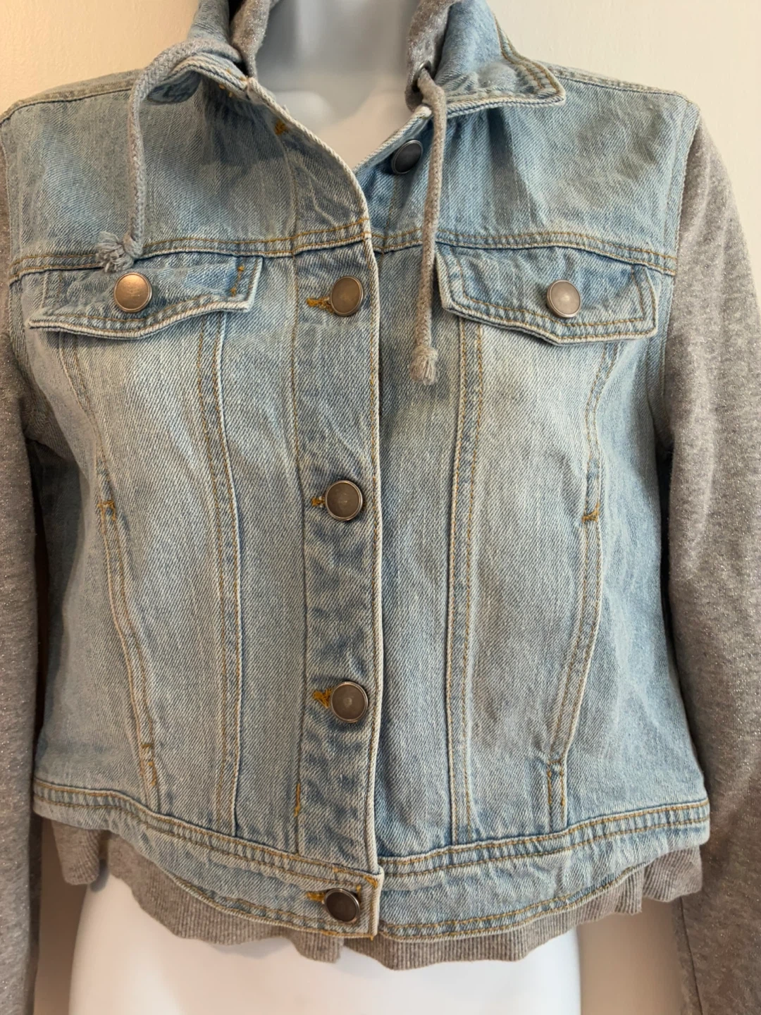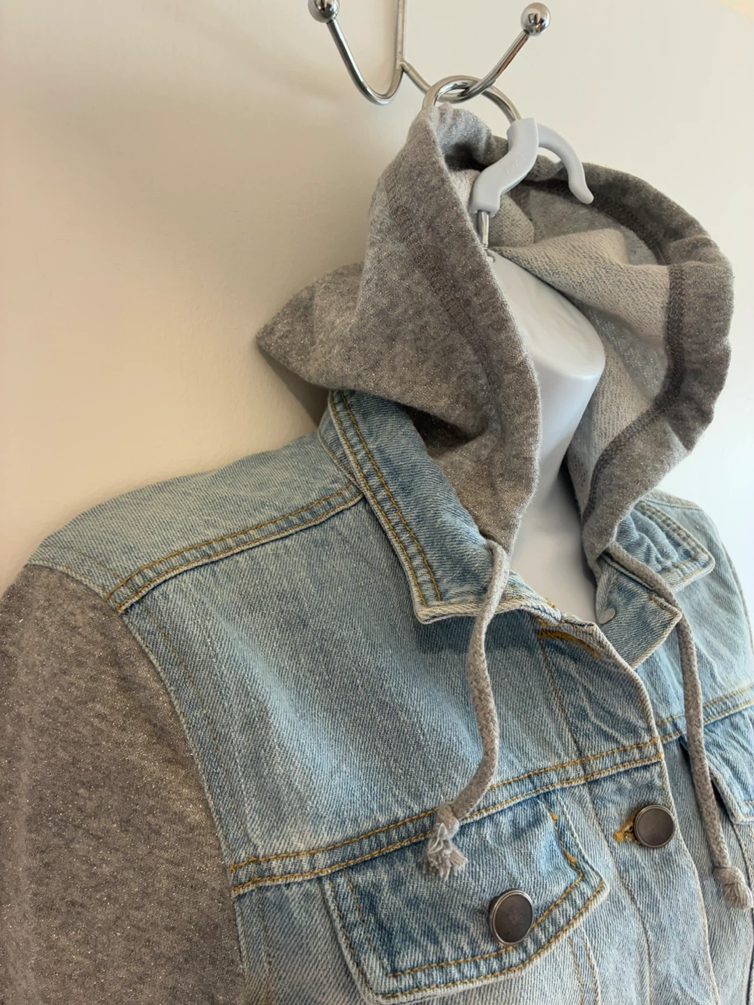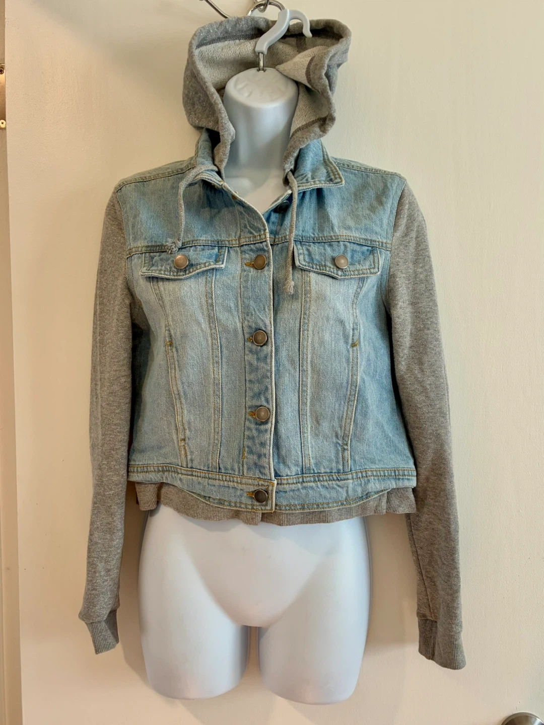 Here's a cute hooded denim jacket! It's a size medium and features a light wash denim body with gray knit sleeves and hood. Perfect for layering!