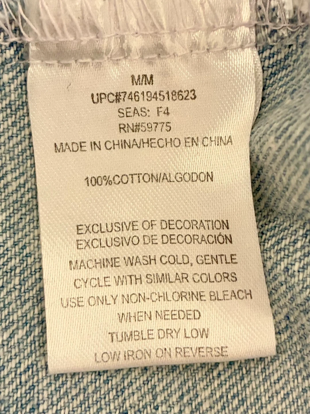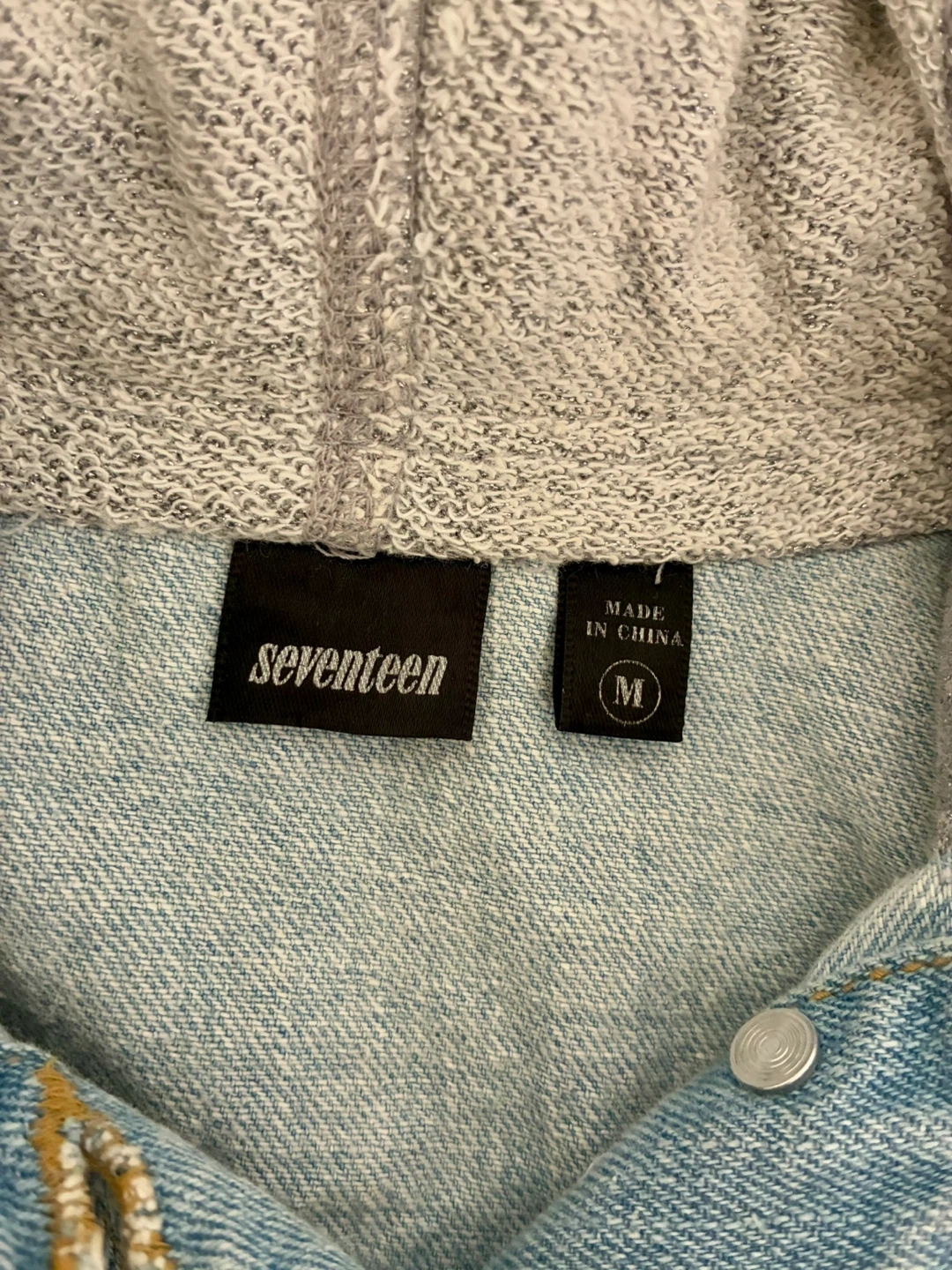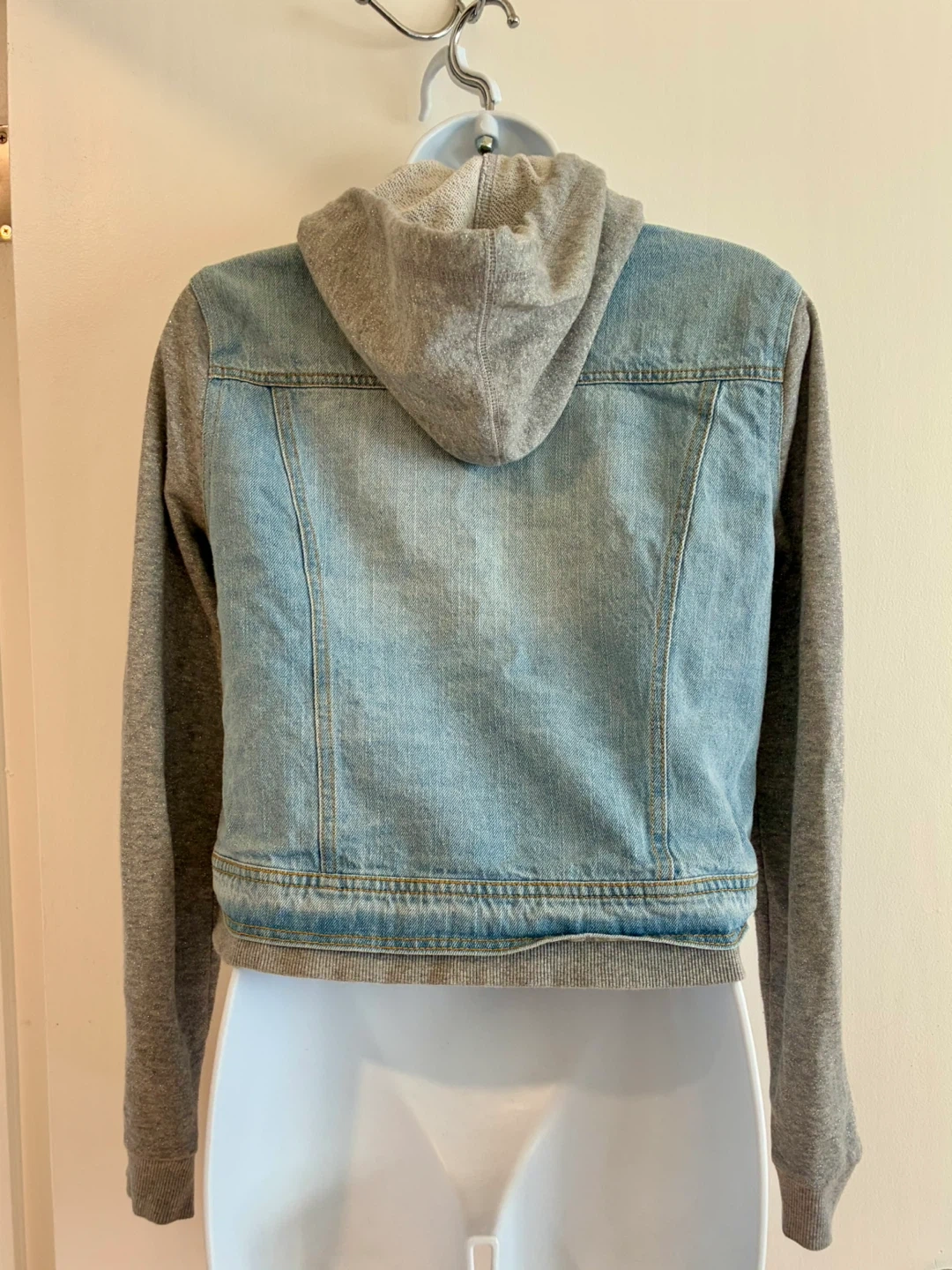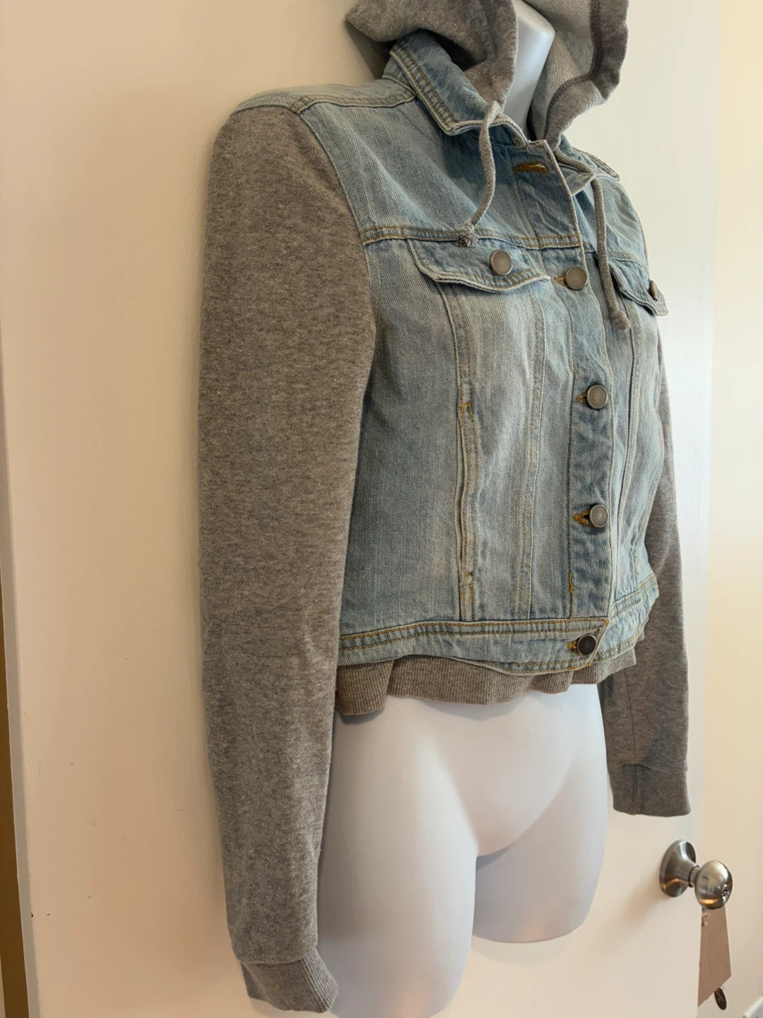 Here's a cute hooded denim jacket! It's a size medium and features a light wash denim body with gray knit sleeves and hood. Perfect for layering!