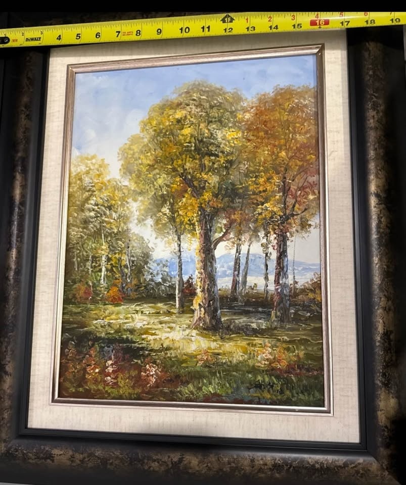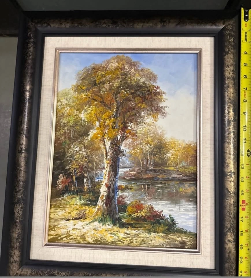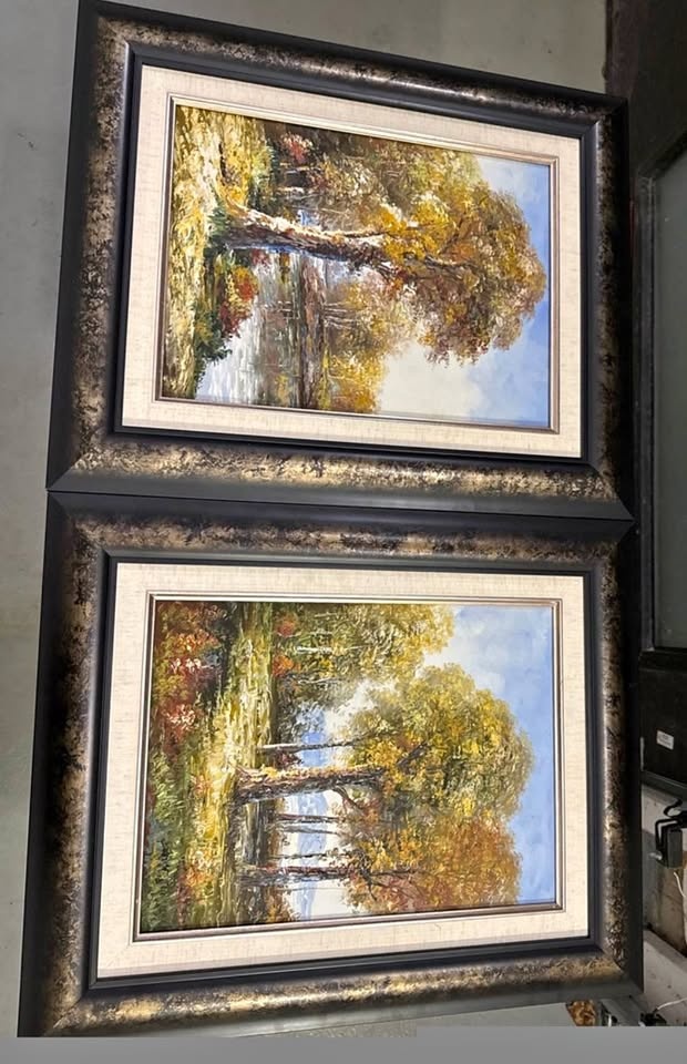 Offering a pair of beautiful framed art pieces, each capturing serene landscapes with vibrant, autumn-toned trees and reflective waters. The frames are ornate and complement the art perfectly. Displayed for staging.
