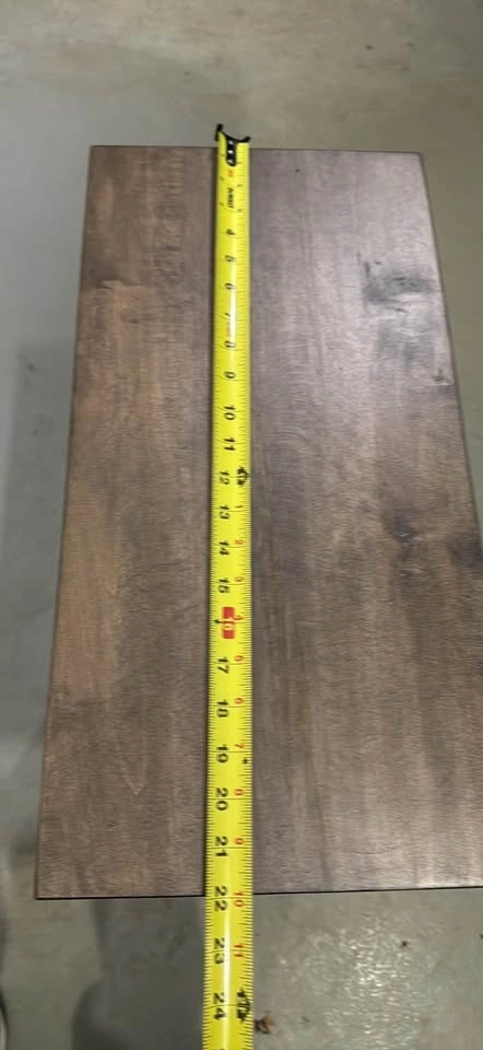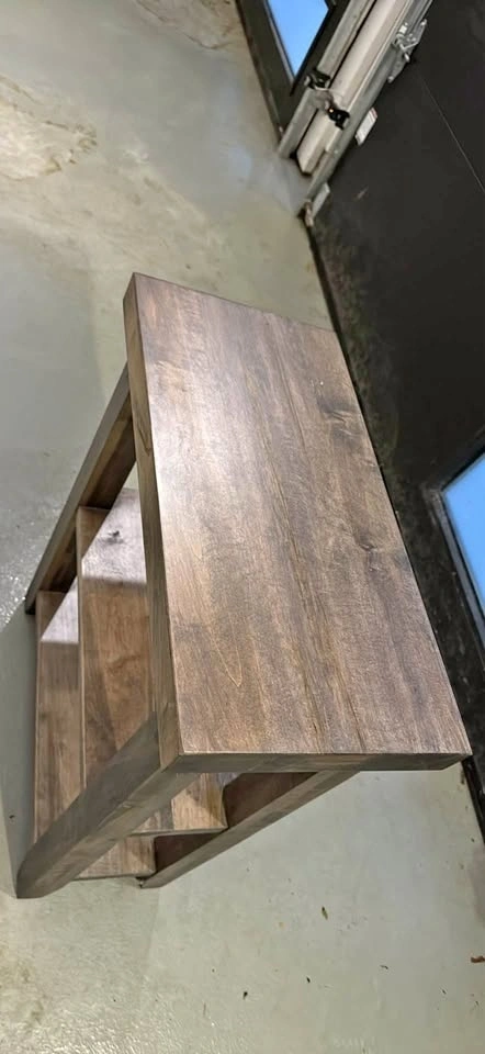 A solid wood side table with a rustic charm, perfect for adding a touch of warmth to any room; with dimensions of 30" height x 22" length x 14" width, this used table is sturdy and features two shelves for extra storage or display.
