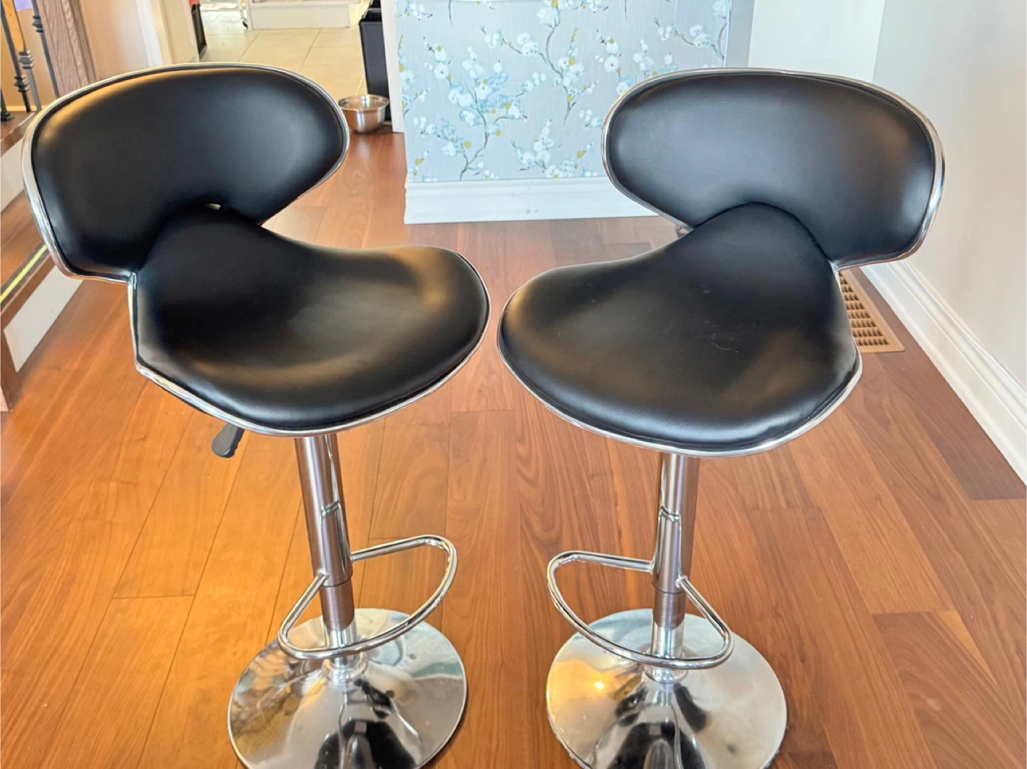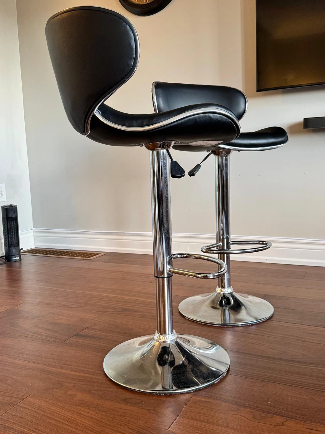 Selling a set of two adjustable bar stools! They feature a sleek black design with a chrome base. These are perfect for adding a modern touch to your kitchen or bar area. They're sparingly used and in great shape and ready to be used!