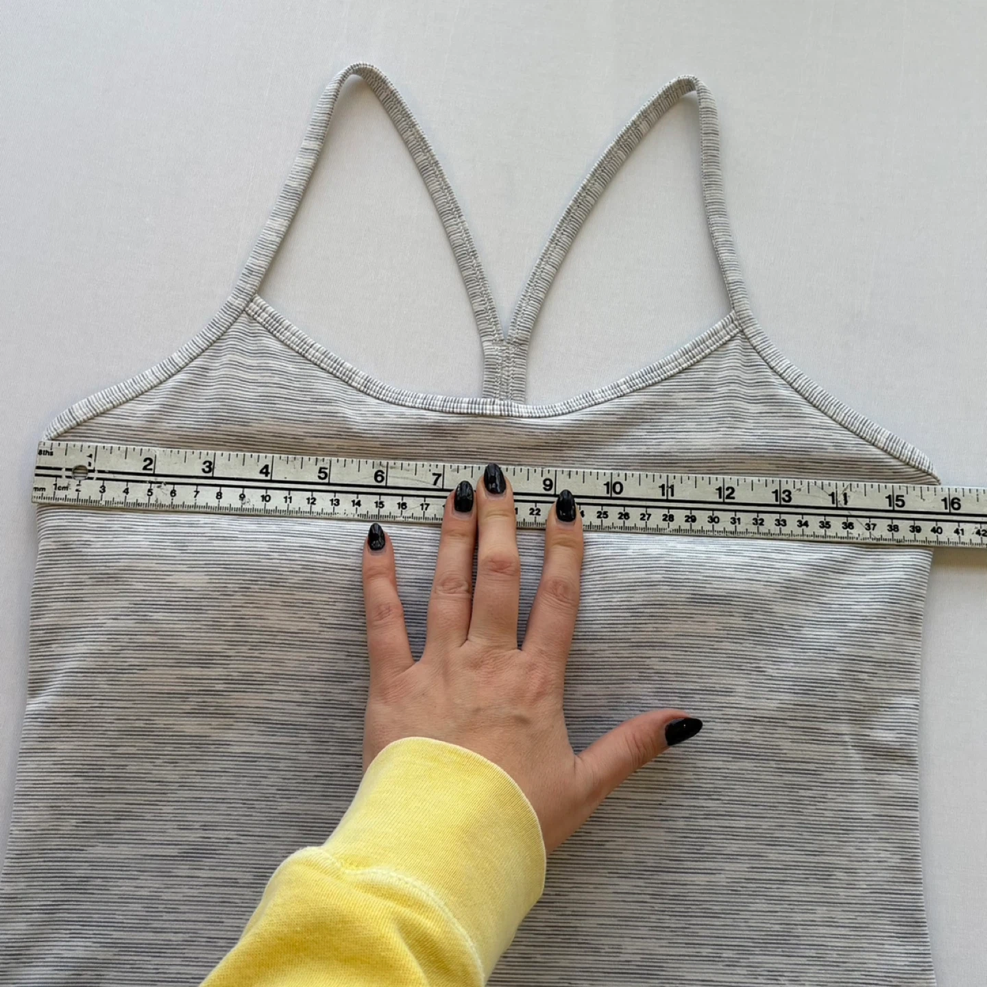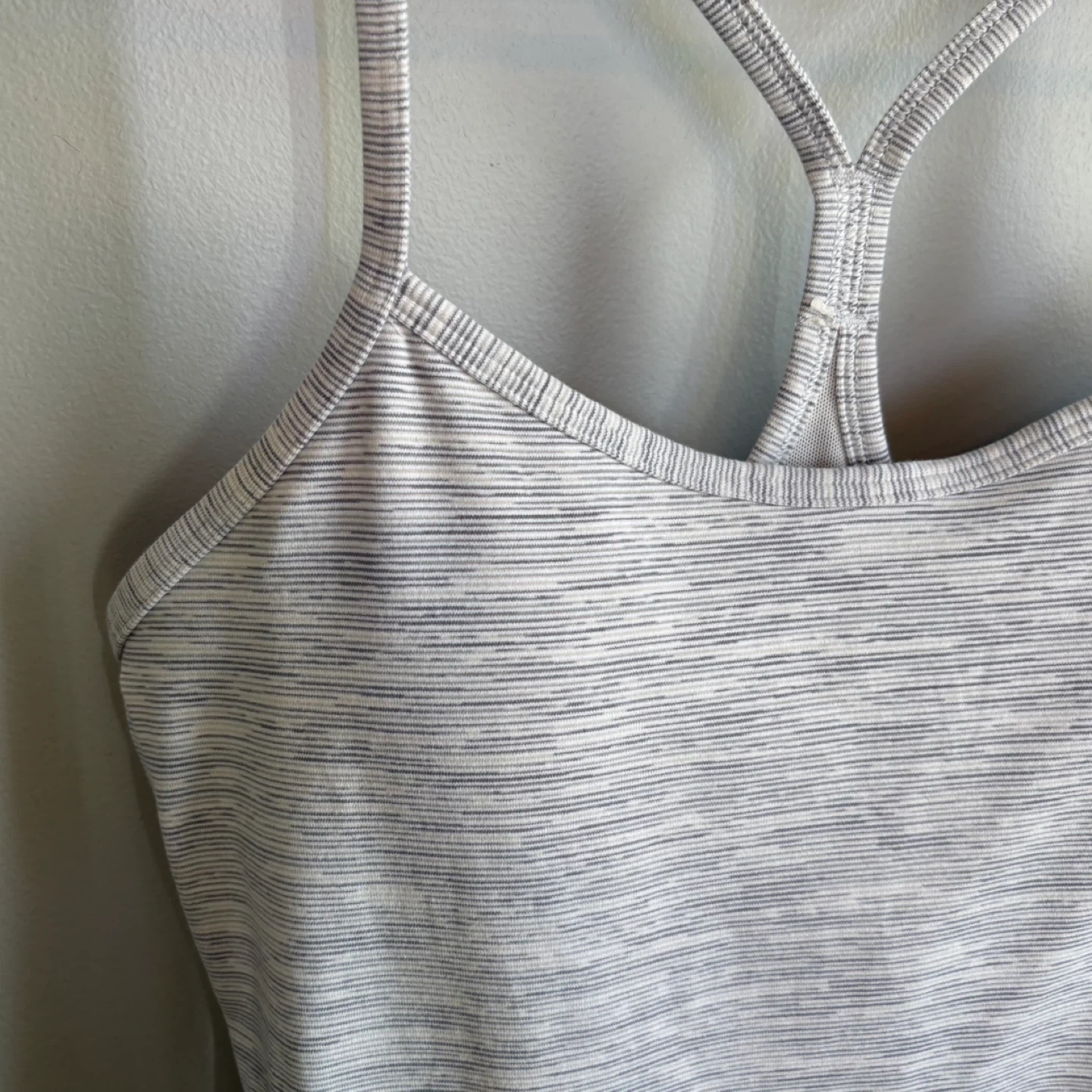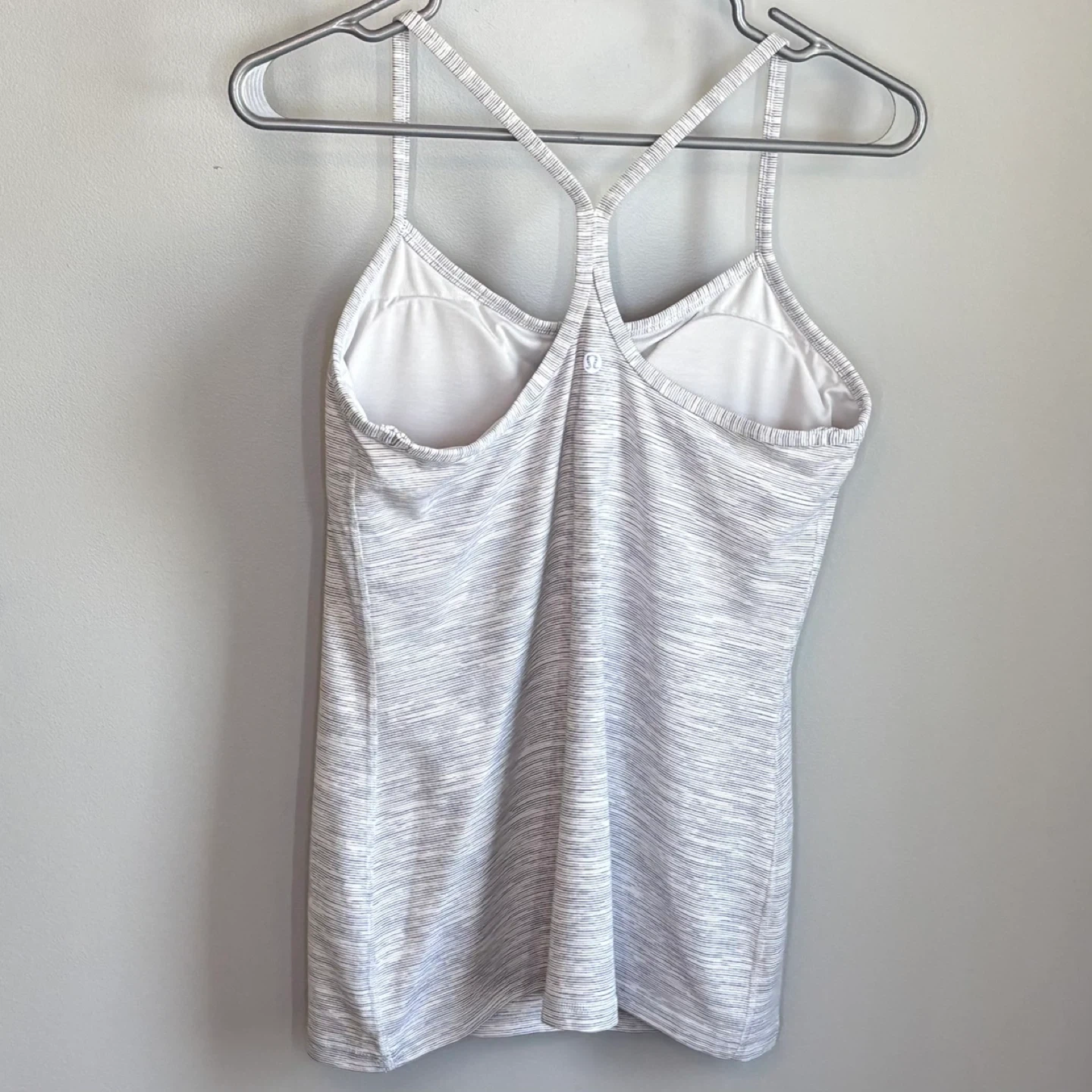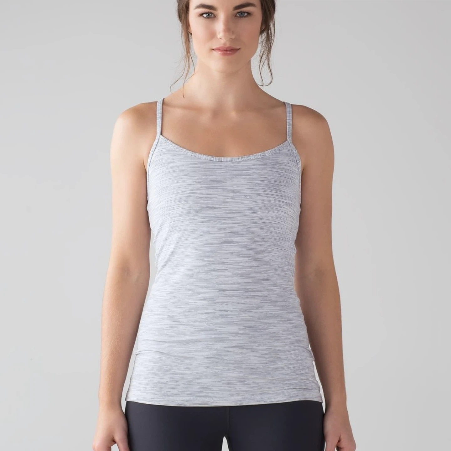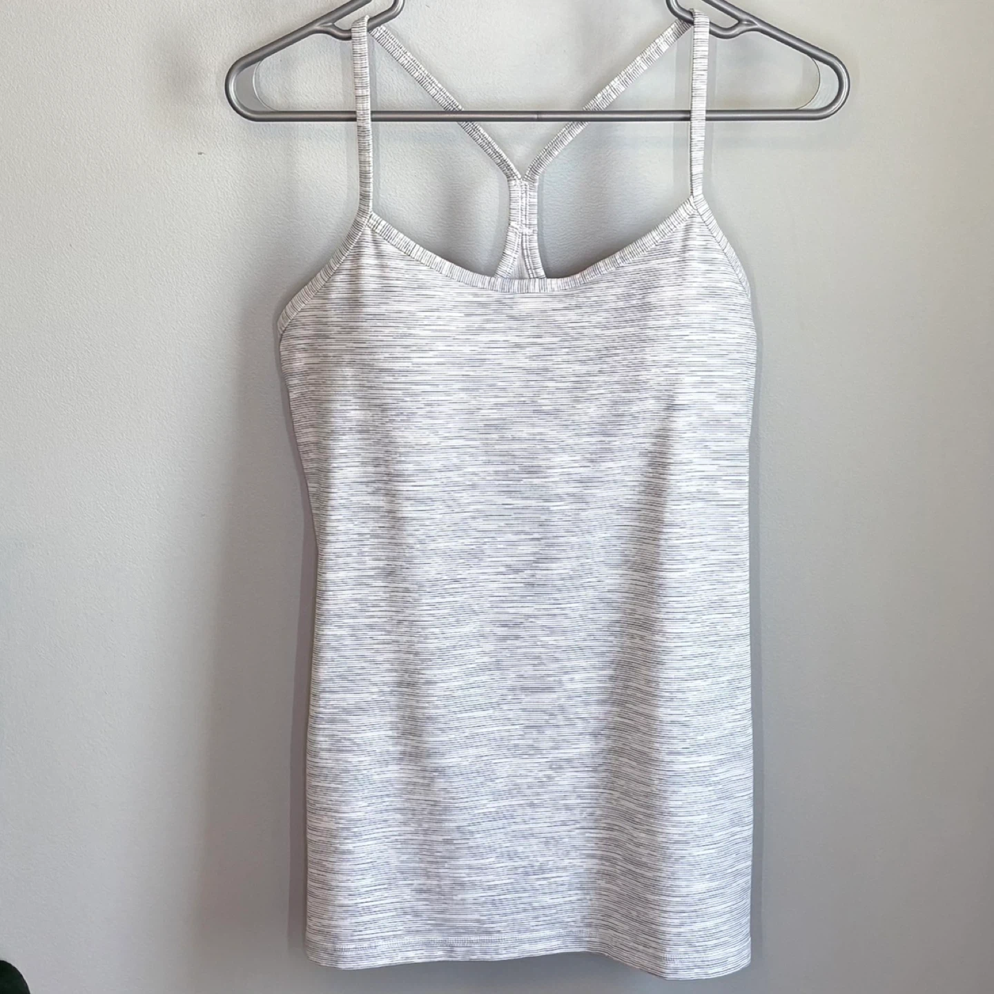 Stay comfortable and supported during your yoga or gym sessions with this classic Lululemon Power Y tank top in a versatile grey space-dye print. The Luon fabric is sweat-wicking and four-way stretch, featuring a built-in shelf bra for added convenience.