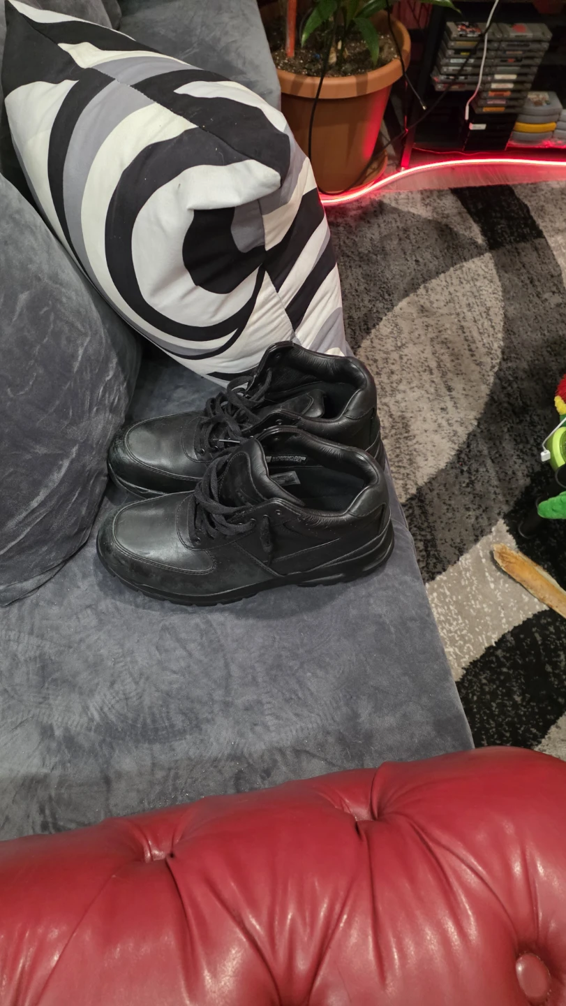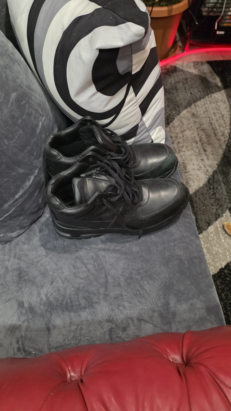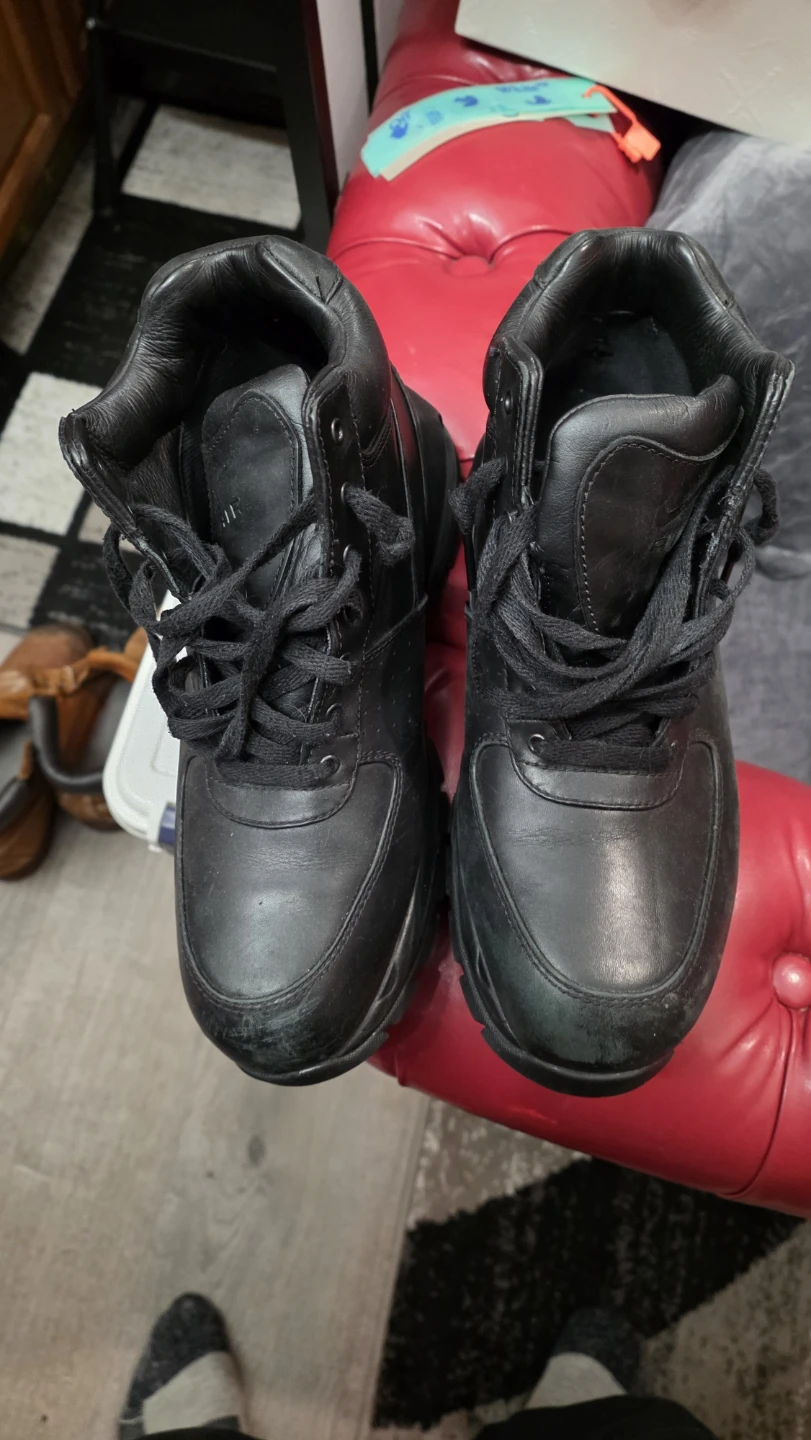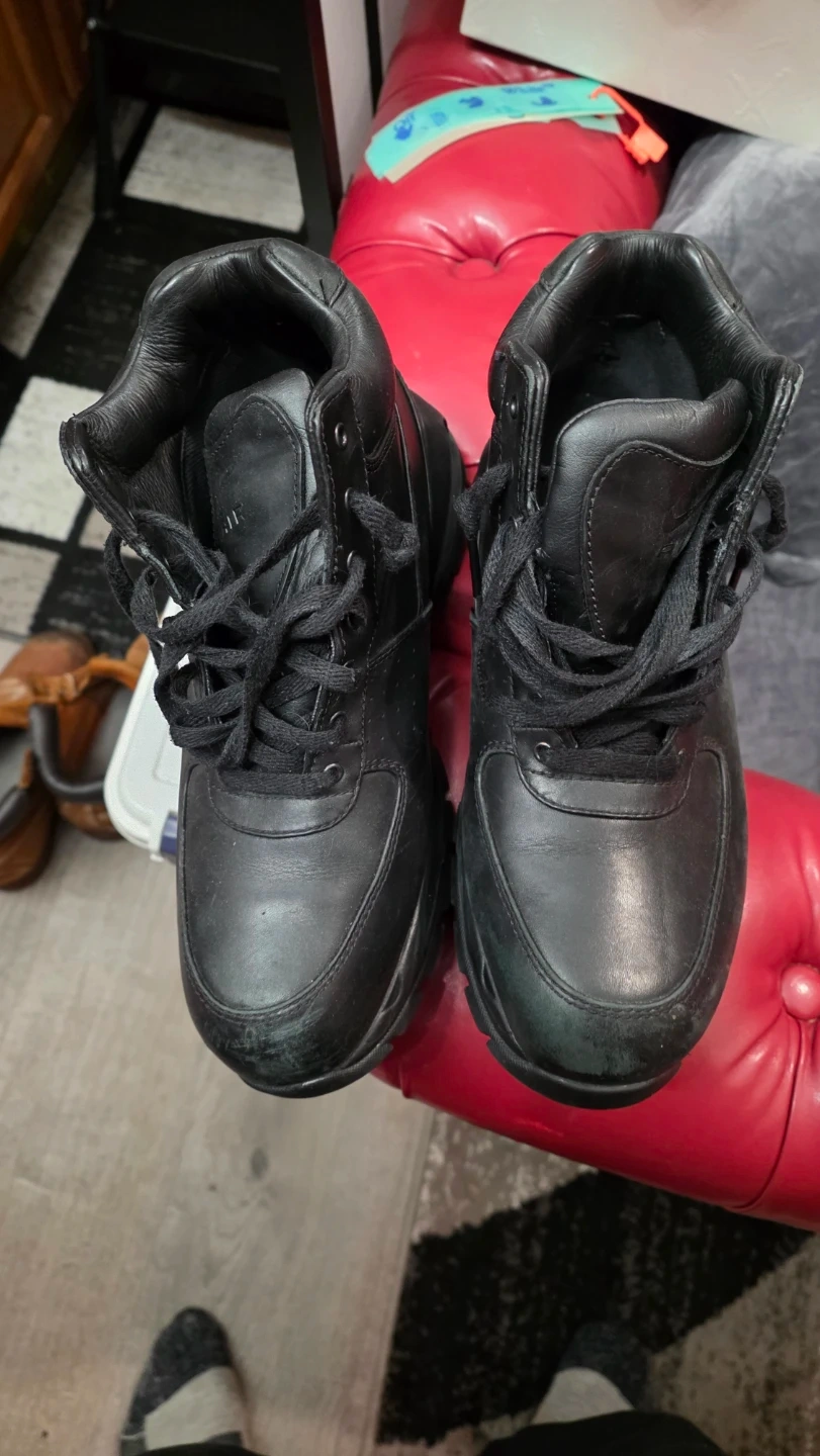 Selling a pair of black leather high-top sneakers. They show some signs of wear but still have plenty of life left! Great for casual wear or hitting the streets