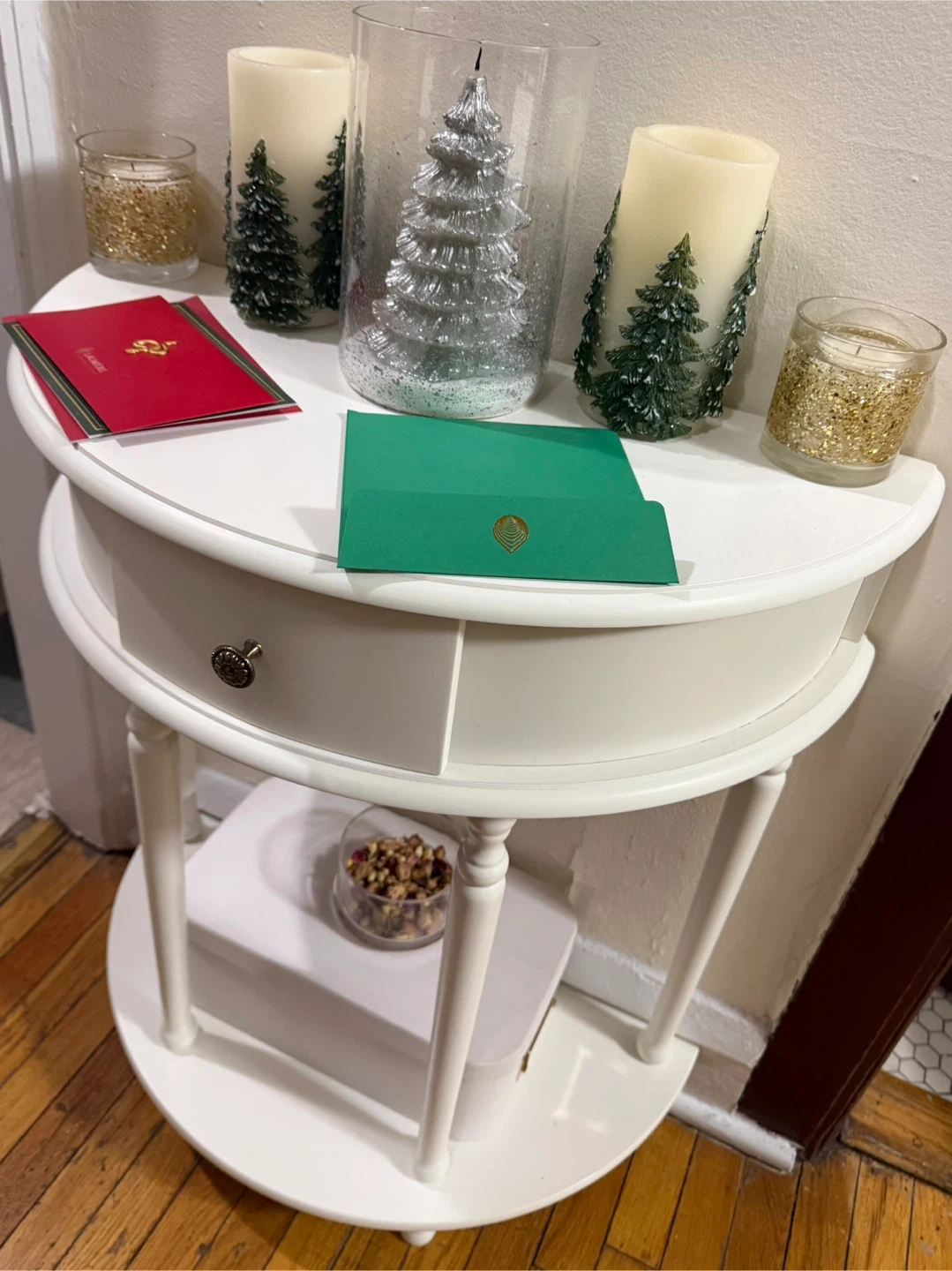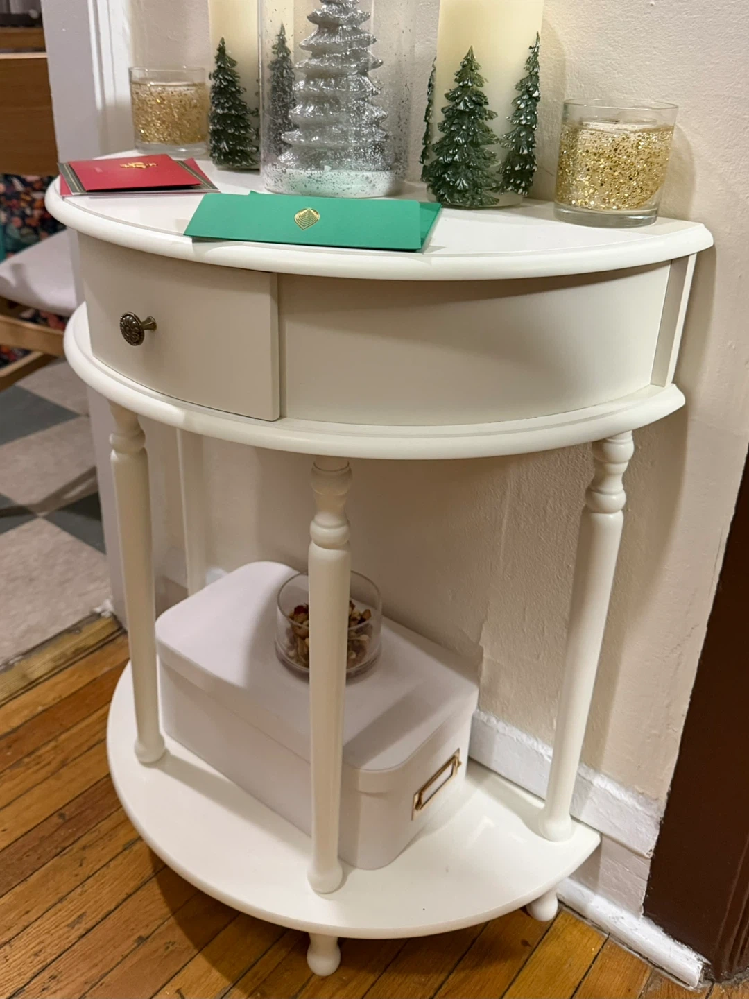 Selling a charming white half-moon entryway table with drawer and lower shelf. It’s in excellent shape, only a small dent on one of the top corners as shown in the pictures. Dimensions are 29'' H X 24'' W X 12'' D.
