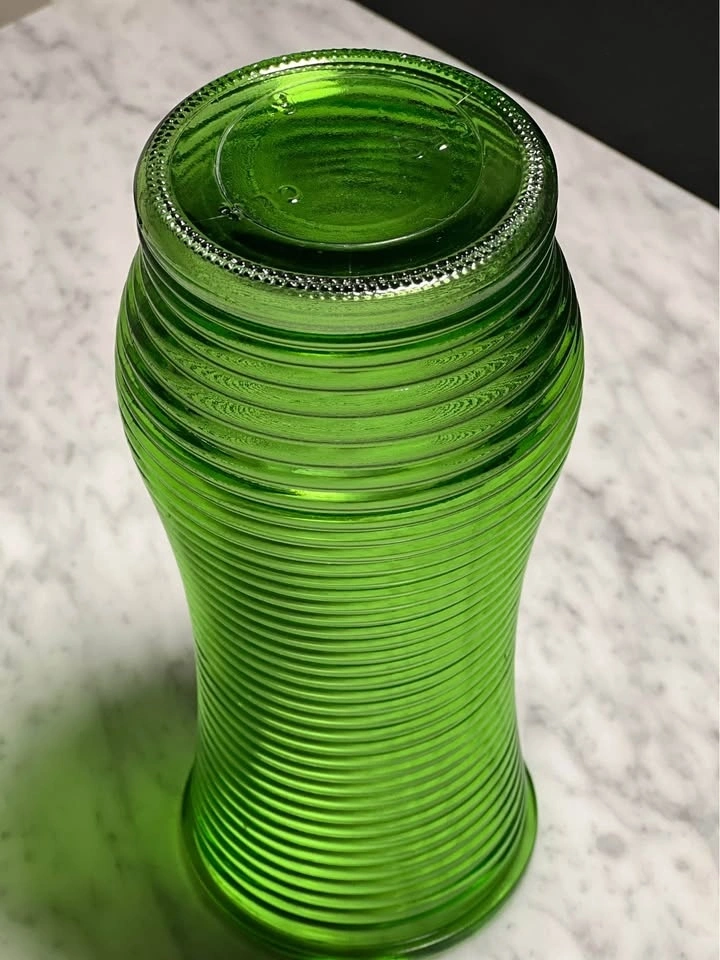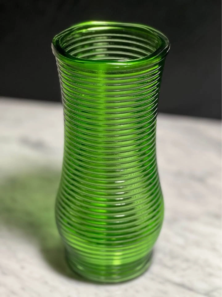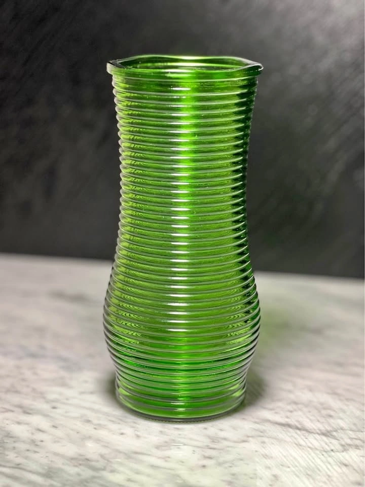 This item is a green ribbed glass vase, commonly referred to as a "vintage green glass vase with horizontal lines" or a "Hoosier Glass" vase due to its mid-century modern aesthetic and common association with the brand. It features a distinctive design with raised, horizontal ribs along its body and an emerald green, translucent finish that catches the light beautifully.