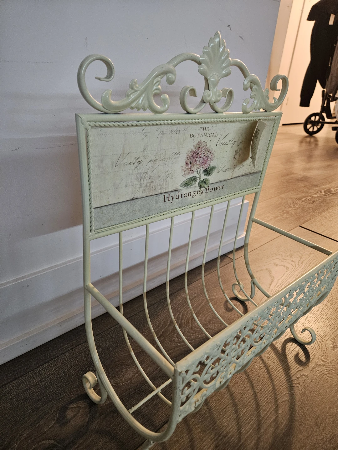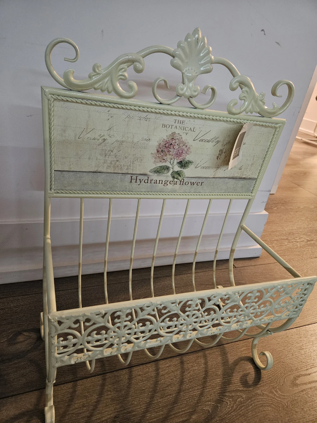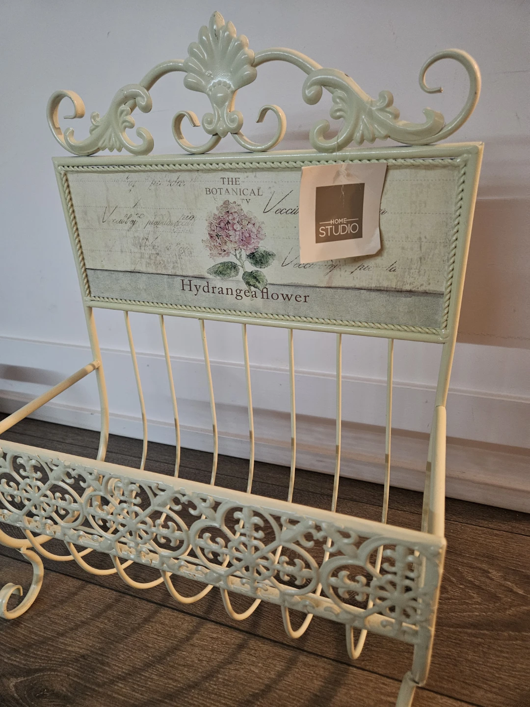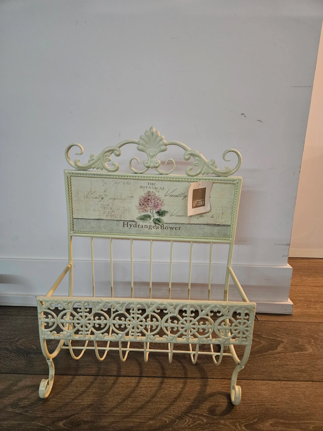 This is a lovely magazine rack from Home Studio. It features a botanical design with a hydrangea flower. It's perfect for adding a touch of vintage charm to your home decor!