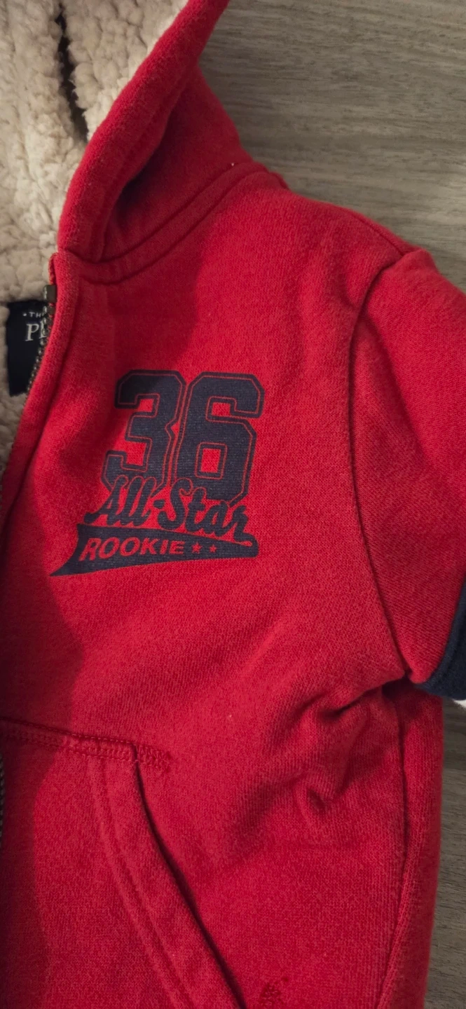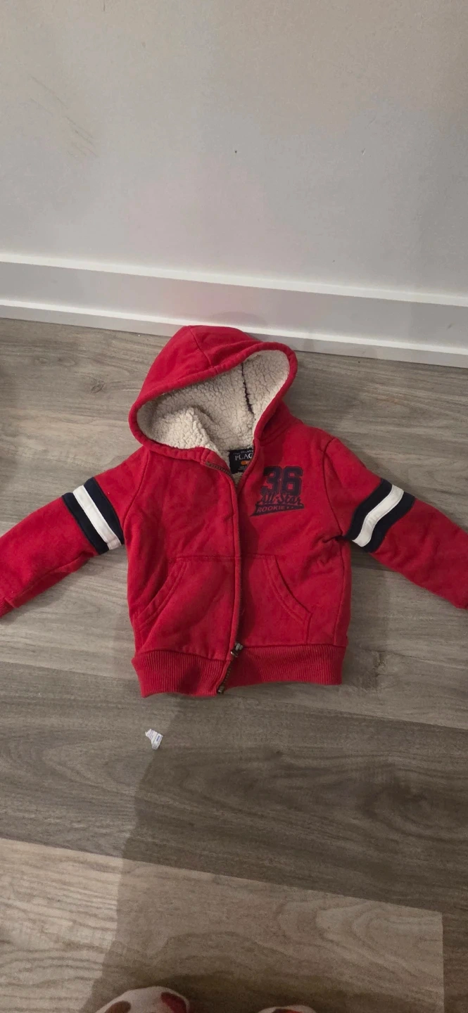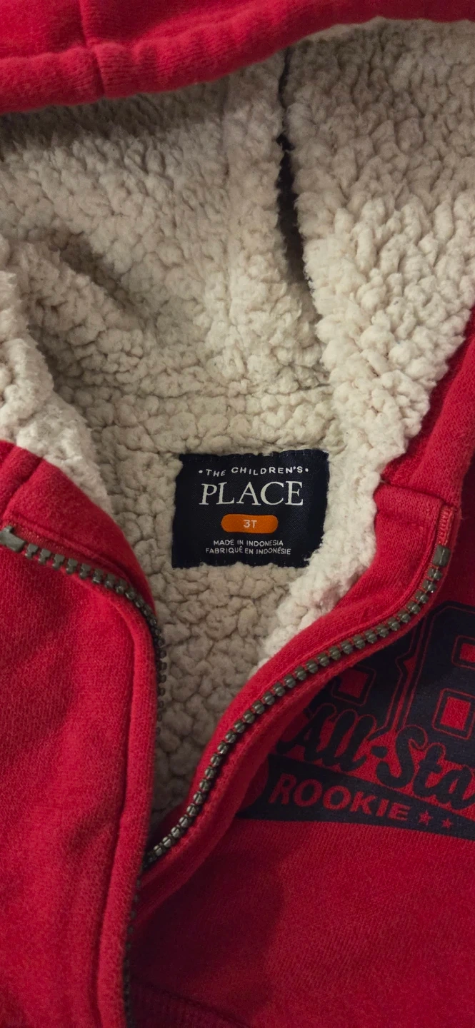 A cozy red fleece hoodie from The Children's Place, size 3T. It features a sherpa-lined hood and a sporty design with stripes on the sleeve. Perfect for keeping your little one warm and stylish!