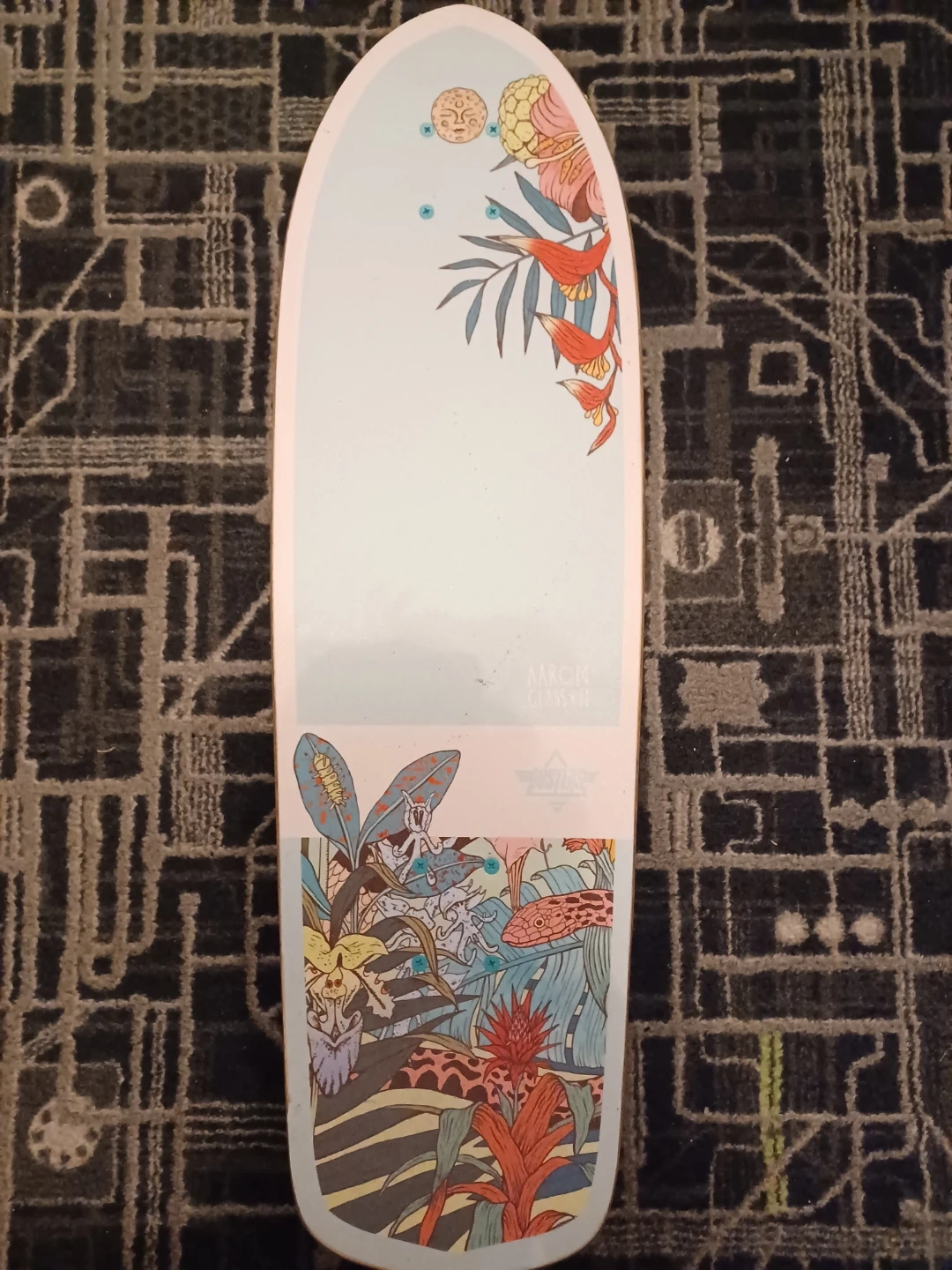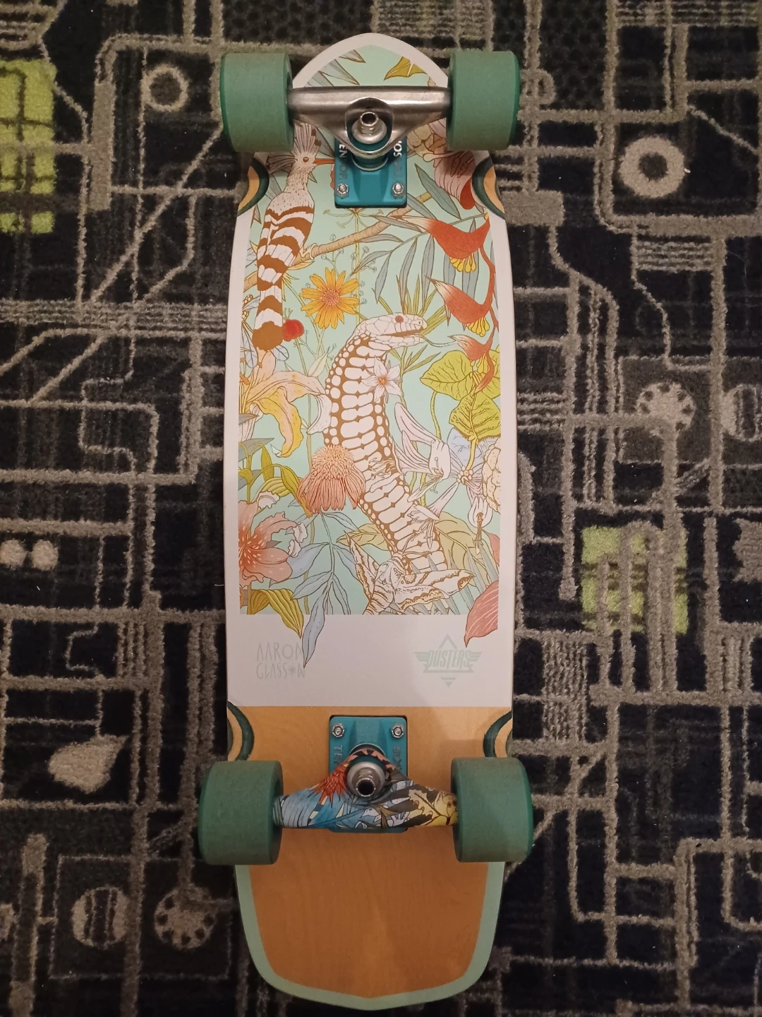 Selling a skateboard. It's in great shape and ready to ride! The deck features a unique Aaron Glasson design with beautiful floral and animal illustrations.