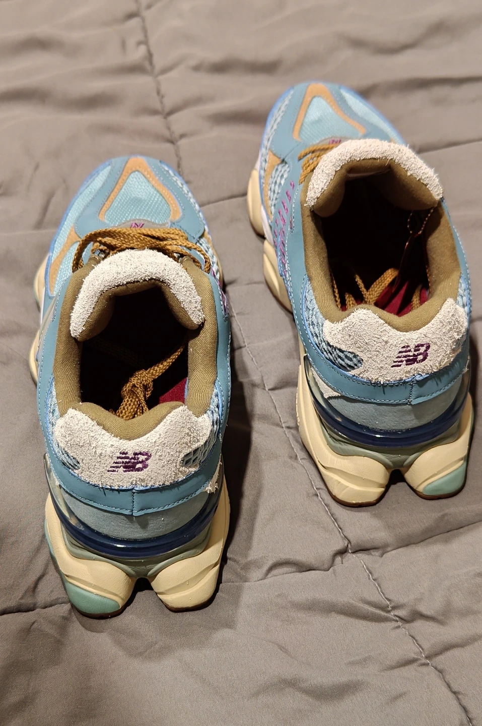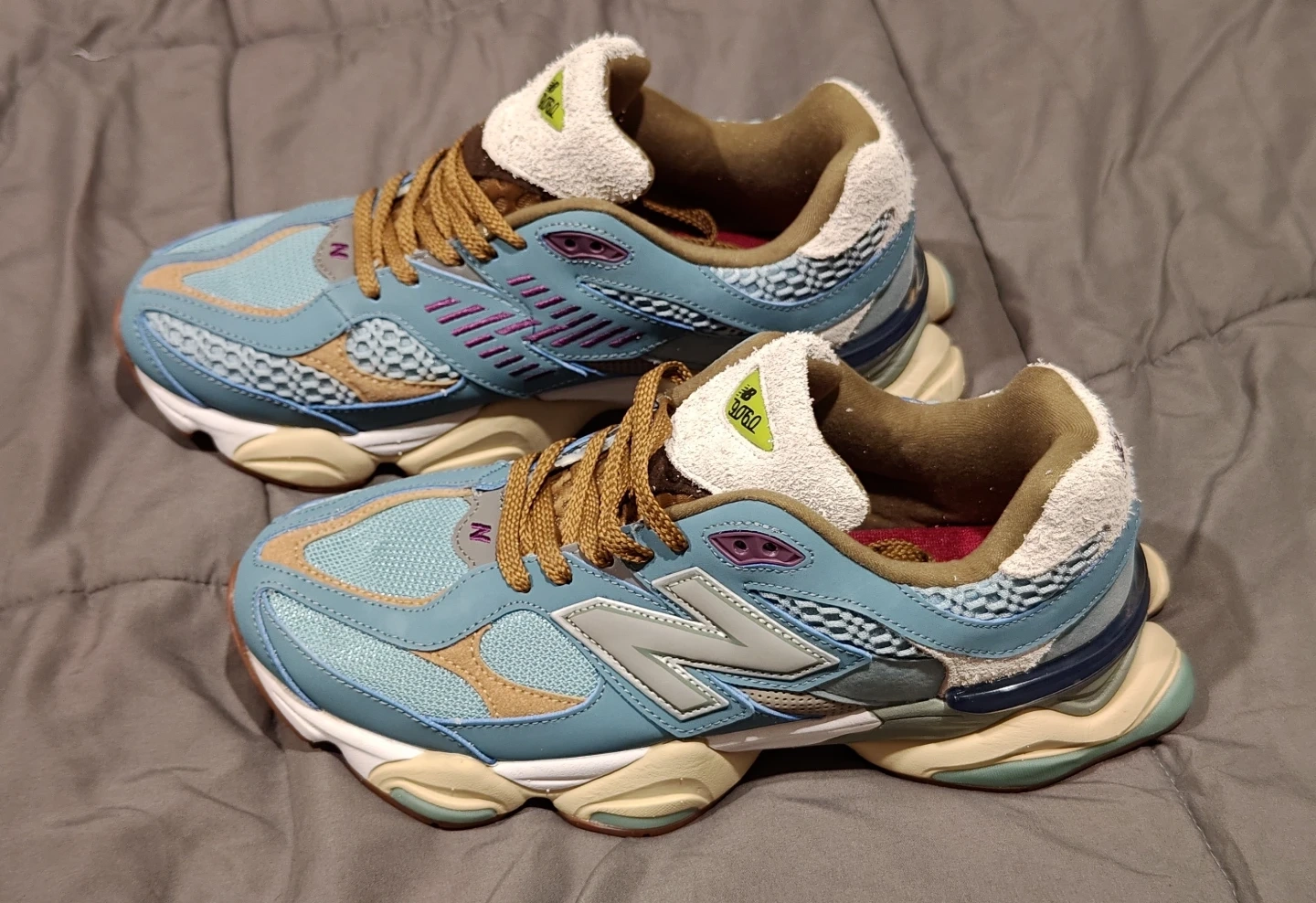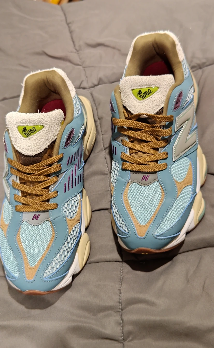 Selling a pair of New Balance 9060 sneakers! They feature a unique blend of light blue, tan, and purple accents. These stylish and comfortable shoes are perfect for everyday wear or adding a pop of color to your outfit