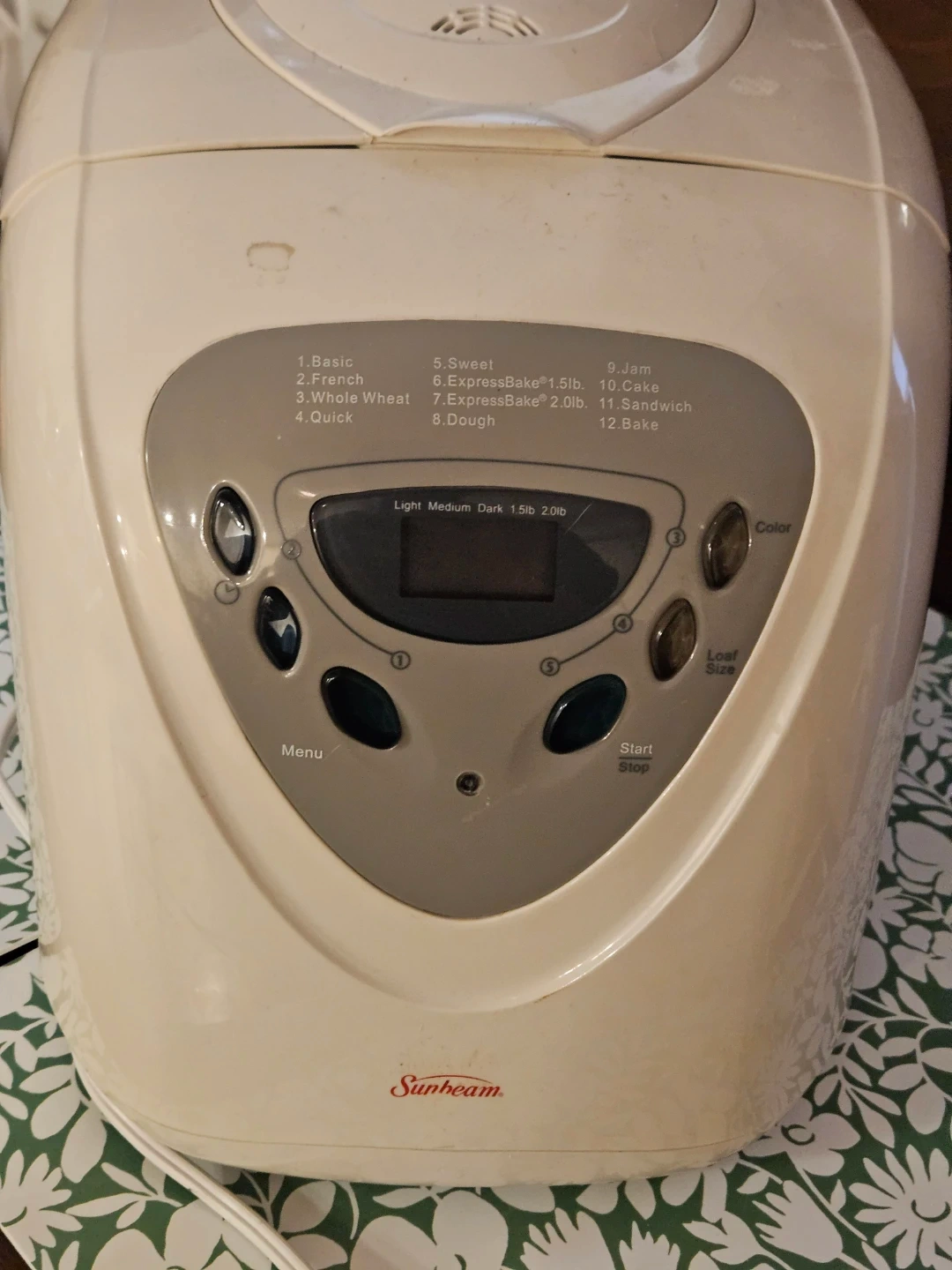 Selling a Sunbeam programmable bread maker. It has settings for basic, French, whole wheat, quick, sweet, express bake (1.5lb and 2.0lb), dough, jam, cake, sandwich, and bake. It has settings for light, medium, and dark crusts, and loaf sizes of 1.5lb and 2.0lb
