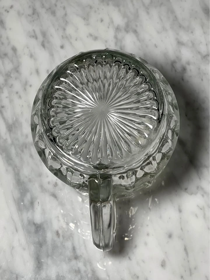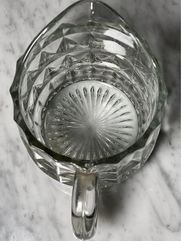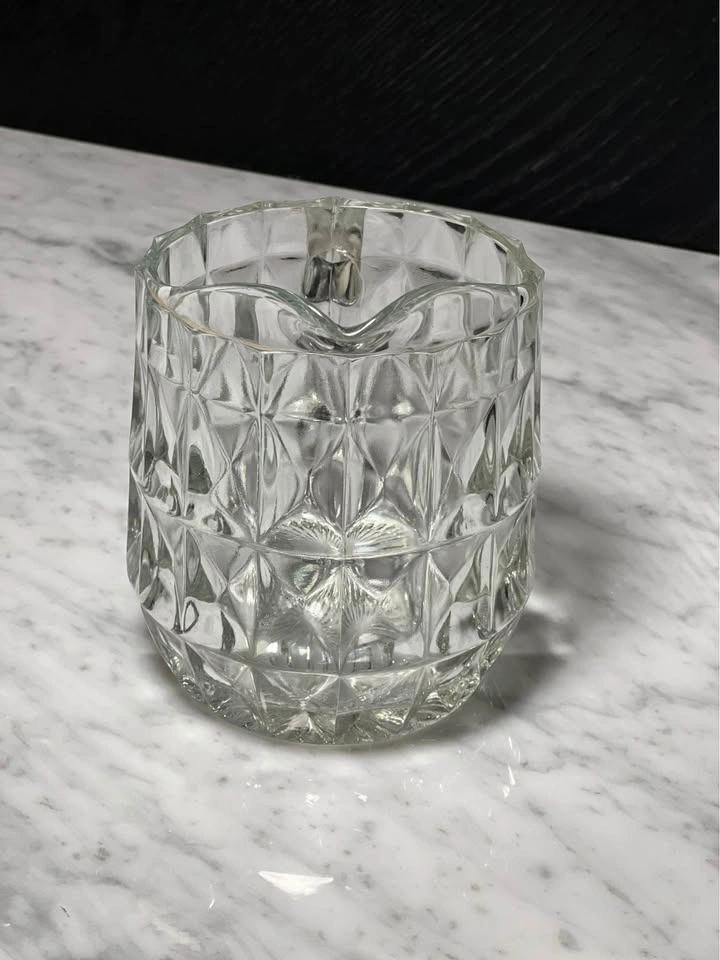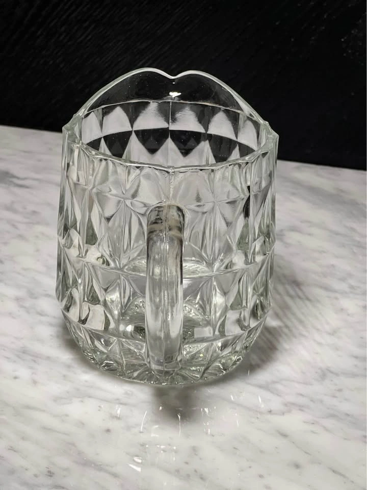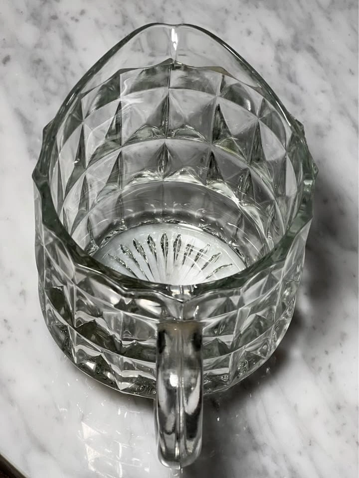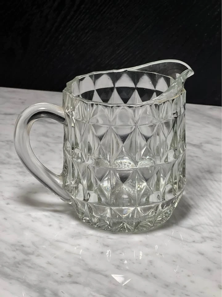 This is a Jeannette Glass Windsor Diamond pattern clear glass pitcher. It was produced by the Jeannette Glass Company as part of the Depression Glass era, typically between 1936 and 1946. The pitcher has a distinctive all-over inset diamond pattern. It typically holds around 16 ounces (2 cups) of liquid and stands about 4 7/8 inches high.